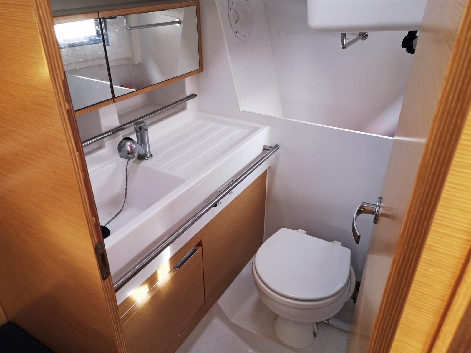 Salle de bain tribord avec lavabo, toilettes électriques et douche