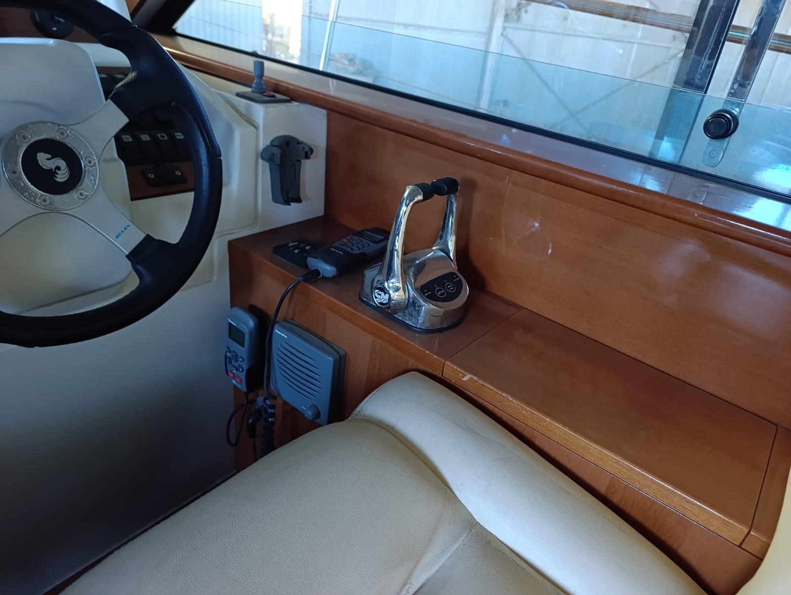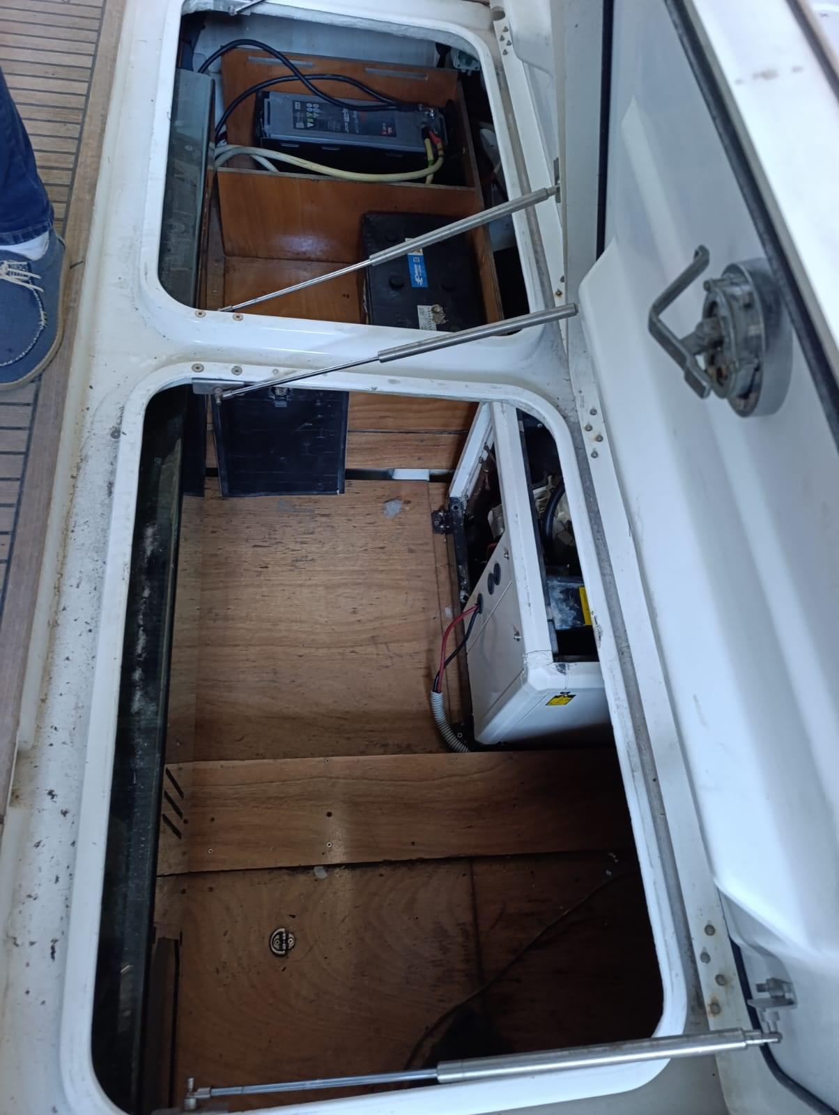 Alarme moteur, Eau sous pression, Batteries (nuove), Filères (teak), Douche de cockpit (CALDA E FREDDA), Double barre à roue, 2 Flaps hydrauliques, Indicateurs de flaps, Passerelle, Plateforme arrière (TEAK), Pompe de cale automatique, Porte latérale, Cockpit en teck, Onduleur, Guindeau électrique, Echelle de bain, Corne.