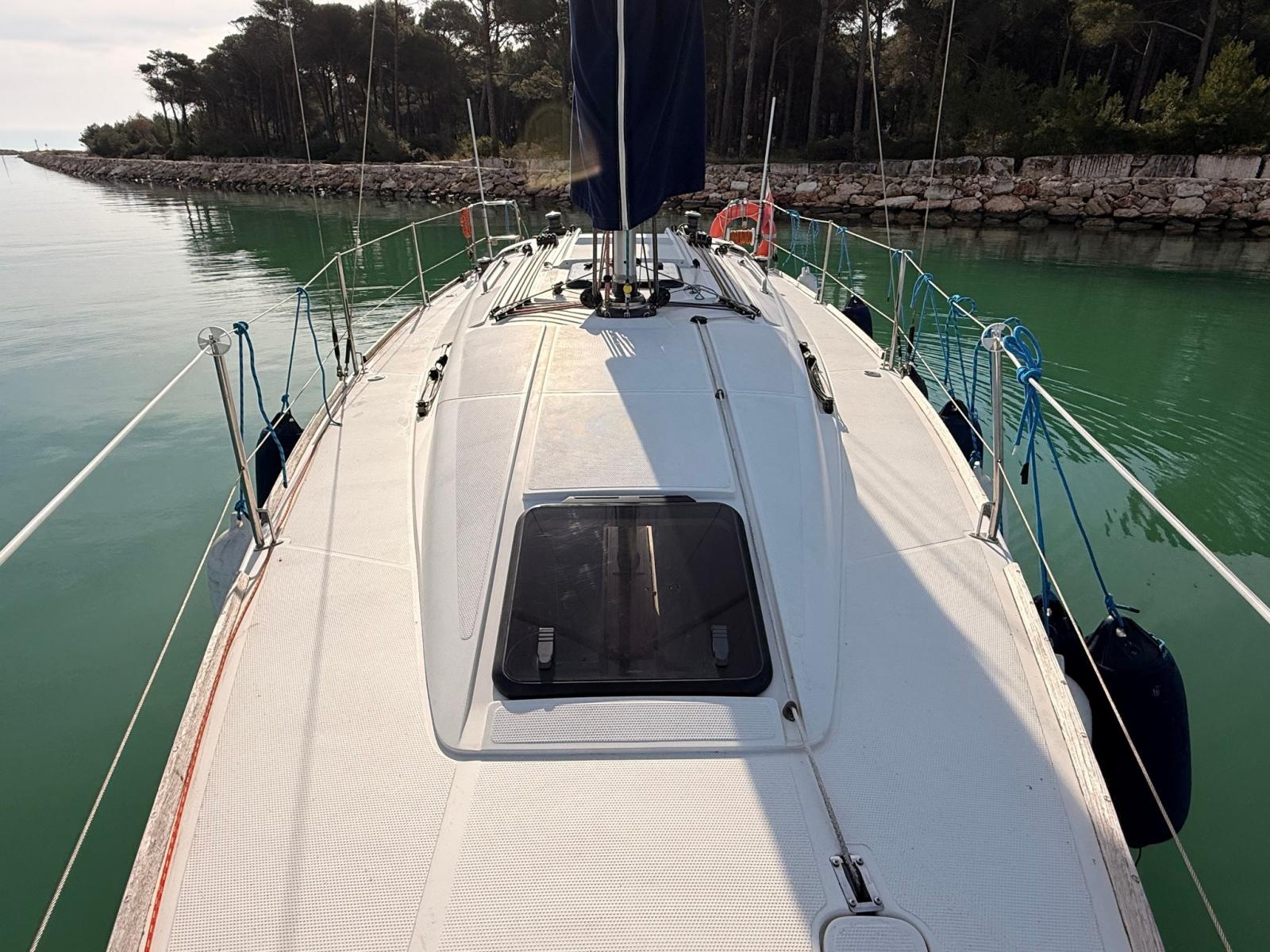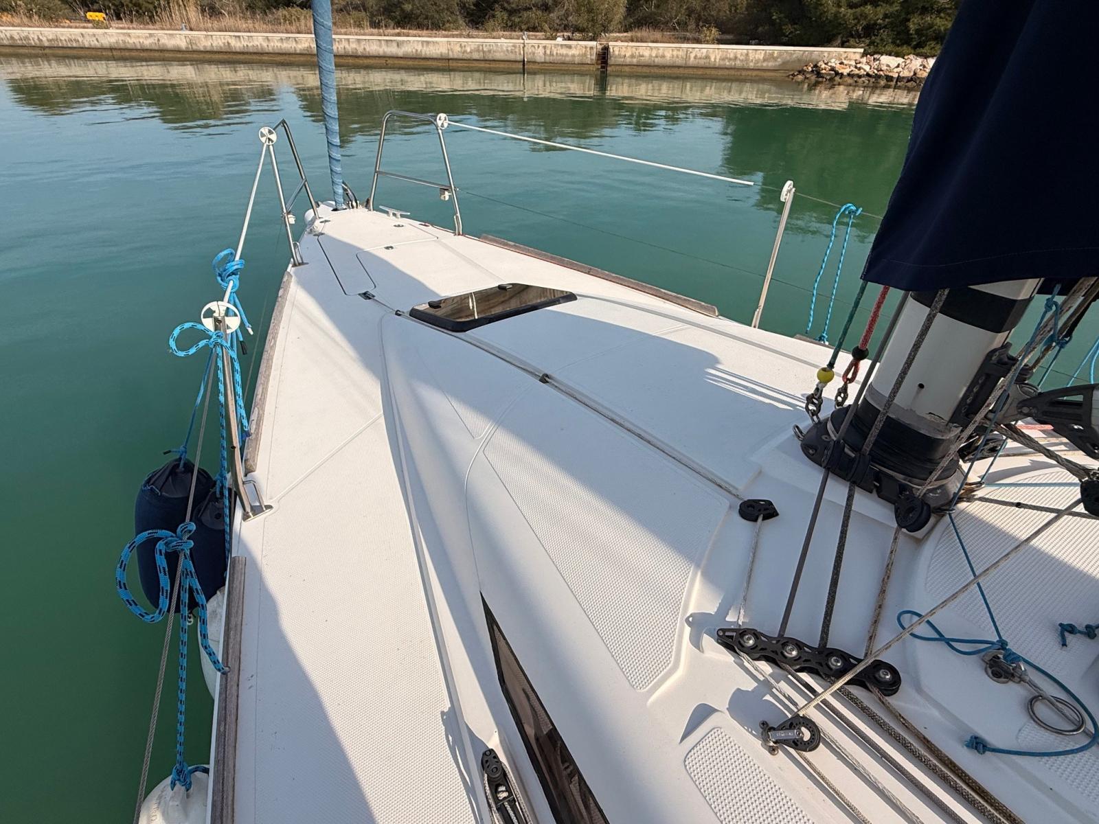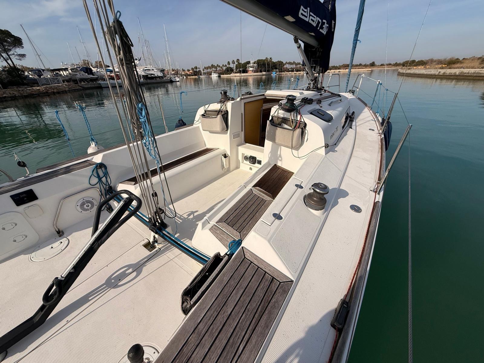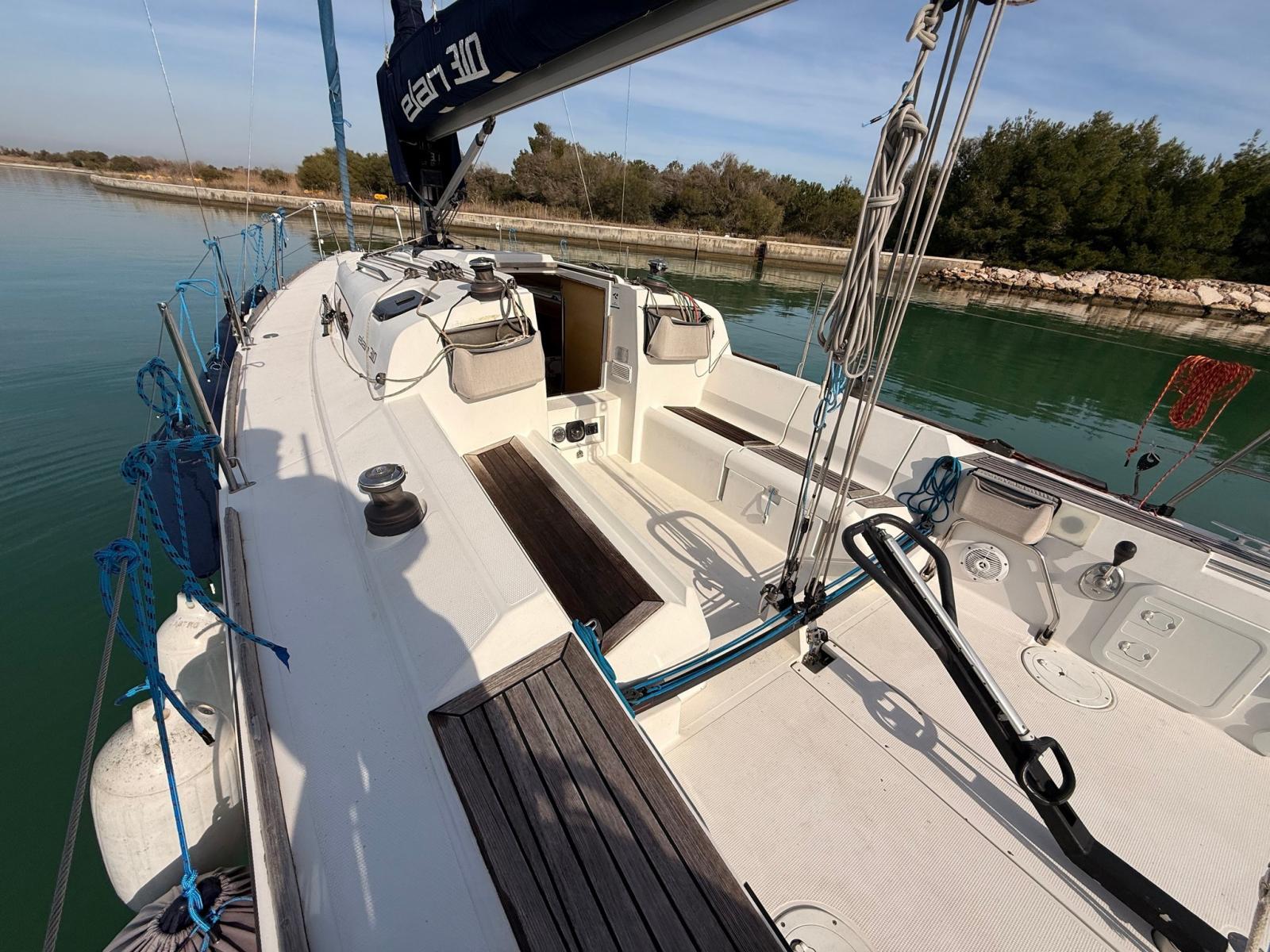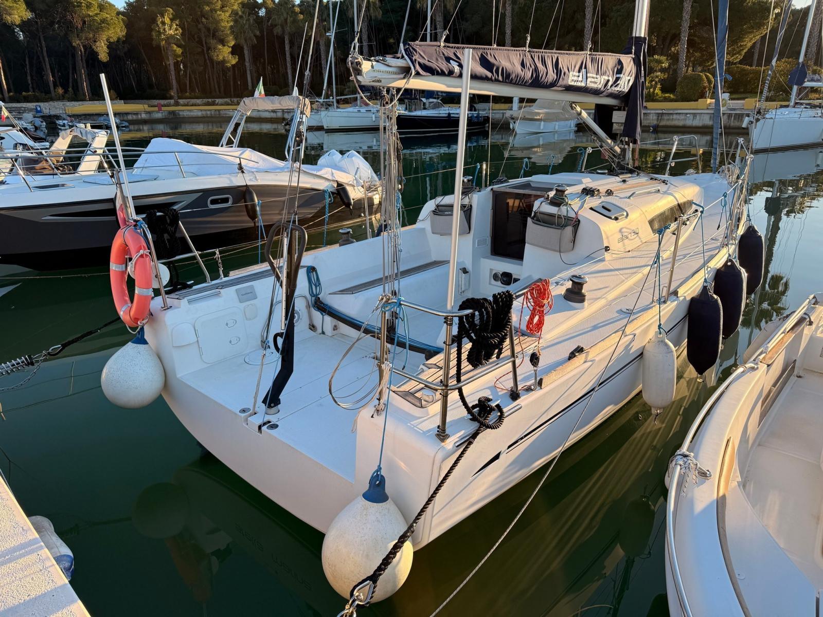 Eau sous pression, Batteries (3x70 Ah), Câble d’alimentation à quai, Douche de cockpit, Défenses, Pompe de cale manuelle, Porte latérale, Prise de quai, Guindeau électrique, Gréement monotoron, Echelle de bain, Winch (4x35 HARKEN).