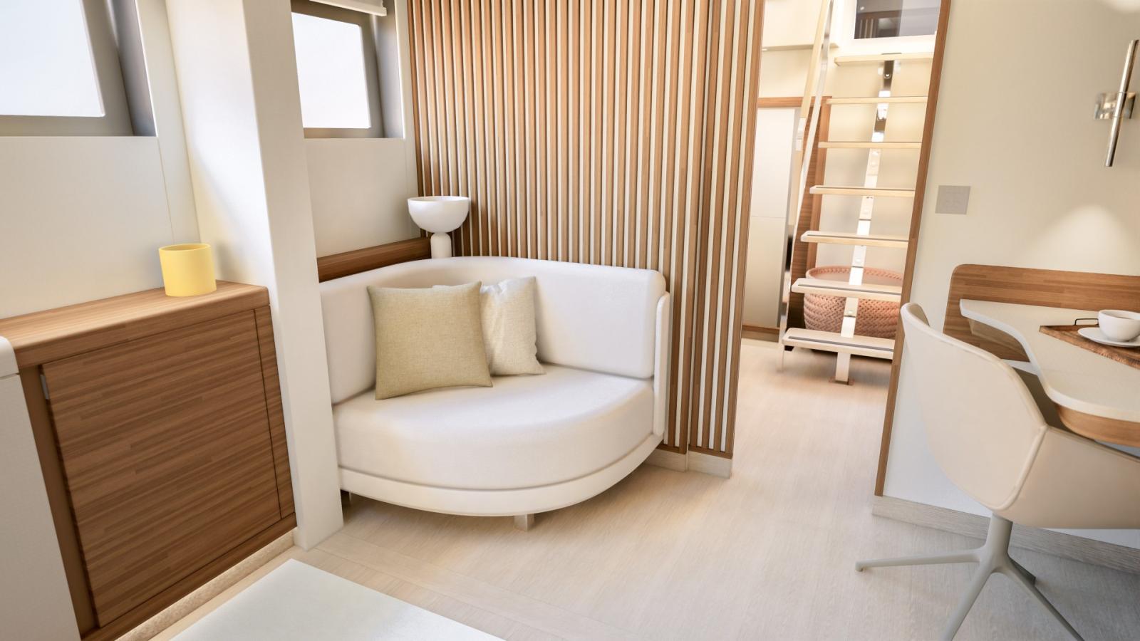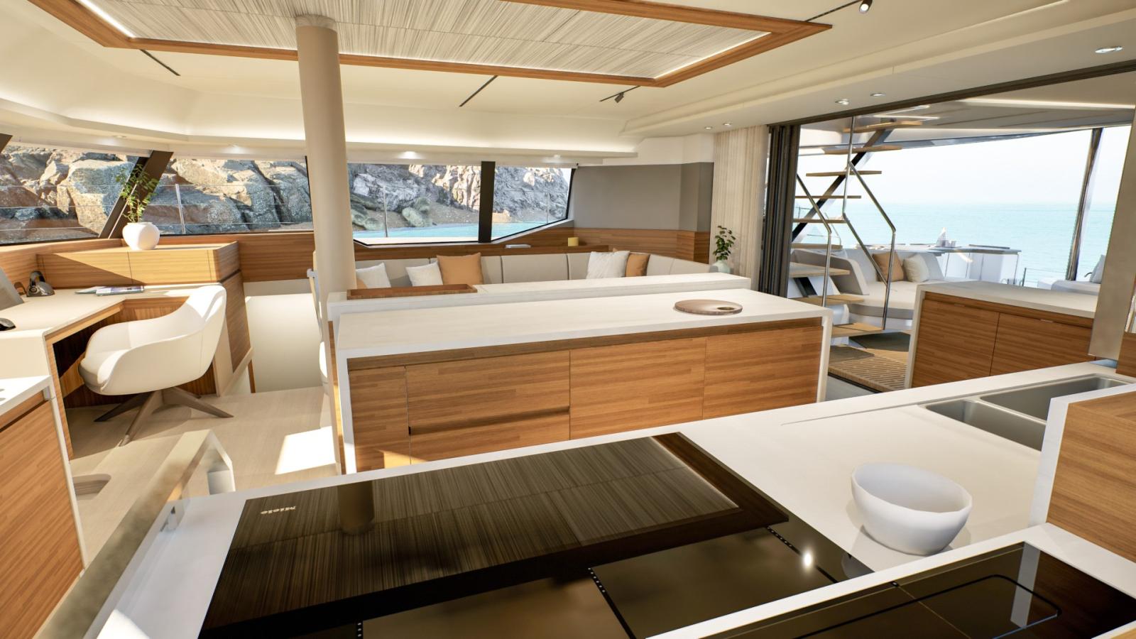 À l’arrière, le beach club devient un véritable espace de loisirs : solarium, plateforme de bain hydraulique et larges rangements pour les équipements nautiques. Chaque détail est pensé pour faire de la mer un espace de vie à part entière.