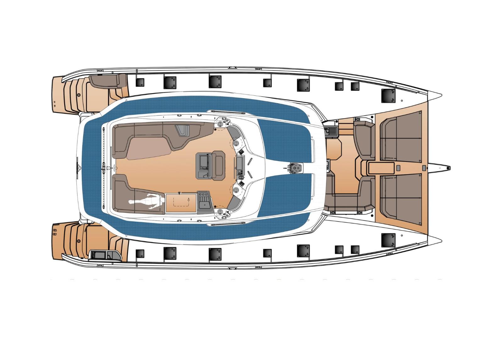 Son flybridge spacieux, doté d’un poste de barre centralisé regroupant toutes les manœuvres, garantit une vision panoramique à 360° et un confort de navigation remarquable. Pour sa catégorie, le FP | 55 se distingue également par la possibilité d’intégrer deux suites propriétaires identiques, réparties dans chaque coque, tout en conservant deux cabines équipage indépendantes et parfaitement aménagées.