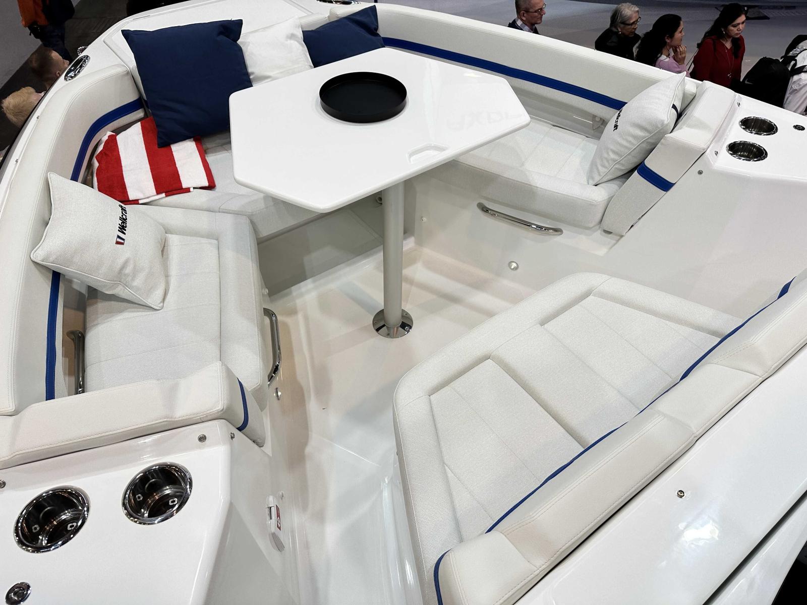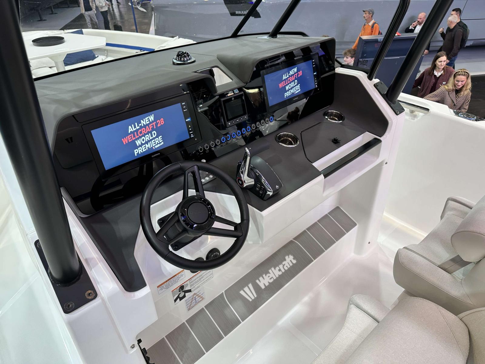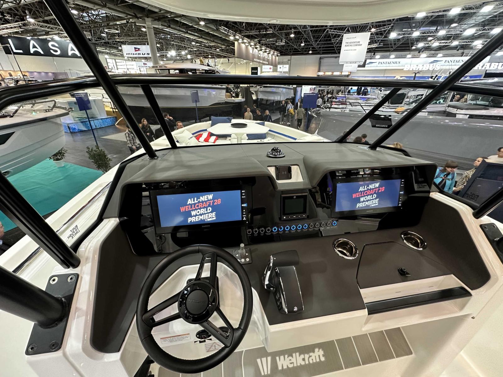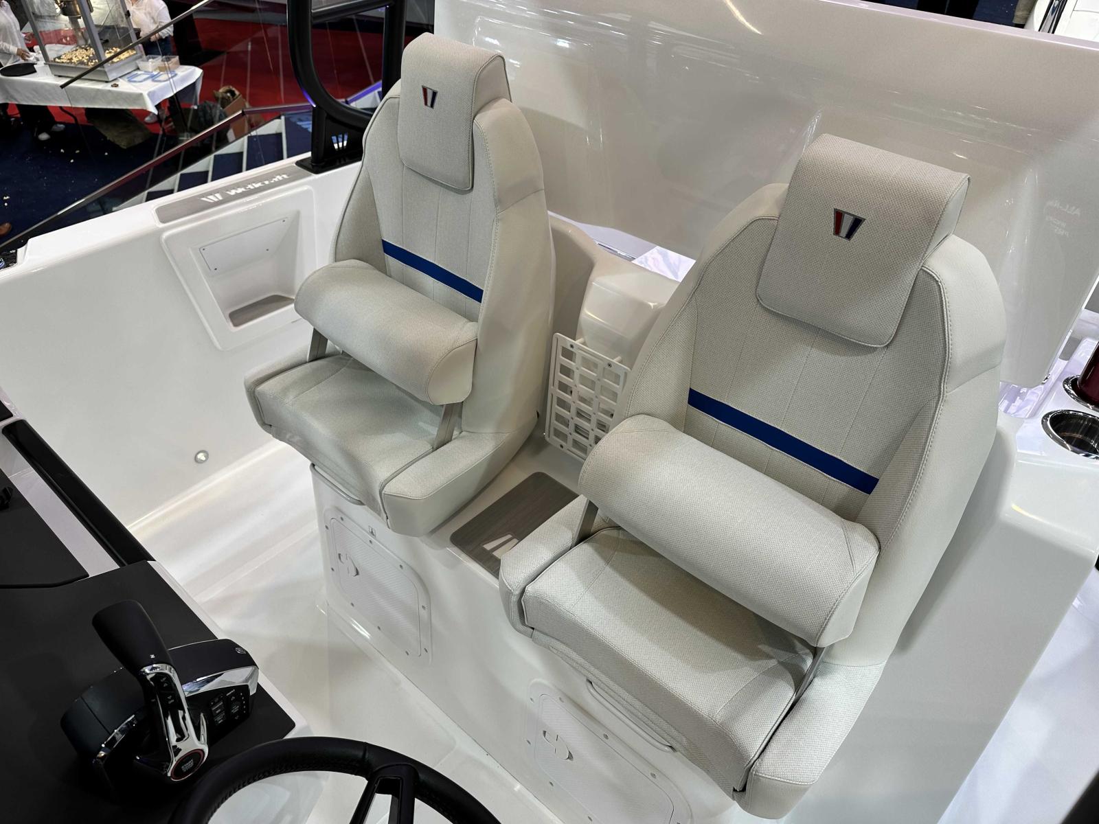 Wellcraft 28 T-Top coque bleue, Mercury 300 XXL V8 blanc, T-Top avec pare-brise haut, sellerie de cockpit Desert, finition Première, pack cabine avant, pack eau douce, pack ancre, pack électronique Garmin, pack audio Fusion, 2 taquets centraux additionnels, housse de protection, mât de ski amovible, table avant et coussin Desert, propulseur d’étrave, 2 barres LED sur T-Top, BBQ gaz, réfrigérateur 51 L, flaps électriques et toit manuel ouvrant.