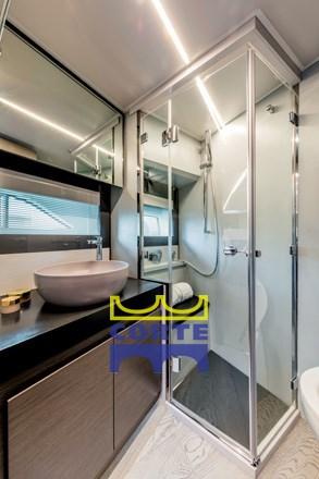 Le cockpit est équipé d’un grand bain de soleil et d’un second canapé. La zone peut être séparée ou reliée au salon grâce à un système spécial d’ouverture et de fermeture de la porte vitrée et de la surface vitrée qui divise ces deux zones.