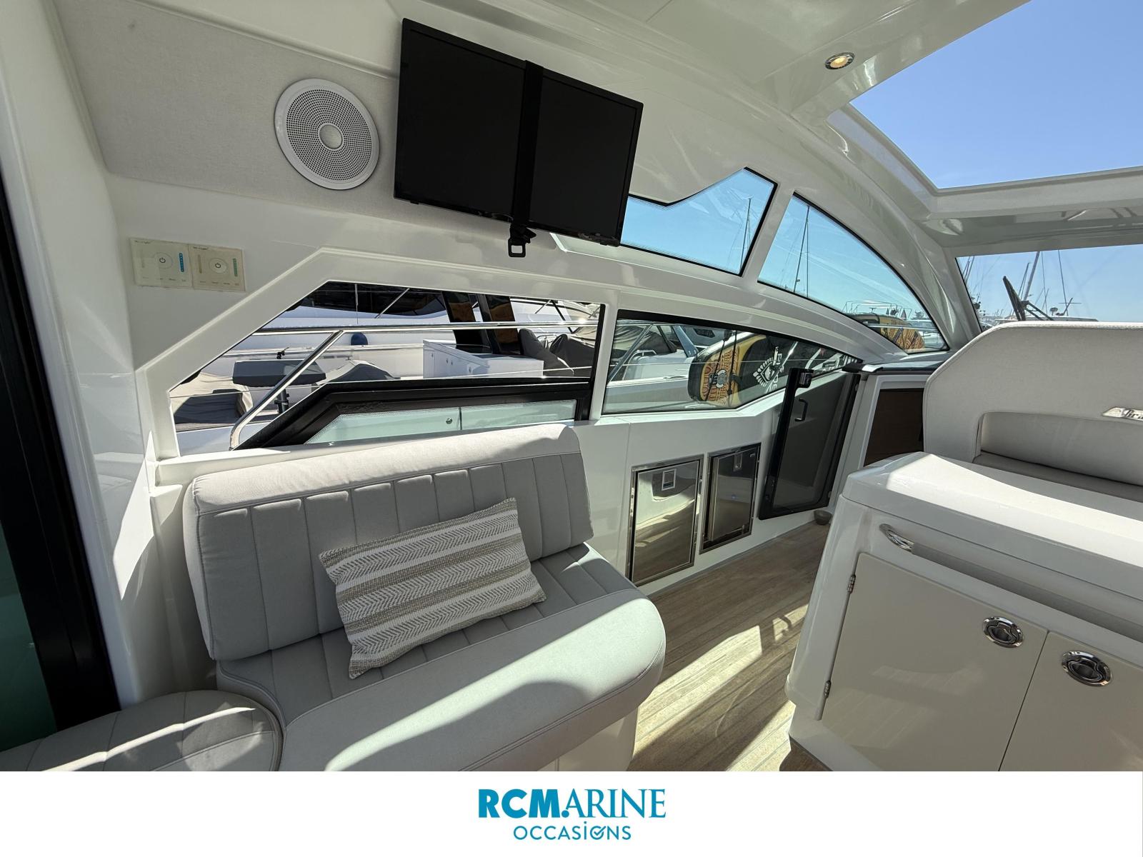 Avec sa silhouette sportive et racée, le Gran Turismo 46 combine un hard-top totalement ouvrant, des vitrages latéraux électriques et une large porte vitrée ouvrante qui permet d’isoler le cockpit. Alliance parfaite de protection et d’ouverture, il offre deux possibilités d’aménagement du pont : cuisine à l’arrière ou cuisine dans le cockpit.