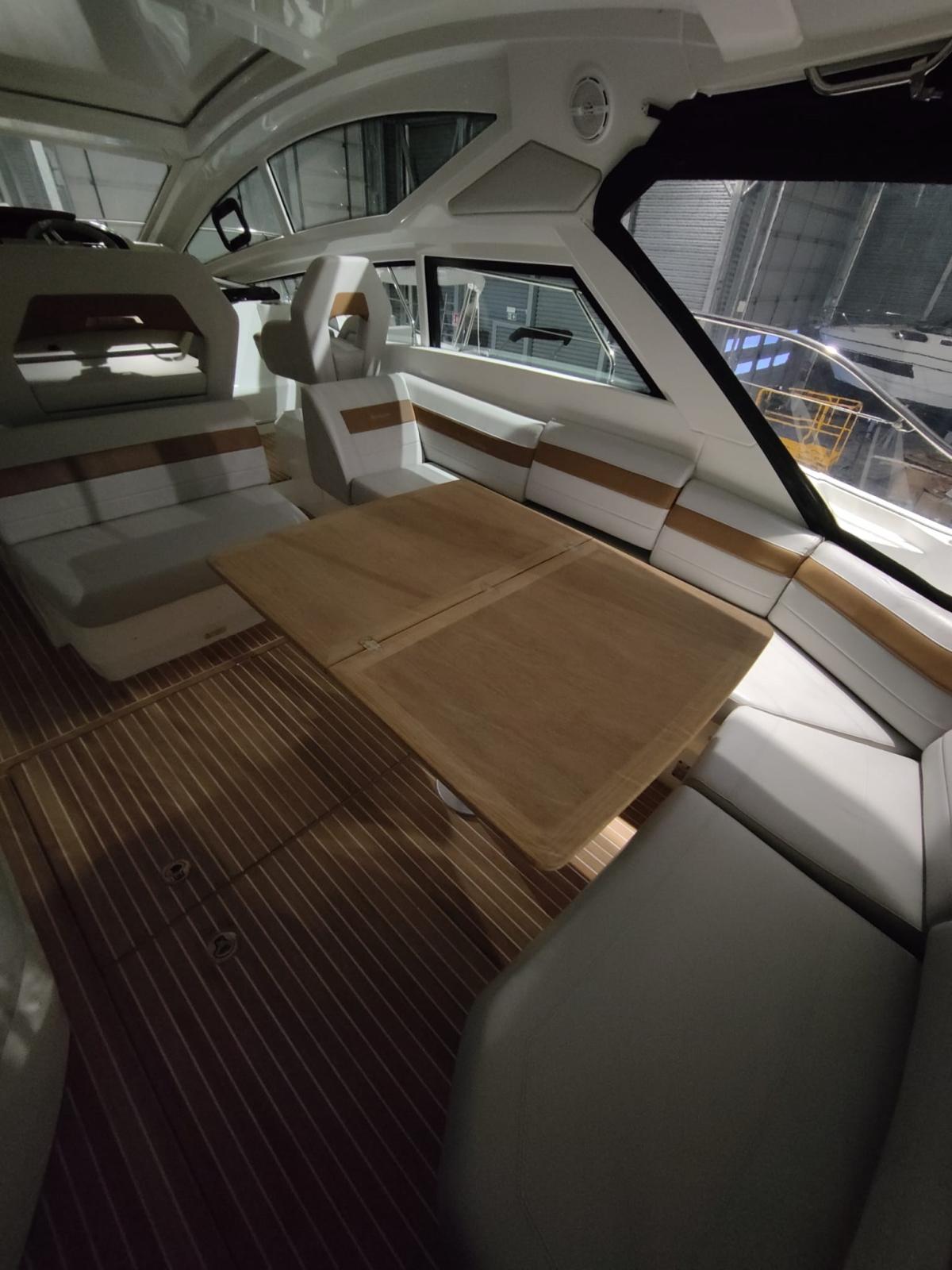 Douche de cockpit, Hard top, Spots sous-marins, Cockpit en teck, Prise de quai, Guindeau électrique, Echelle de bain, table de cockpit, Table pliante de salon.