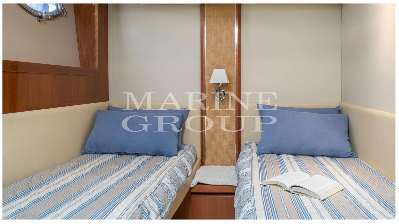 Intérieurs en bois de cerisier clair brillant ; parquet en chêne ; Grande dînette avec canapé en forme de « C » et table centrale ; Cuisine entièrement équipée en forme de « L » ; Cabine principale à l’avant avec salle de bain attenante ; Cabine arrière avec deux lits simples au sol ; Deuxième cabine arrière avec lits simples superposés ; Deuxième salle de bain avec cabine de douche.