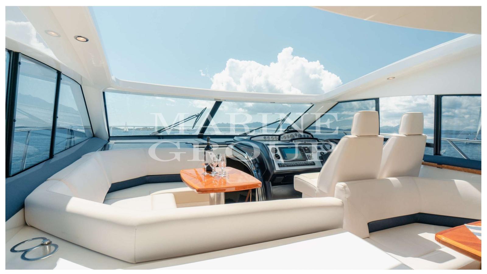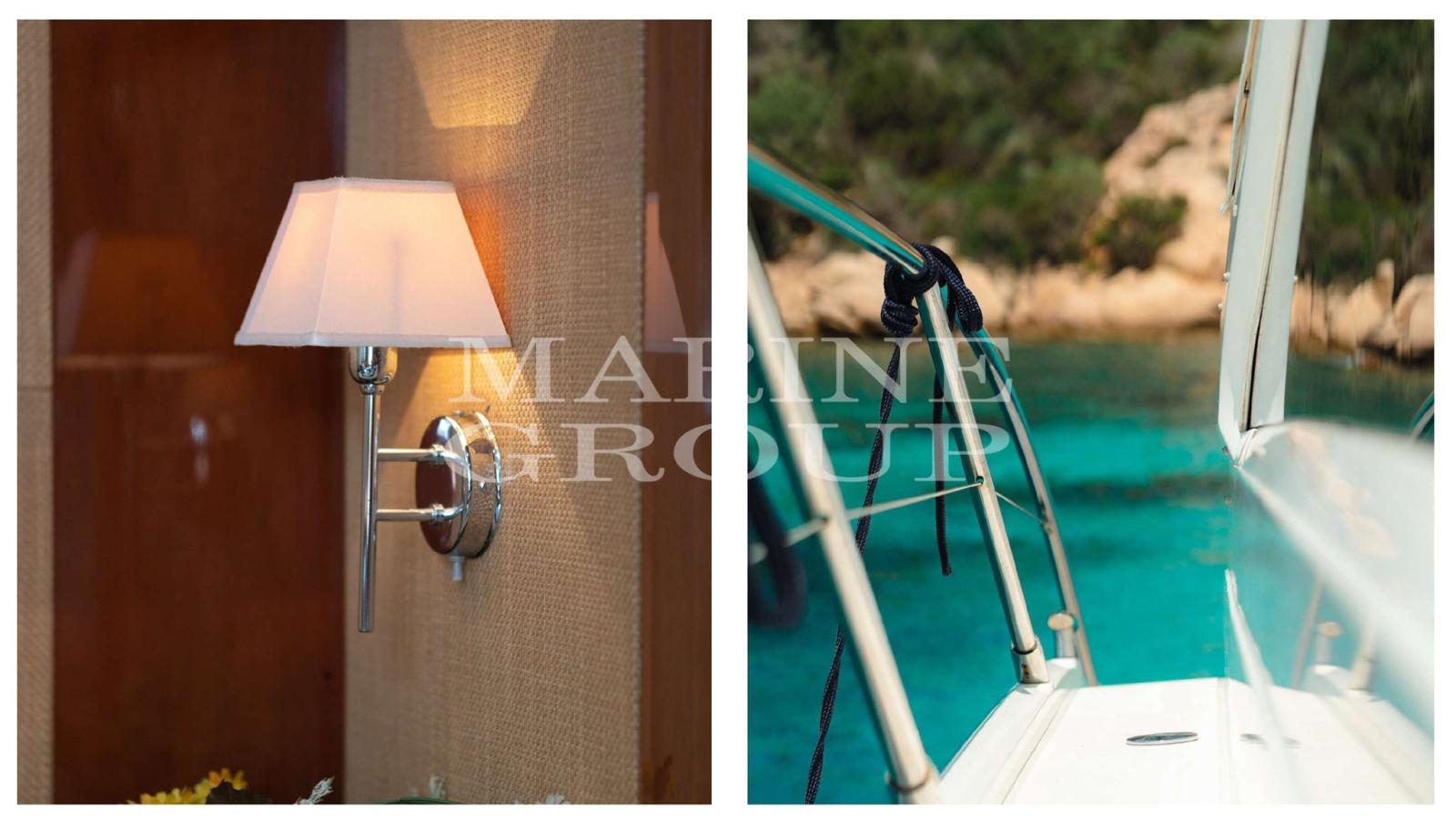 Couleur spéciale (blu), Douche de cockpit, Flaps hydrauliques, Garage à annexe, Hard top, Lavabo dans le cockpit, Éclairage de courtoisie, Passerelle, Plateforme arrière, Porte latérale, Cockpit en teck, Prise de quai, Connexion eau sous pression à quai, Guindeau électrique, Echelle de bain, table de cockpit, Corne.