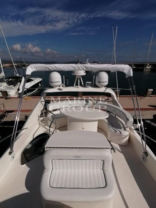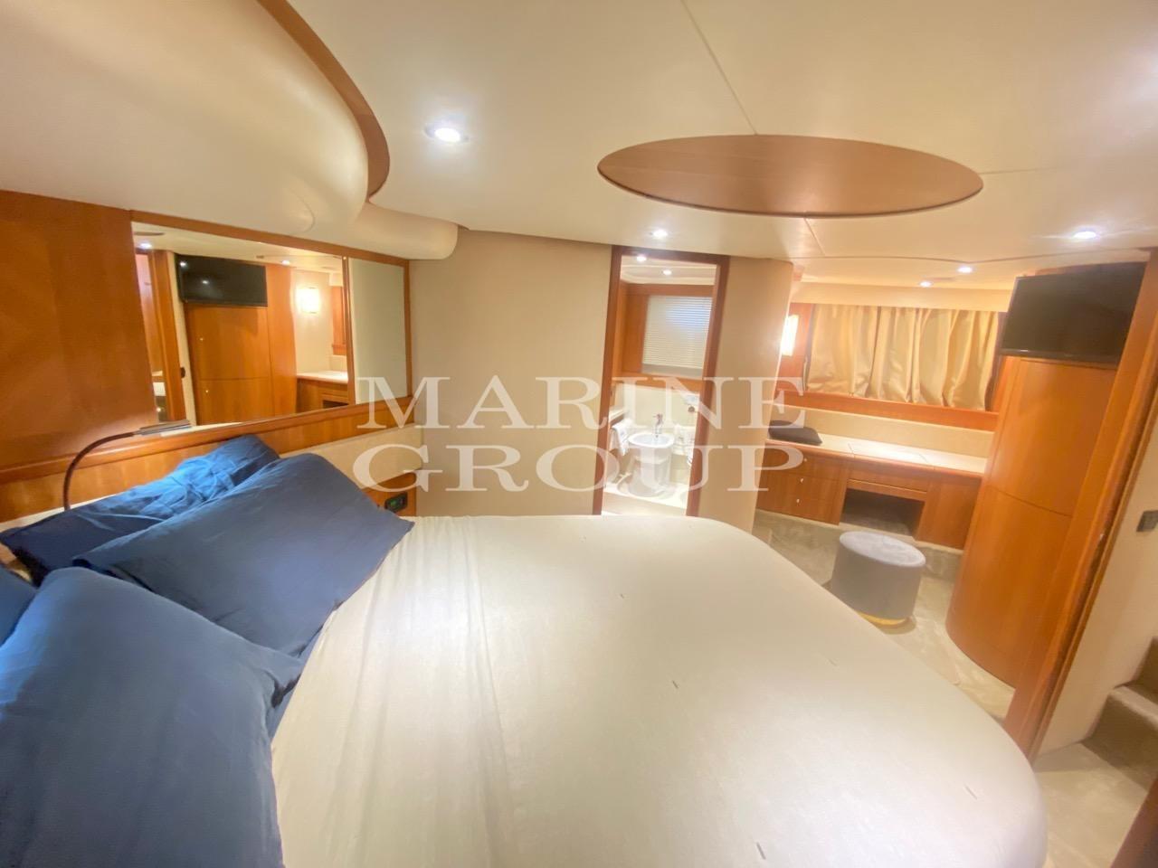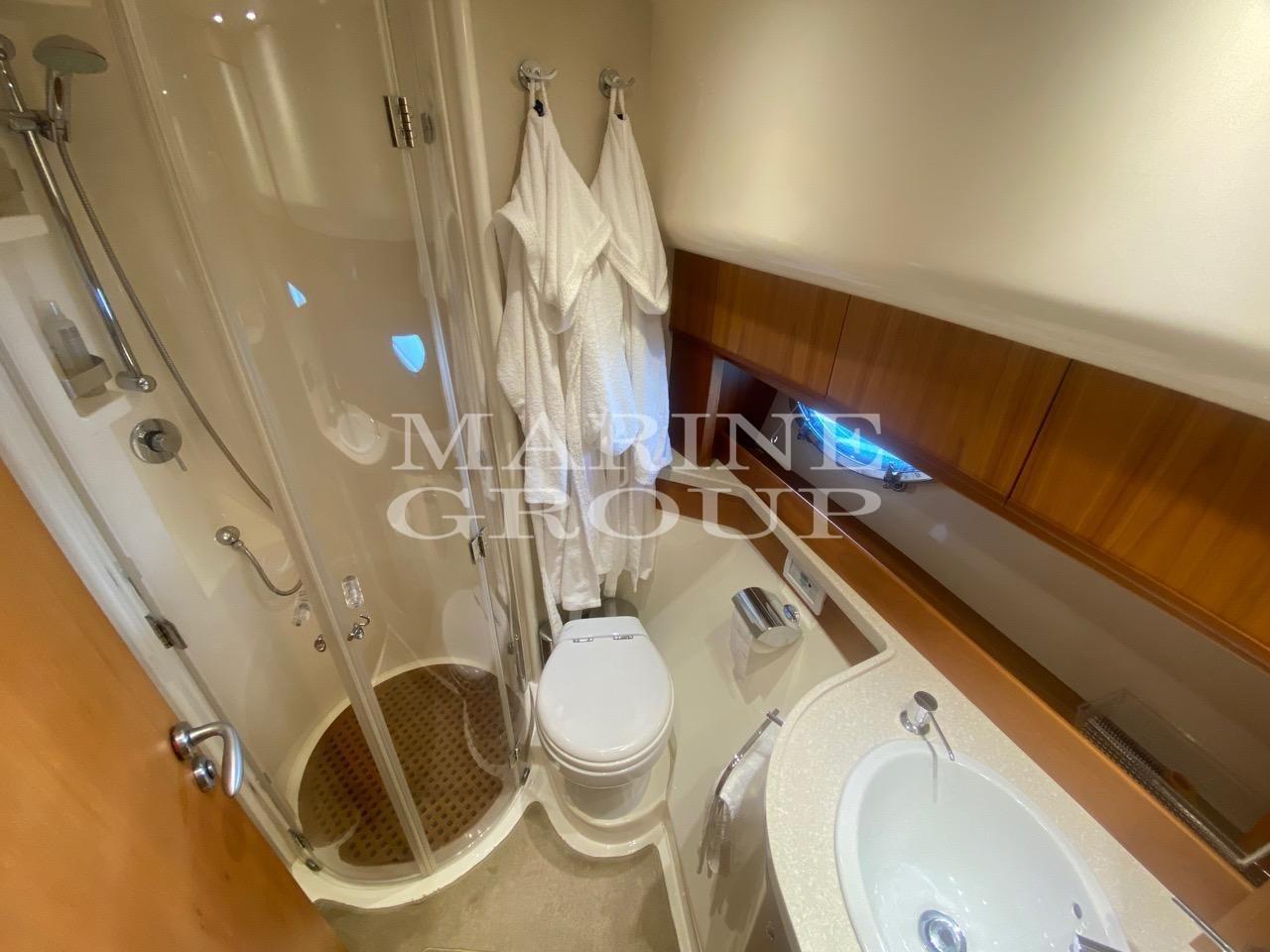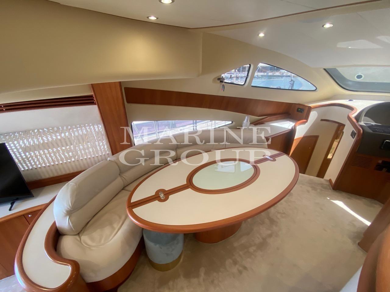 Intérieurs en bois de cerisier et moquette ; Grand canapé en cuir clair en forme de « U » avec table basse : Cuisine entièrement équipée, salle à manger avec canapé en cuir ; Cabine principale pleine largeur au milieu du navire avec salle de bain privée avec cabine de douche et bidet ; Cabine VIP à l’avant, grande et lumineuse avec salle de bain privée comprenant cabine de douche ; Cabine d’invités avec deux lits au sol convertible en une salle de bain double, troisième salle de bain complète ; Cabine marin à l’arrière avec salle de bain et entrée indépendante depuis le canapé du cockpit.