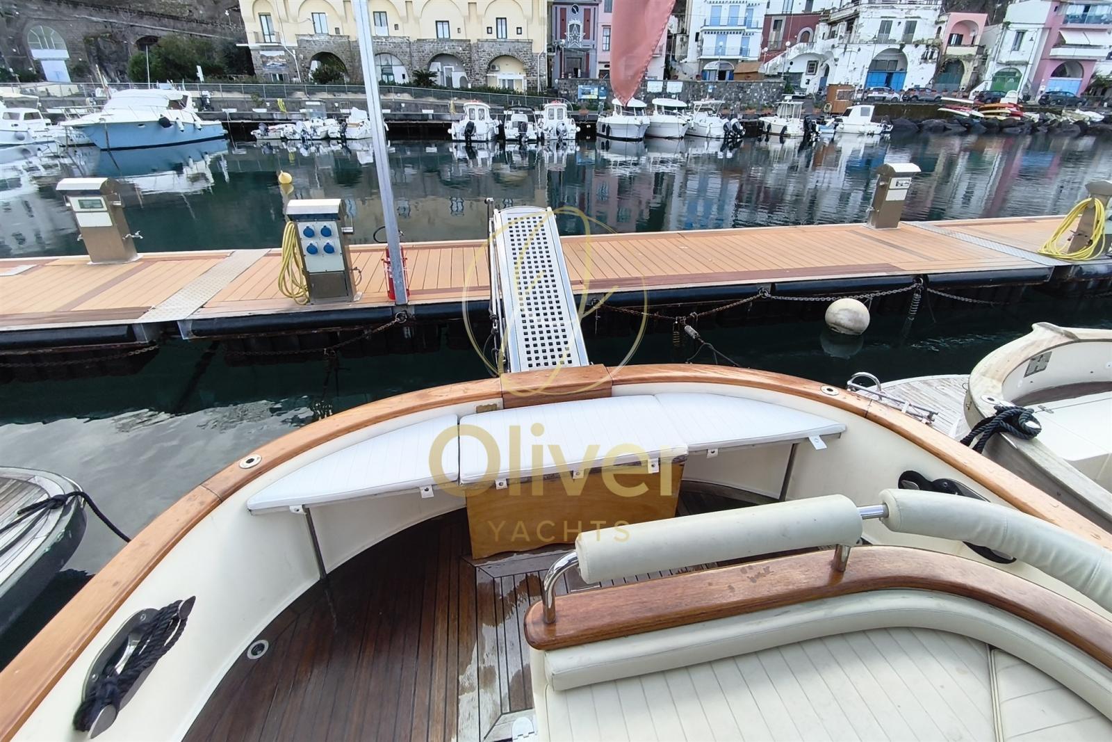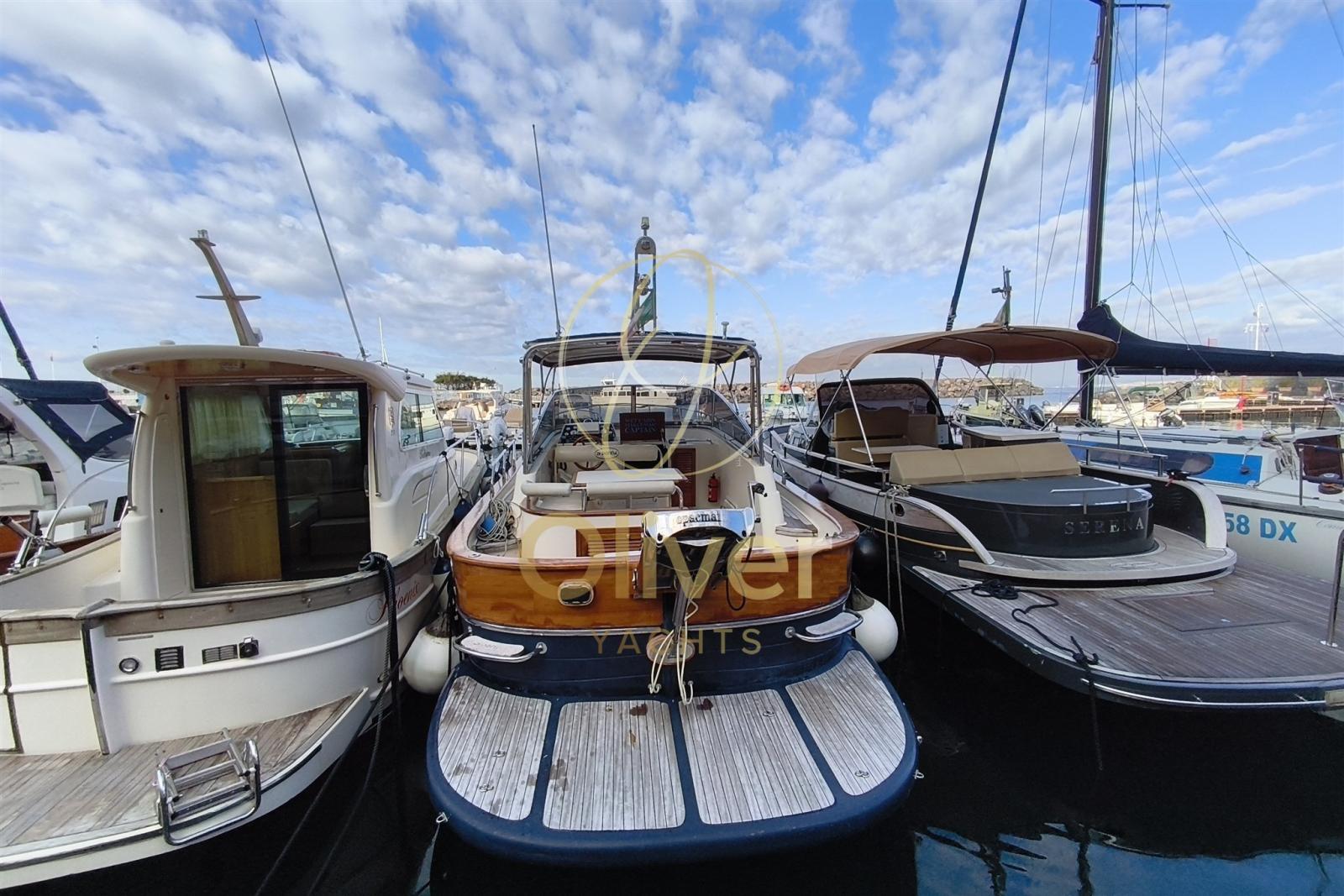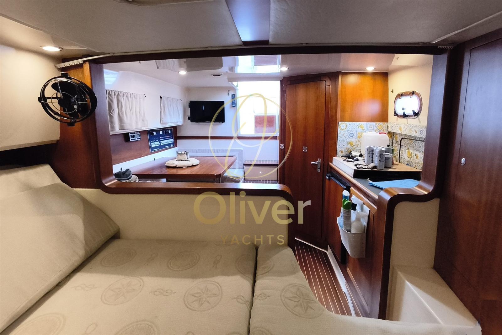 Les extérieurs sont l’une des véritables forces : le teck en bon état, bien entretenu et d’un grand impact esthétique, et surtout le splendide toit rigide fixe avec arc-choc, une option rare et très demandée. Cette configuration garantit une protection contre le soleil et le vent, améliorant considérablement le confort de navigation et l’utilisation en toutes saisons.