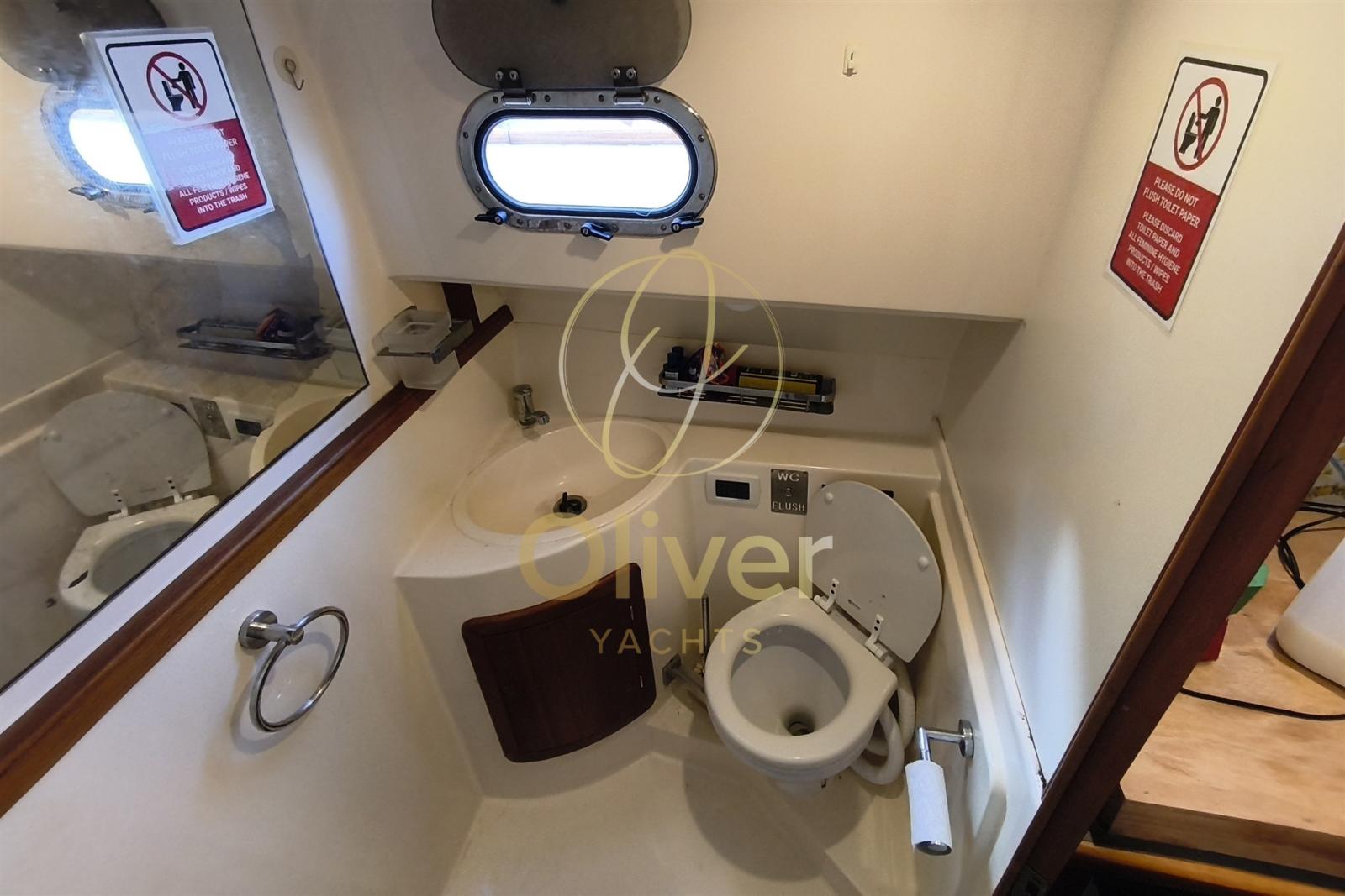 La salle de bain est une véritable force : une pièce séparée et bien organisée avec toilettes marines, lavabo, réservoir d’eau noire, un équipement indispensable aujourd’hui et souvent absent sur les bateaux de cette catégorie. La chaudière bivalente garantit l’eau chaude en mer comme sur le quai, augmentant ainsi le confort à bord.