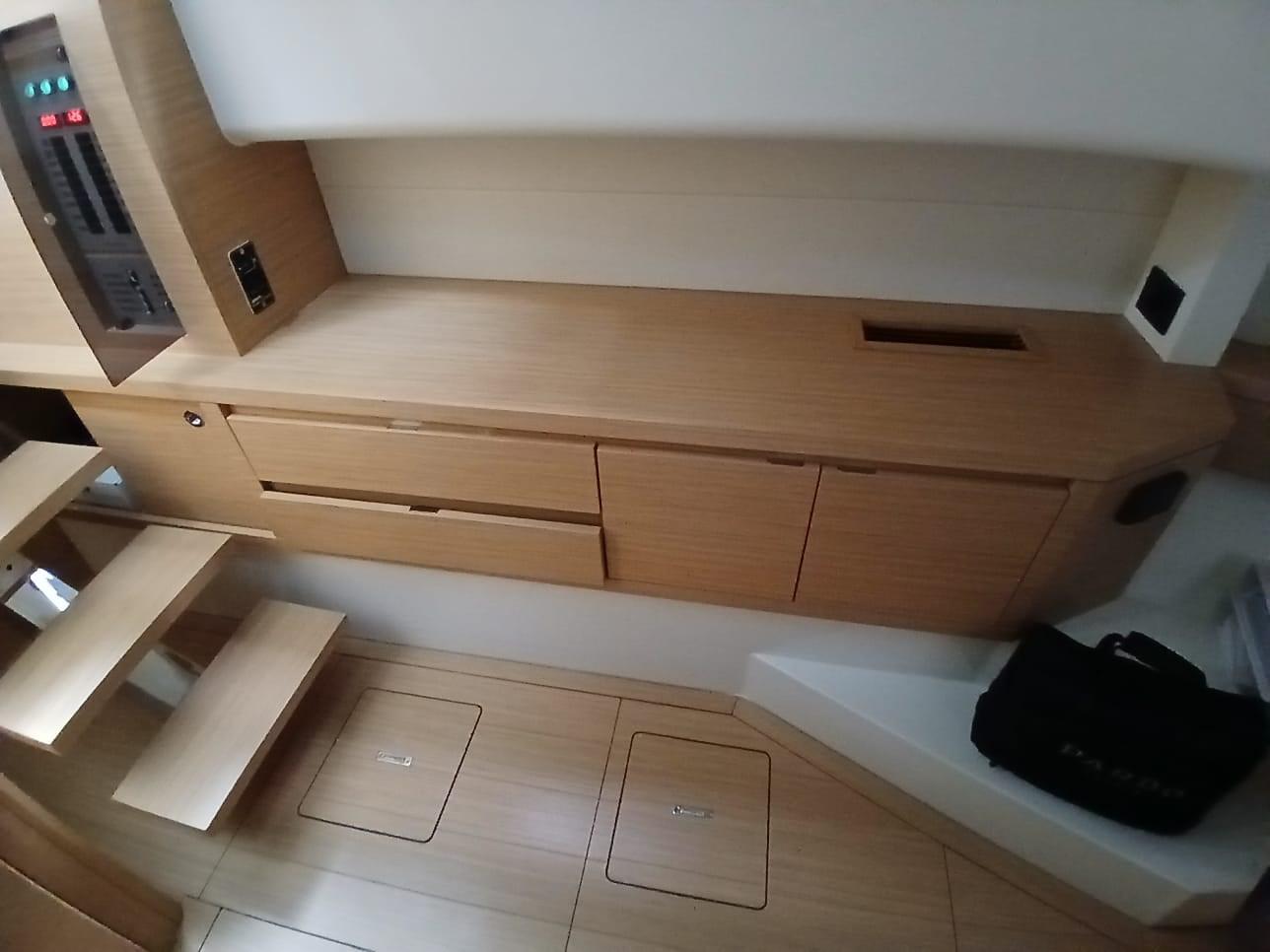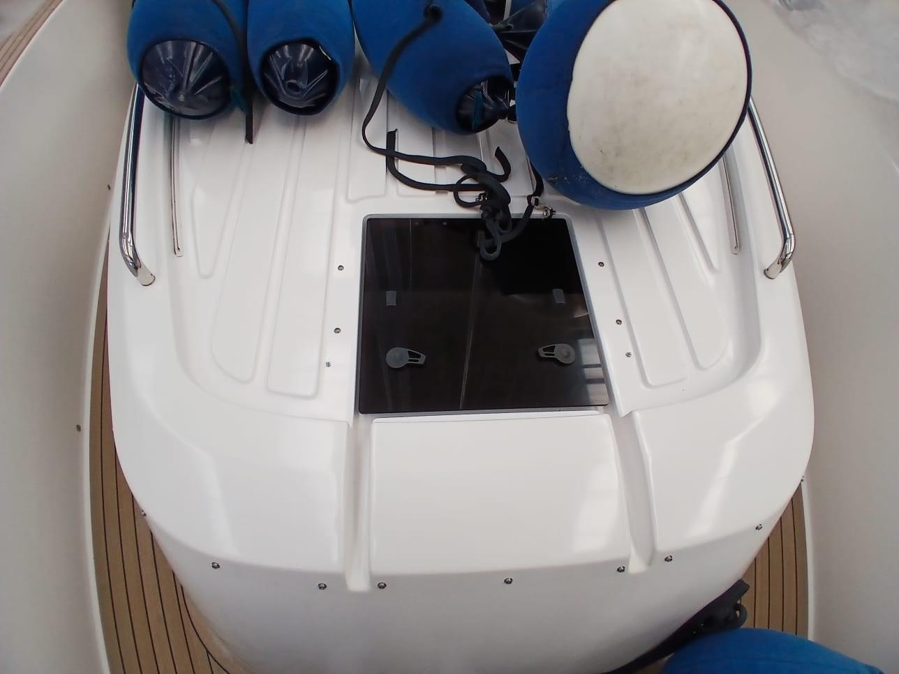 Pont : Cockpit en teck et bérangs, propulseur d’étrave, volets, stabilisateur, treuil électrique avec télécommande, échelle de nage, coussins à la proue et à la poupe, toit bimini, auvent, couvercle de tableau de bord, bâche d’hiver, douche extérieure.