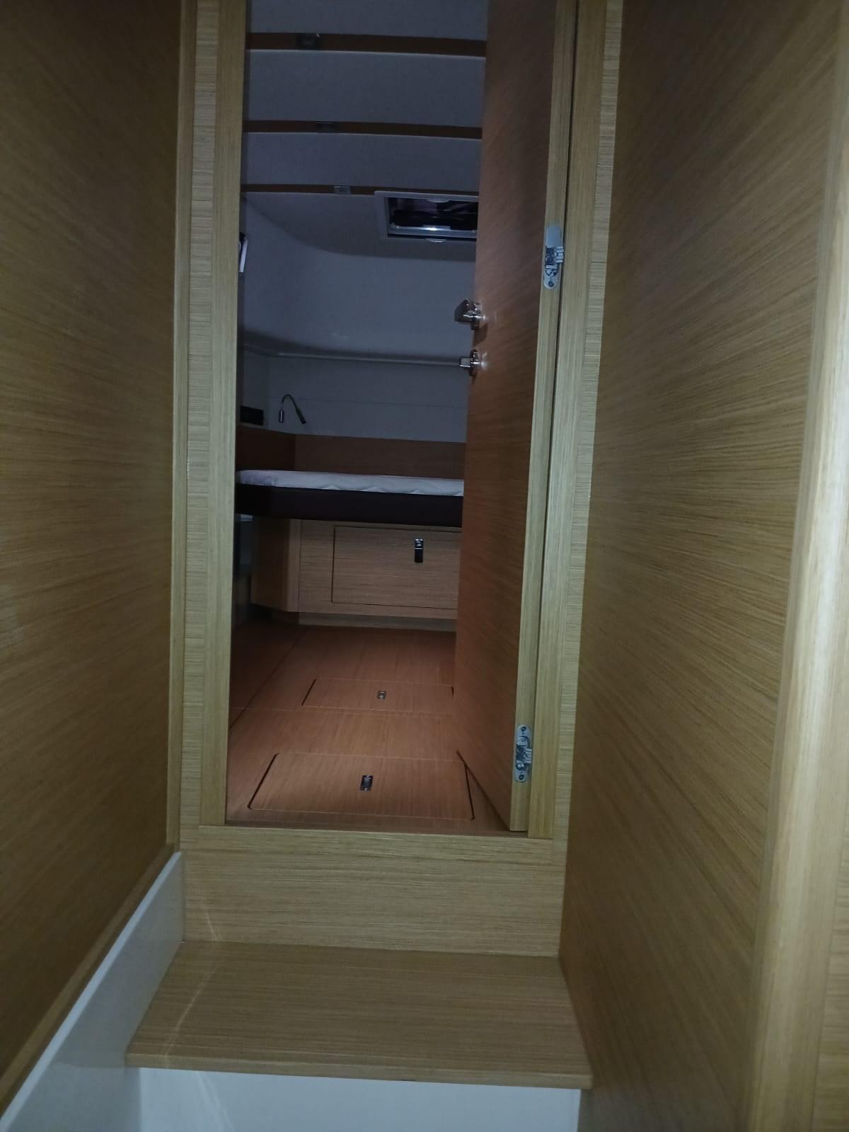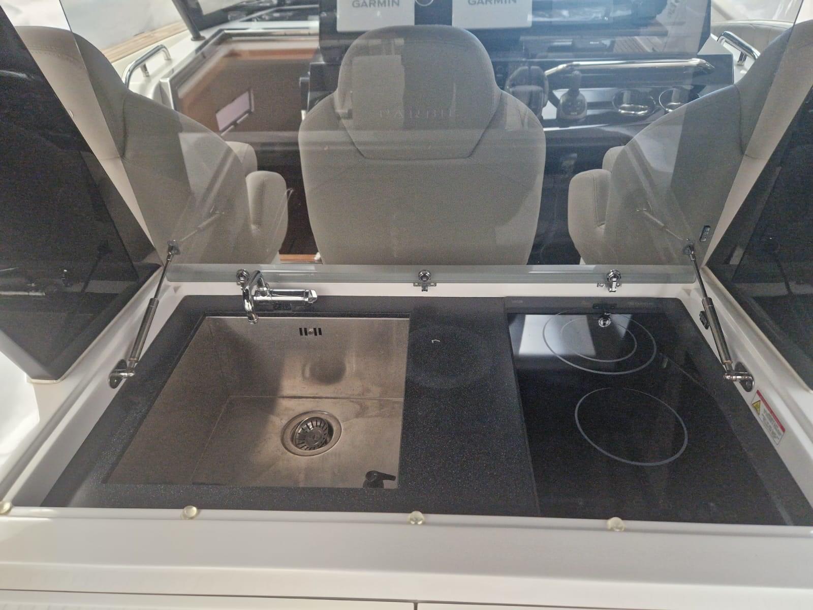 L’intérieur propose une configuration avec deux lits fixes et deux lits supplémentaires, pour un total de quatre lits confortables. Les canapés sont rembourrés en Sky. L’équipement à bord est complet pour garantir un confort maximal.