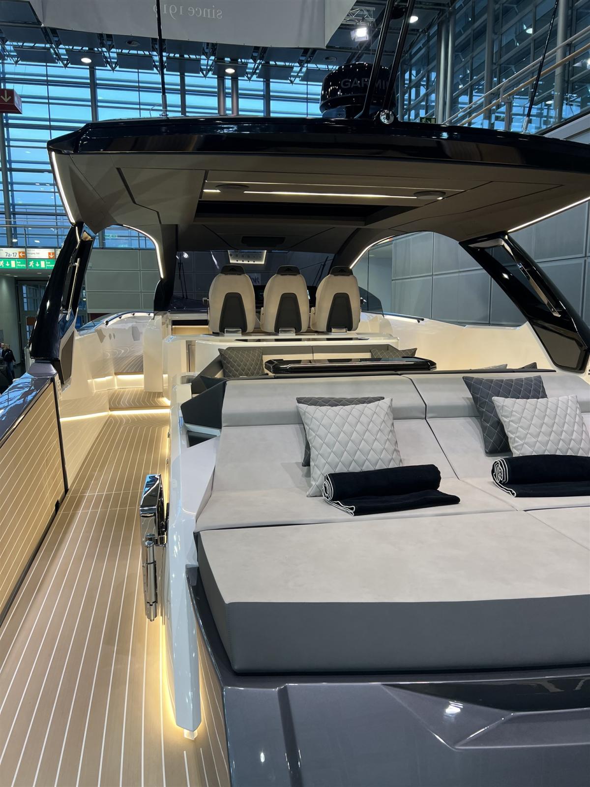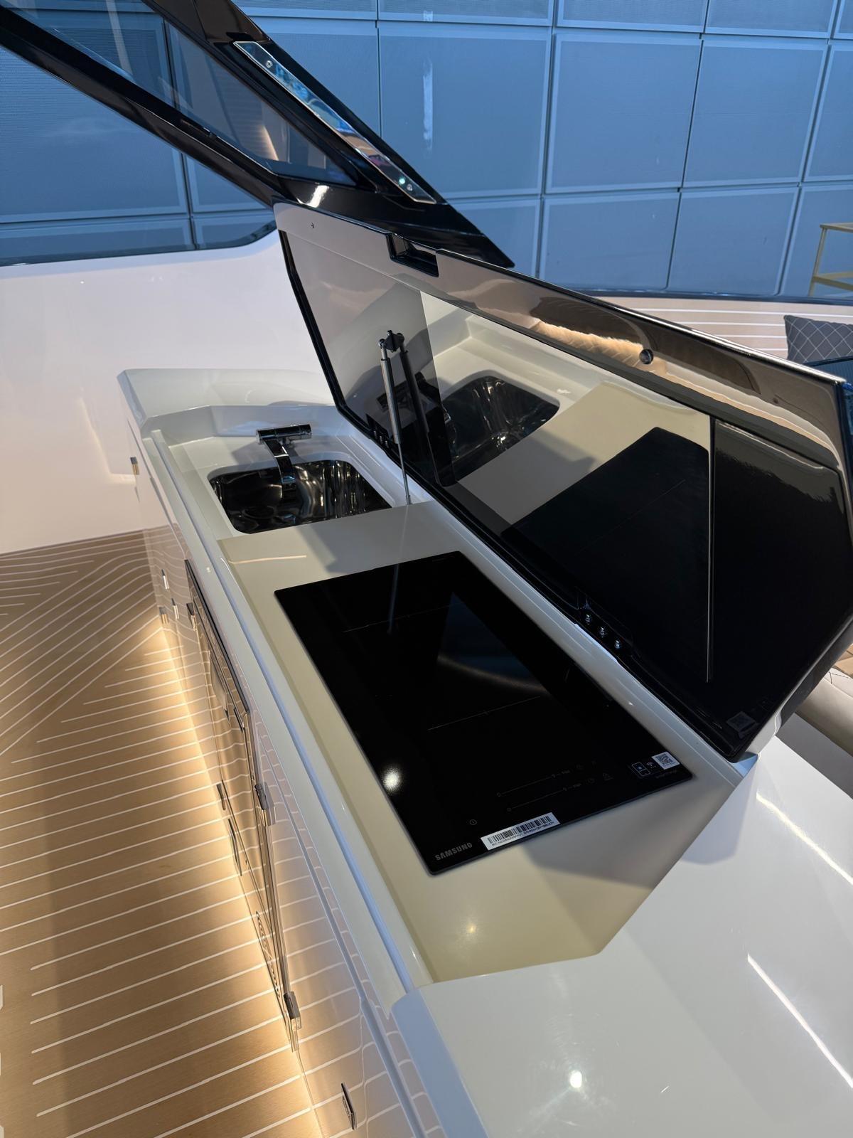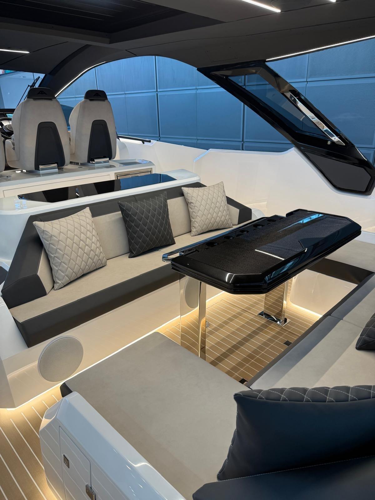 La coque en V garantit une navigation fluide, stable et efficace, offrant maniabilité et sécurité même aux vitesses les plus soutenues. Le cockpit est enrichi par les rampes latérales ouvrantes, un élément de grande valeur qui agrandit considérablement la surface au sol et crée une véritable terrasse surplombant la mer, transformant l’espace de vie extérieur en un espace ouvert et lumineux, parfait pour la détente et la convivialité.
