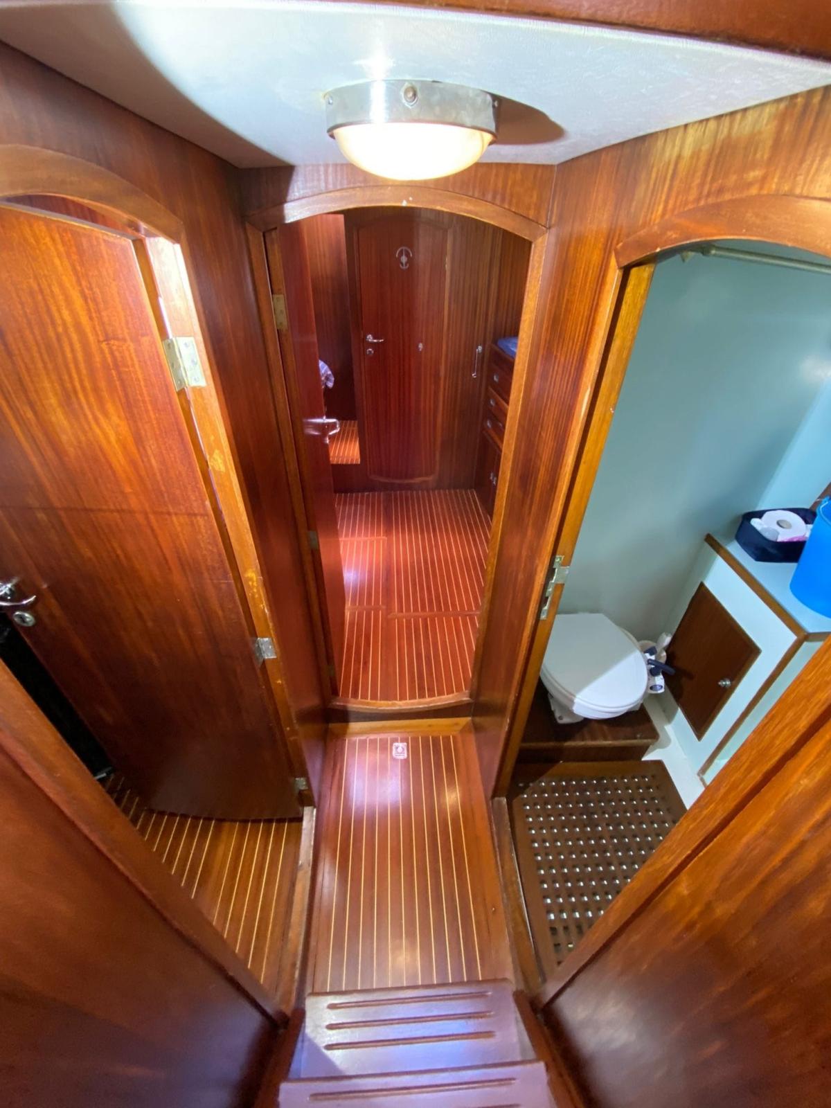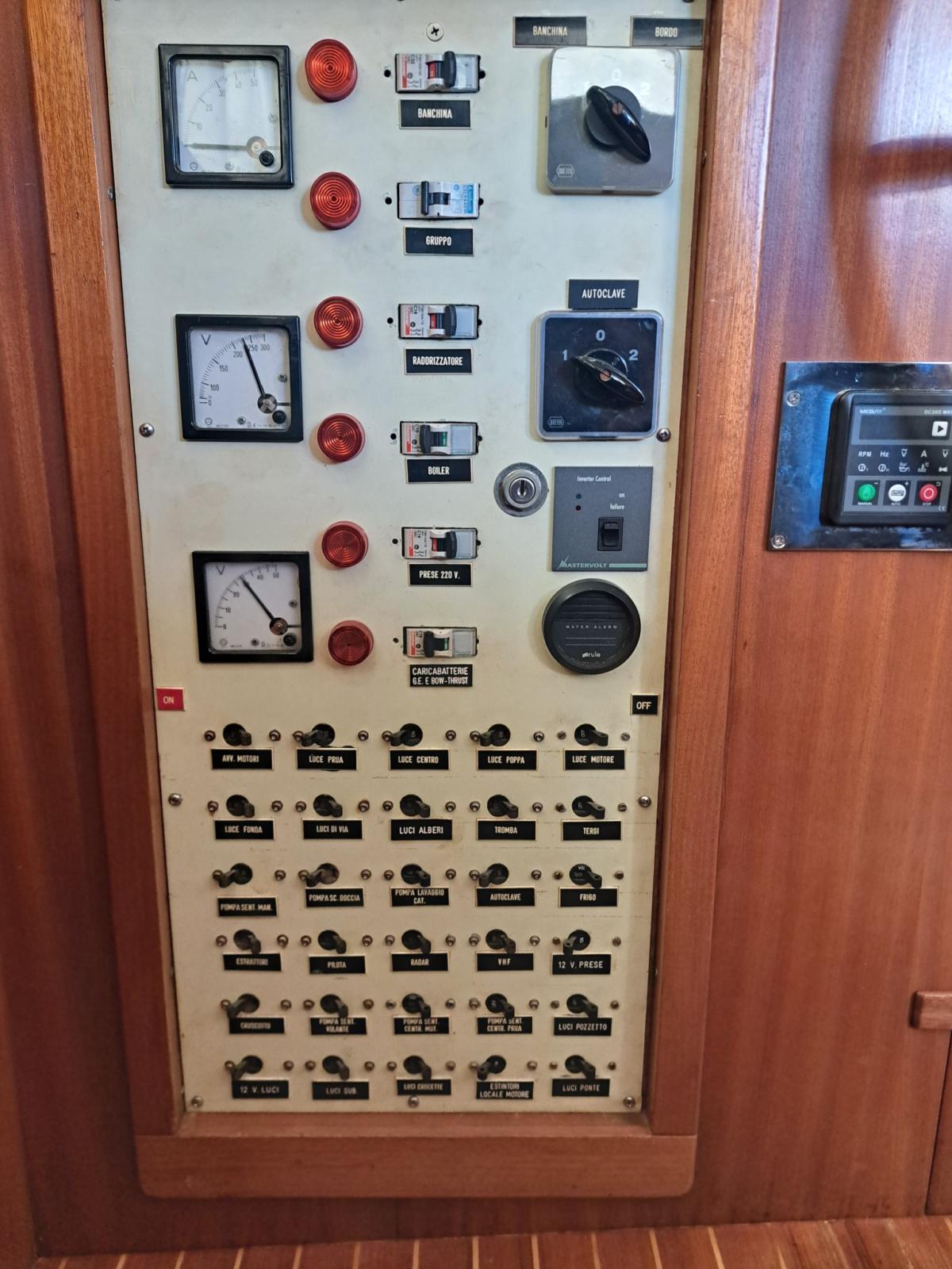 Disposition intérieure et caractéristiques : salon sur le pont, cabine double à l’arrière avec salle de bain attenante, cabine centrale double en forme de L avec salle de bain extérieure, cabine avant pleine poutre avec un lit double et deux lits simples avec salle de bain attenante, cabine de marin avant avec toilettes marines, lavabo et douche à mains, avec accès séparés à l’intérieur et à l’extérieur. Salone des machines sous le pont, avec accès depuis la cabine arrière et depuis le plancher du salon. Autres accessoires : transpondeur AIS Raymarine 700, Epirb 2024, système de surveillance de charge, réserve de charge électrique et de batterie de service, système d’extinction automatique et manuelle de la salle machines, chargeur de batterie Mastervolt, onduleur Mastervolt, double circuit, batteries moteur (180°) / services (400°) avec double alternateur
