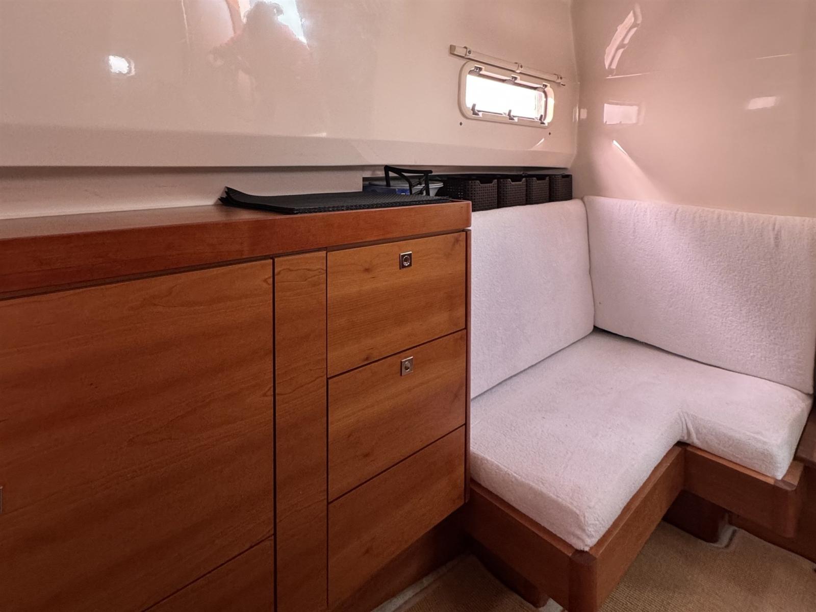 Bimini (aft black mash with poles), 3 Coussin avant, 5 sellerie de cockpit (including fill in cushion for convertible table), 3 Taud de console, 6 Taud de siège (fwd sunpad, companionway, dashboard, benches and table).