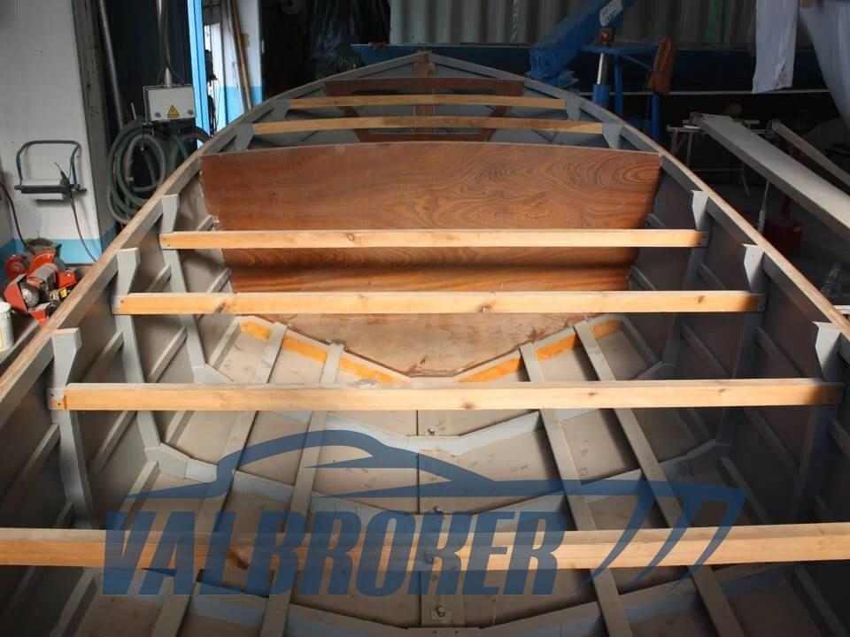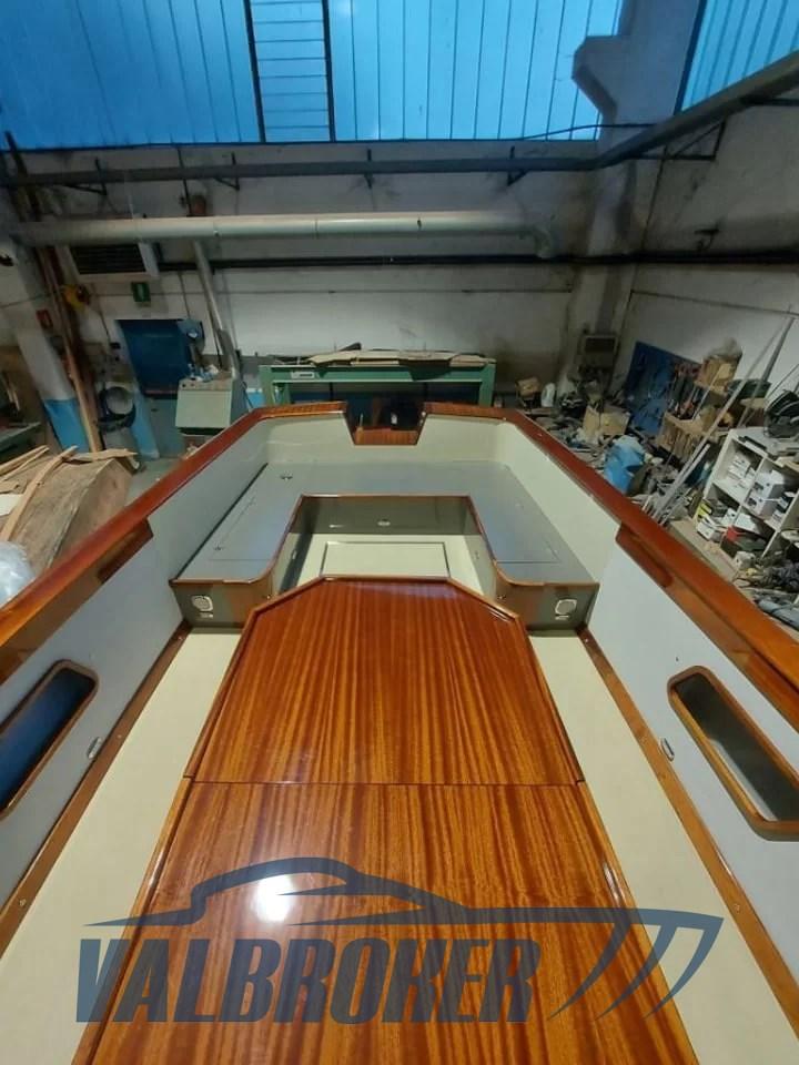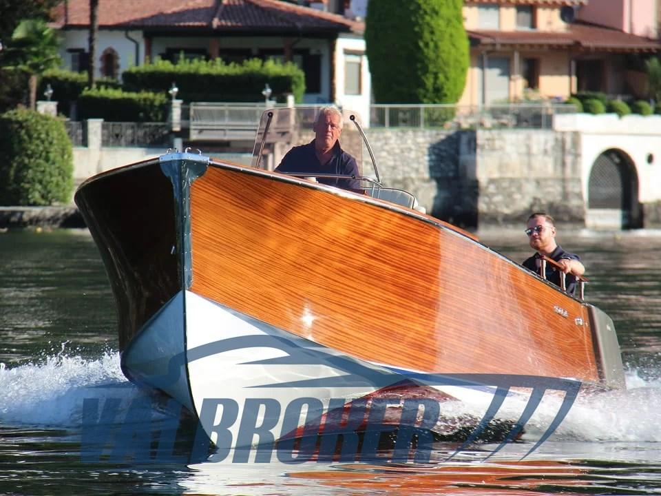BATEAU NEUF. Poldo 23, le bateau du 70e anniversaire, construit en acajou, chêne et iroko. Équipé d’un moteur diesel in-bord et d’une transmission par axe. Le grand bain de soleil à l’avant, le poste de pilotage avec strapontin pour la conduite debout, le compartiment moteur central, les sièges arrière avec le canapé en forme de « U » et enfin la plate-forme de bain avec grille en teck. Les coussins du bain de soleil avant cachent un grand coffre pour le rangement des gilets de sauvetage et du matériel, qui peut devenir une couchette d’urgence si nécessaire. On y accède par deux marches sur les côtés du tableau de bord. La console est équipée d’instruments de navigation classiques, notamment le tachymètre, le niveau de carburant, la pression d’huile, le compteur d’entretien numérique. Deux batteries de 80 Ah fournissent chacune de l’énergie pour le moteur et les services.