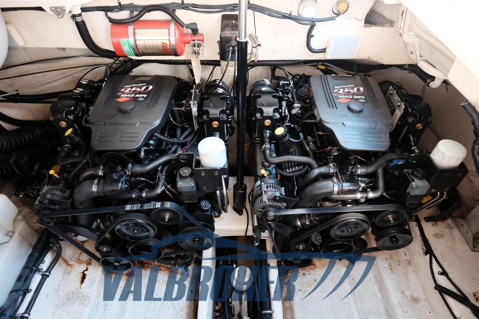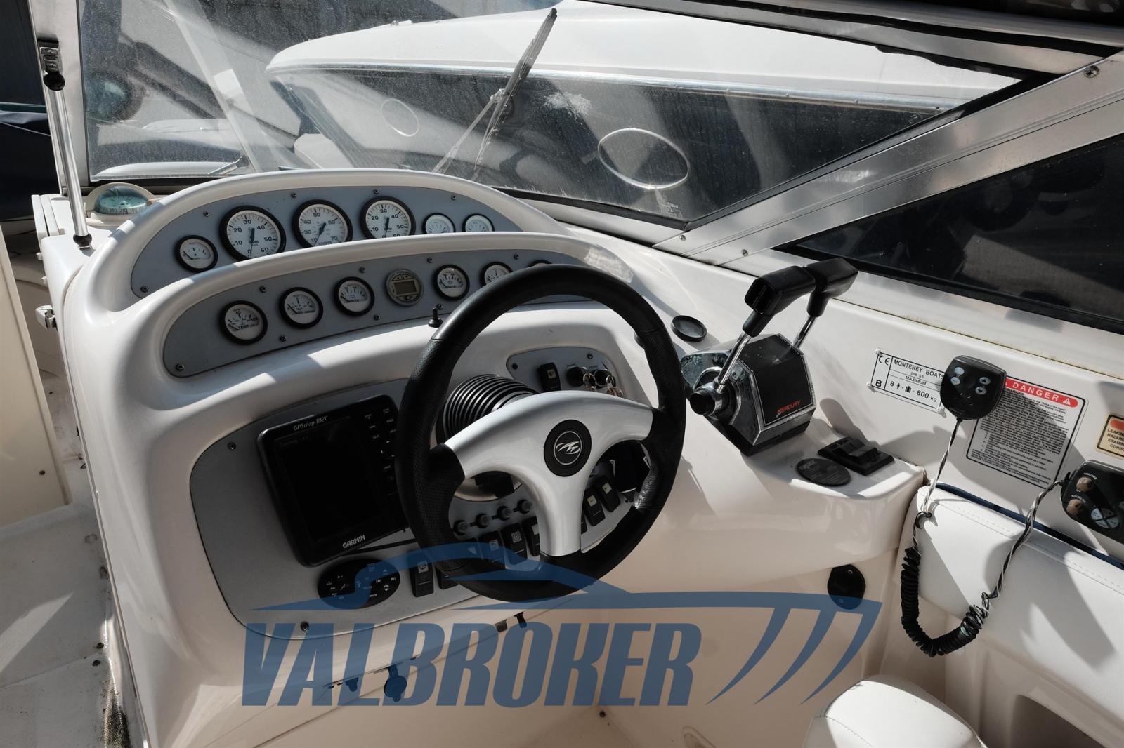 Grand cavalier d’étrave du célèbre chantier naval américain Monterey. Propulsé par un moteur essence 2xV8 350 MAG MPI Mercruiser avec seulement 350 heures de conduite ! Les moteurs ont été déchargés et remanufacturés, l’entretien effectué régulièrement (factures disponibles).