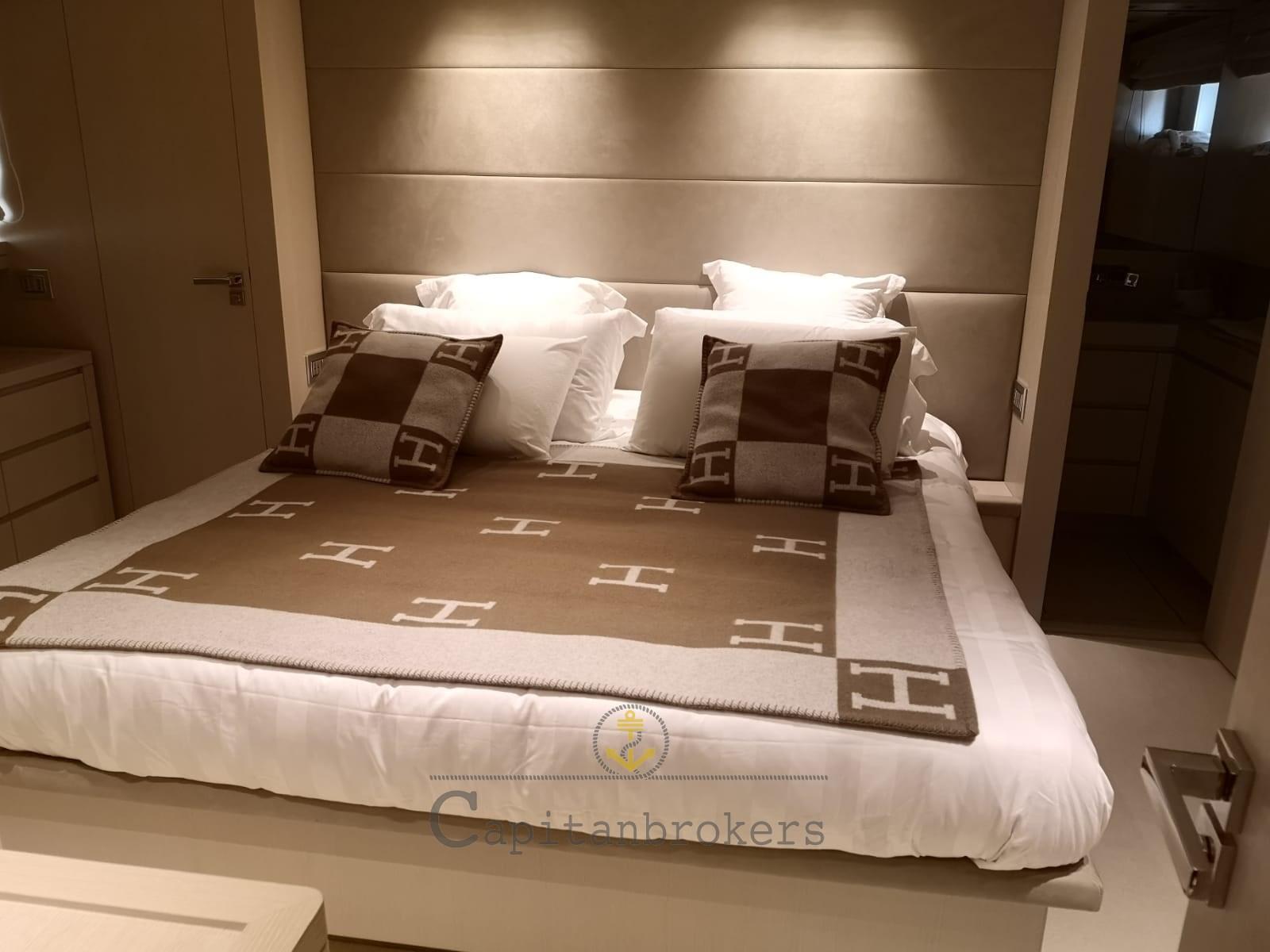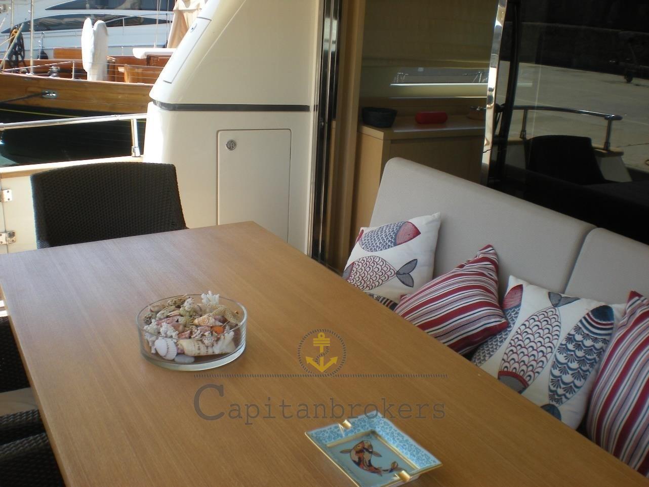 Alarme moteur, Alarme de pompe de cale, Eau sous pression, Douche de cockpit, Double barre à roue, Phare de poursuite, Flaps électriques, Bossoirs, Grue de flybridge, Extincteur(s) fixe(s), Passerelle, Plateforme arrière, Pompe de cale automatique, Porte latérale, Cockpit en teck, Prise de quai, Connexion eau sous pression à quai, Guindeau électrique, Echelle de bain, Stabilisateurs (Pinne stabilizzatrici), table de cockpit, Annexe, Winch électrique arrière, Winch électrique avant.