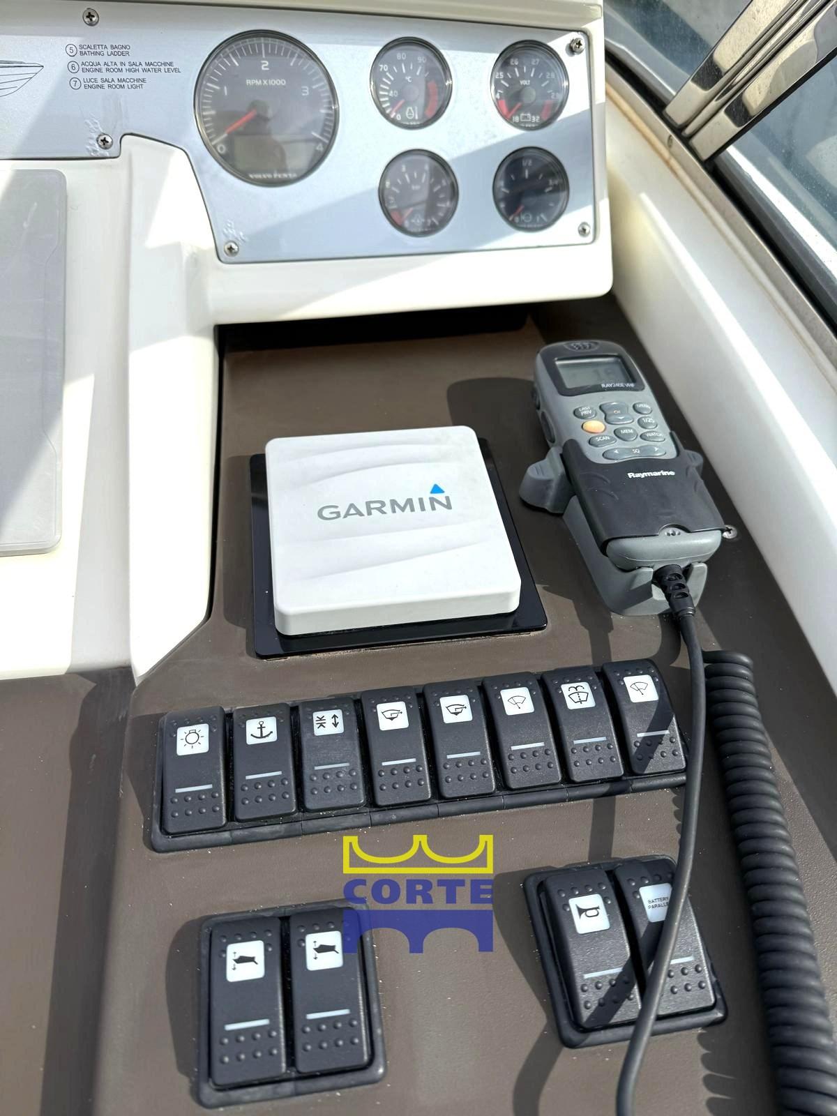 Instrumentation électronique du moteur, manœuvres par joystick ; échosondeur et rondin (Raymarine) ; Traceur GPS ; Pilote automatique (Garmin) ; VHF; Boussole; Angle de gouvernail