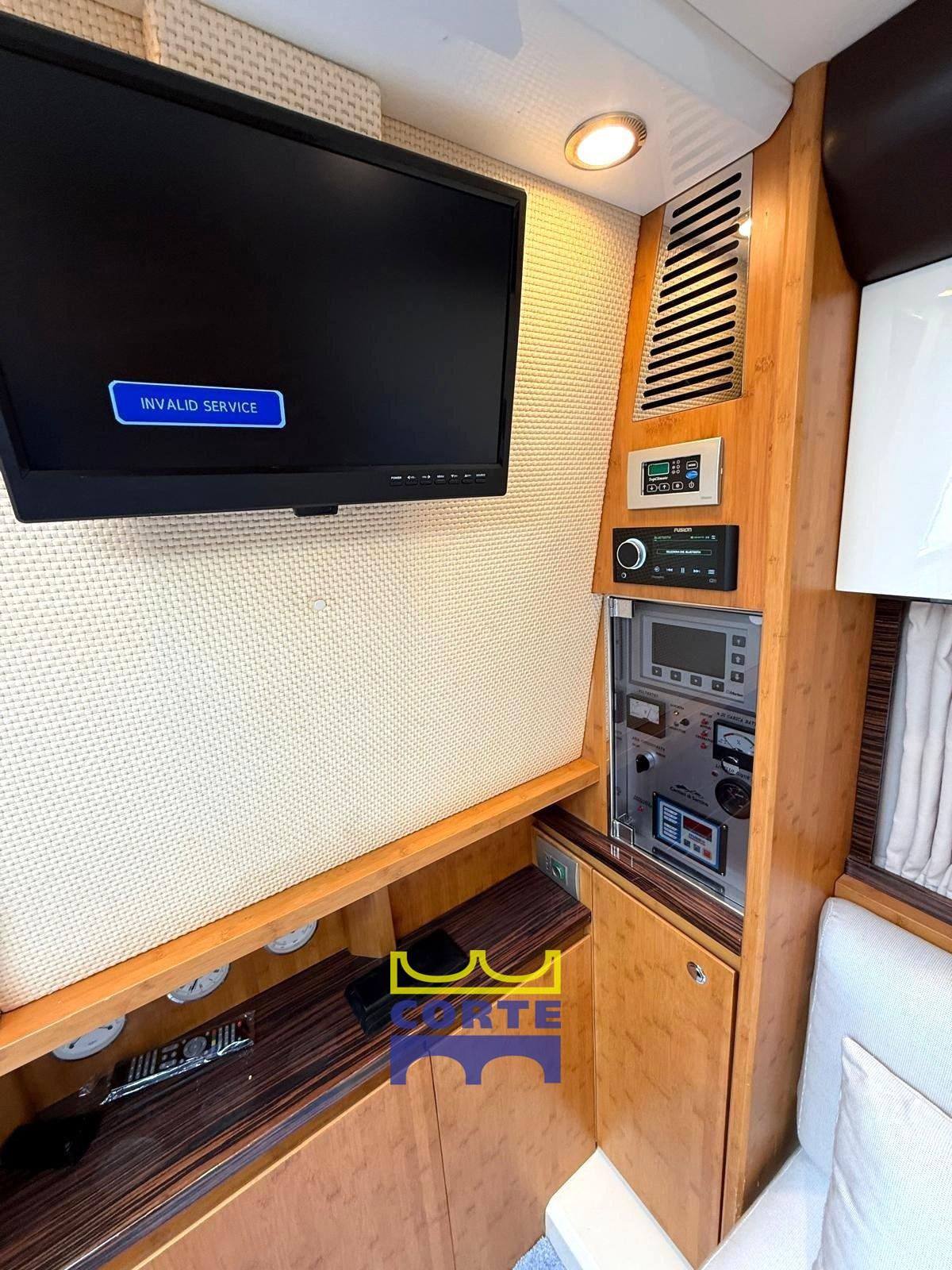 Alarme moteur, Alarme de pompe de cale, Eau sous pression, Câble d’alimentation à quai, Douche de cockpit (pozzetto con acqua calda), Garage à annexe, Extincteur(s) fixe(s), Lavabo dans le cockpit, Passerelle (idraulica), Plateforme arrière (in teak), Porte latérale, Cockpit en teck, Prise de quai, Guindeau électrique, Echelle de bain, table de cockpit.