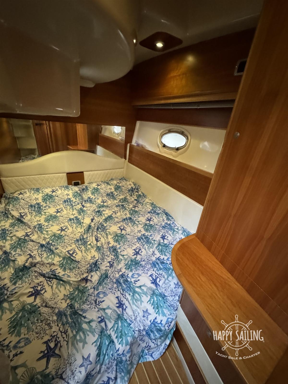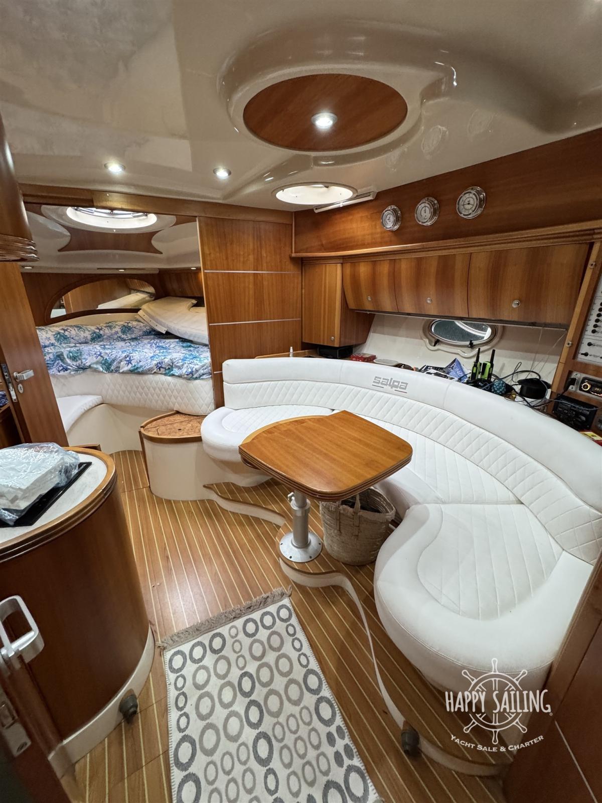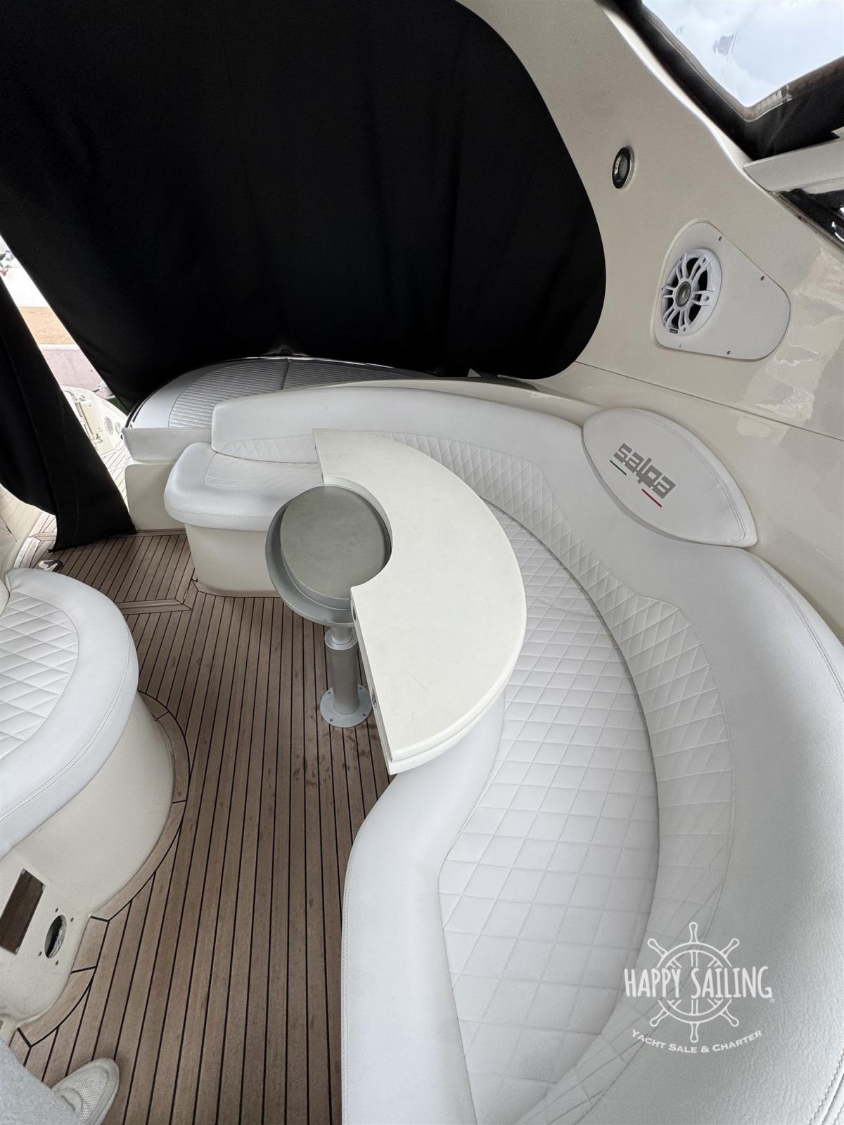 Eau sous pression, Couleur spéciale (Grigio metallizzato), Douche de cockpit, Flaps hydrauliques, Garage à annexe, Lavabo dans le cockpit, Défenses, Passerelle, Plateforme arrière, Pompe de cale automatique, Cockpit en teck, Prise de quai, Onduleur, Rollbar, Guindeau électrique, Echelle de bain, table de cockpit.