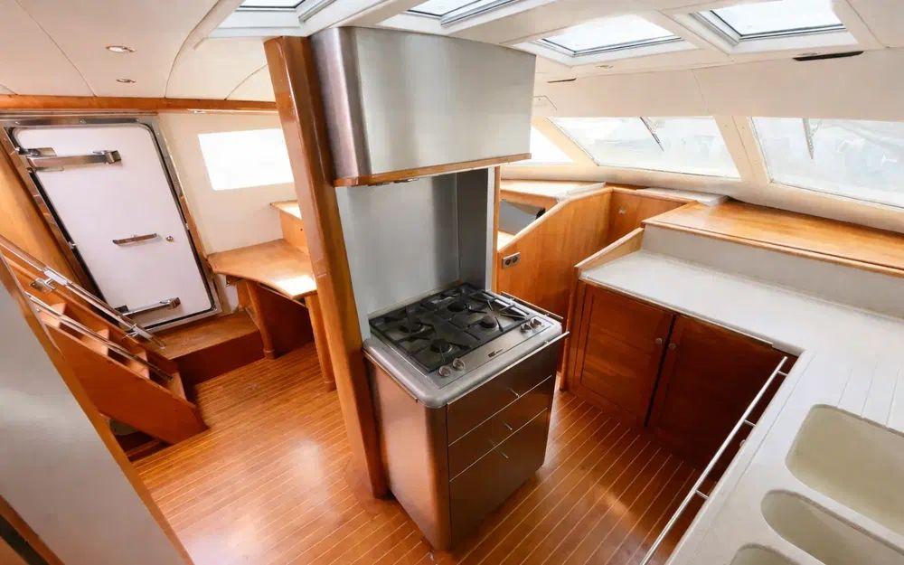 La cuisine, vaste et structurée autour d’un îlot central, offre un niveau d’équipement rarement rencontré : plaque quatre feux, hotte, micro-ondes, réfrigérateur, congélateur, lave-vaisselle, machine à laver, sèche-linge et machine à glaçons. Un espace conçu pour une vie à bord longue durée dans un confort comparable à celui d’un appartement.
