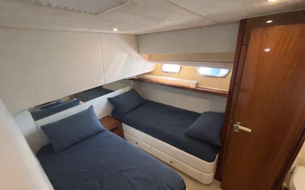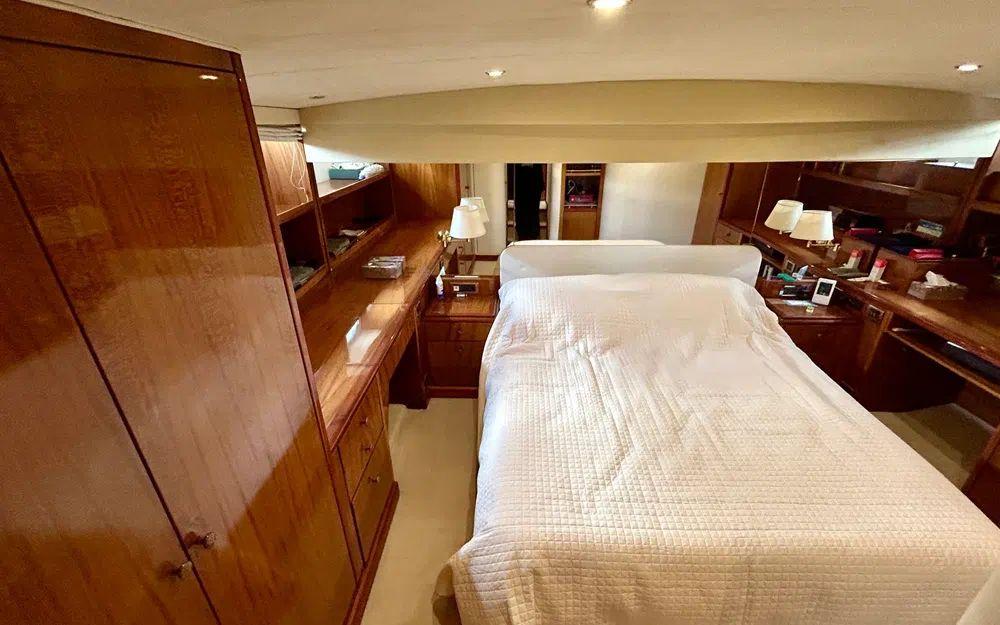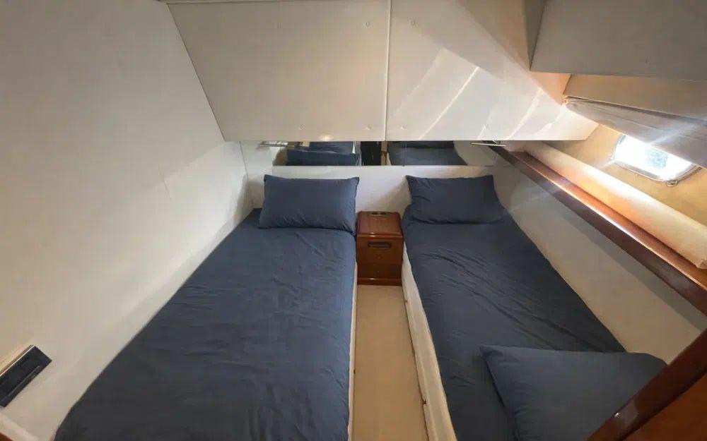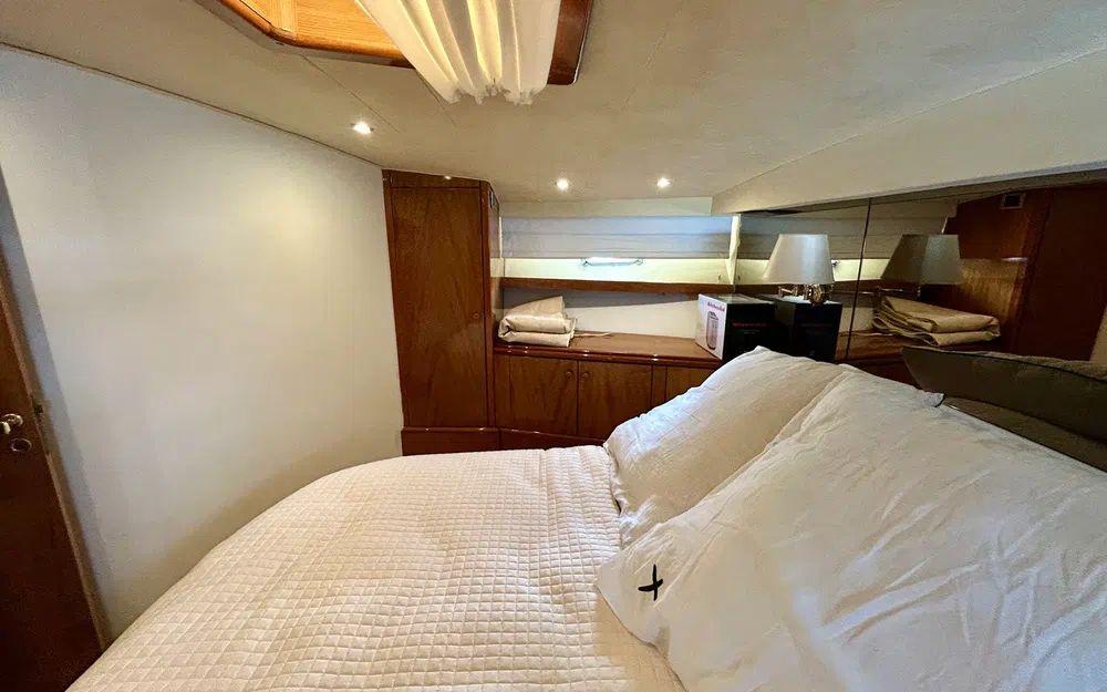 La cabine propriétaire, située en partie basse, est digne d’une suite de standing : volumes généreux, nombreux rangements, table à carte, grand miroir et prestations soignées. L’unité dispose au total de trois véritables cabines, complétées par une cabine équipage avec accès indépendant par le cockpit arrière.
