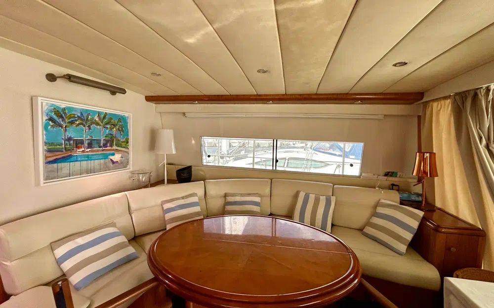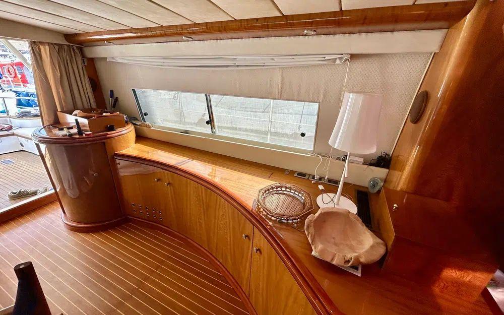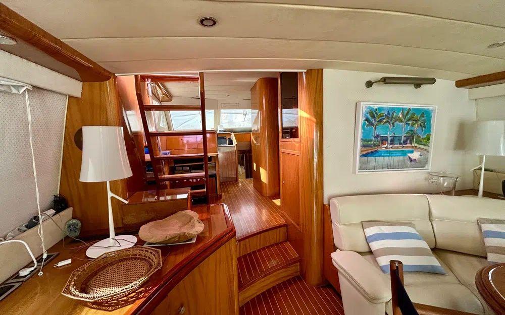 À l’intérieur, l’atmosphère est chaleureuse, lumineuse et décorée avec goût. Les boiseries, vaigrages et sols sont en excellent état. Le grand carré tribord accueille un salon confortable avec télévision encastrée (ouverture électrique), de nombreux rangements et un tableau électrique central. L’ensemble respire la qualité et la cohérence d’un yacht haut de gamme pensé pour durer.