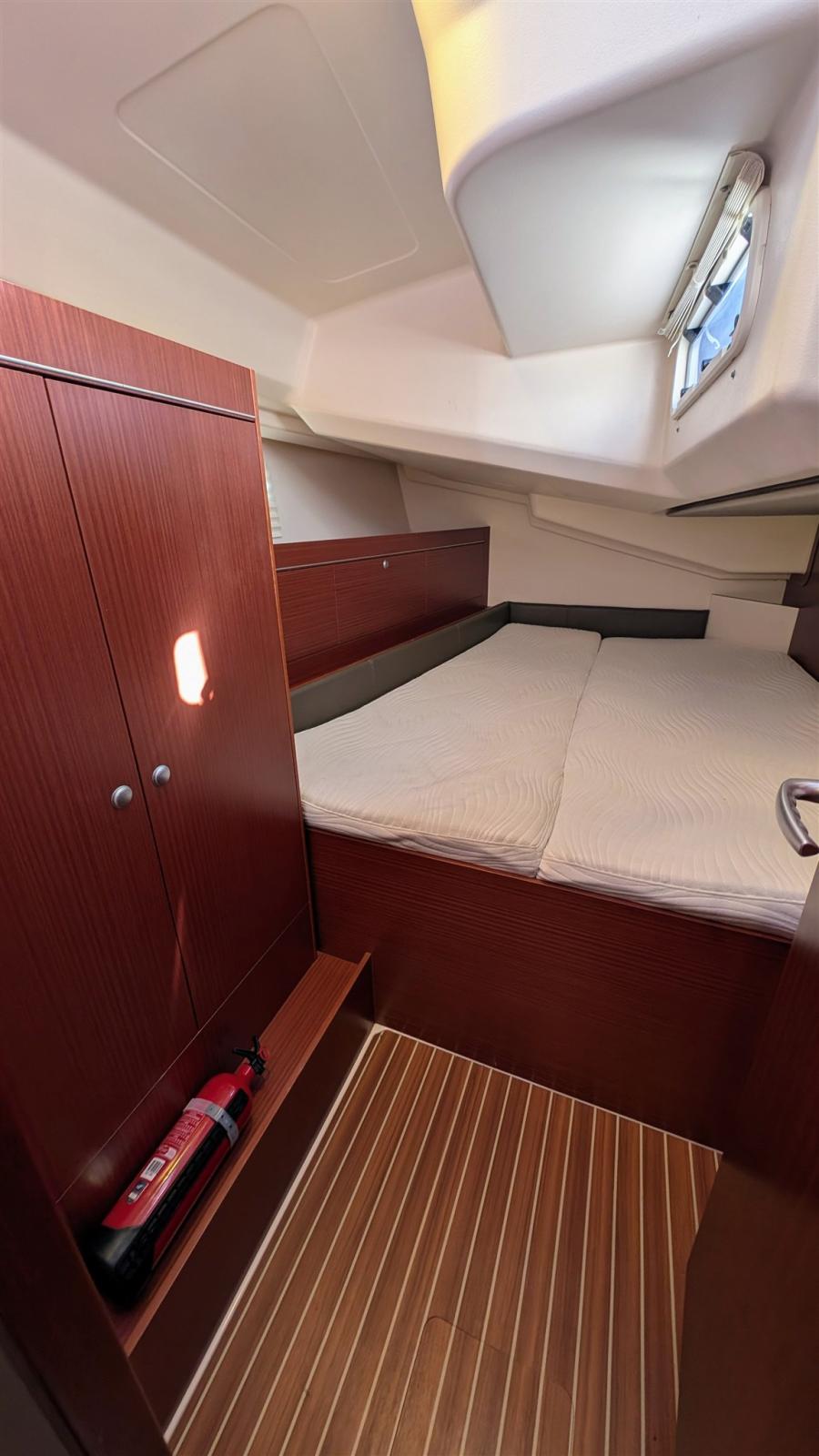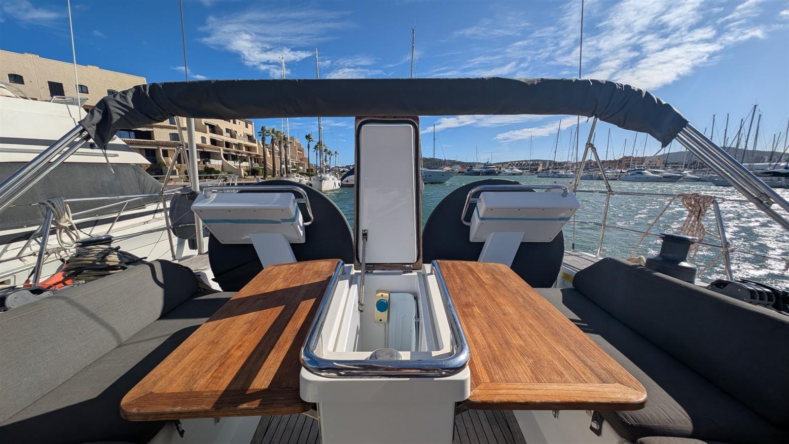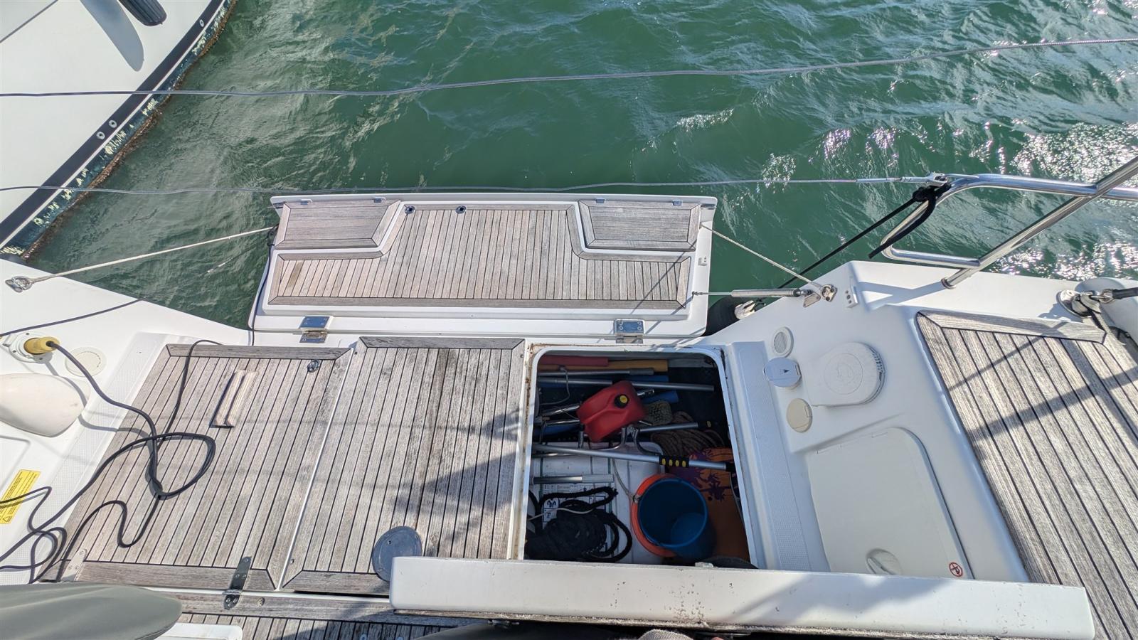 Alarme moteur, Alarme de pompe de cale, Alternateur, 4 Winch selftailing, 3 Batteries (una da 90 Ah e due da 165 Ah tutte AGM), 6 Taquets pliants, Chargeur de batterie (50Ah), Douche de cockpit, Double barre à roue, Éclairage de courtoisie, Moniteur de batterie, Moteur hors-bord pour annexe, 8 Défenses, Plateforme arrière, 2 Pompe de cale automatique, Cockpit en teck, Prise de quai, Guindeau électrique, Gréement monotoron, Echelle de bain, Chaise support HB, table de cockpit, Annexe, Filières avec sortie latèrale, Pont en teck, 2 Winch électrique.