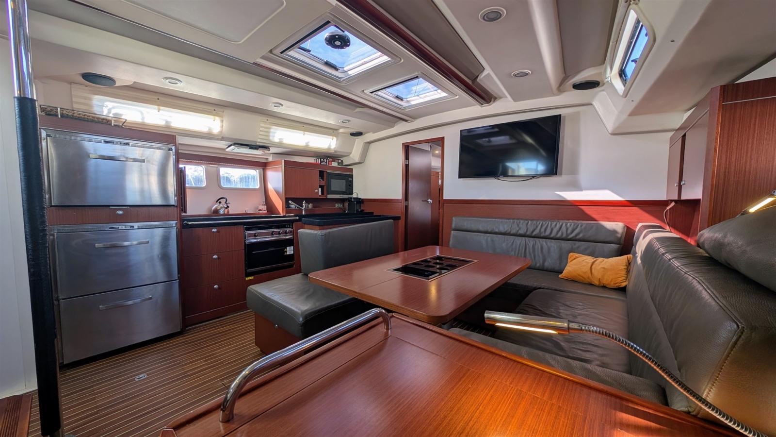 La voilure bien dimensionnée (environ 129 m²) et le gréement sloop fractionné offrent un équilibre entre facilité de manœuvre, progression sous voile et confort à l’intérieur — parfait pour les navigateurs exigeants en quête de polyvalence.