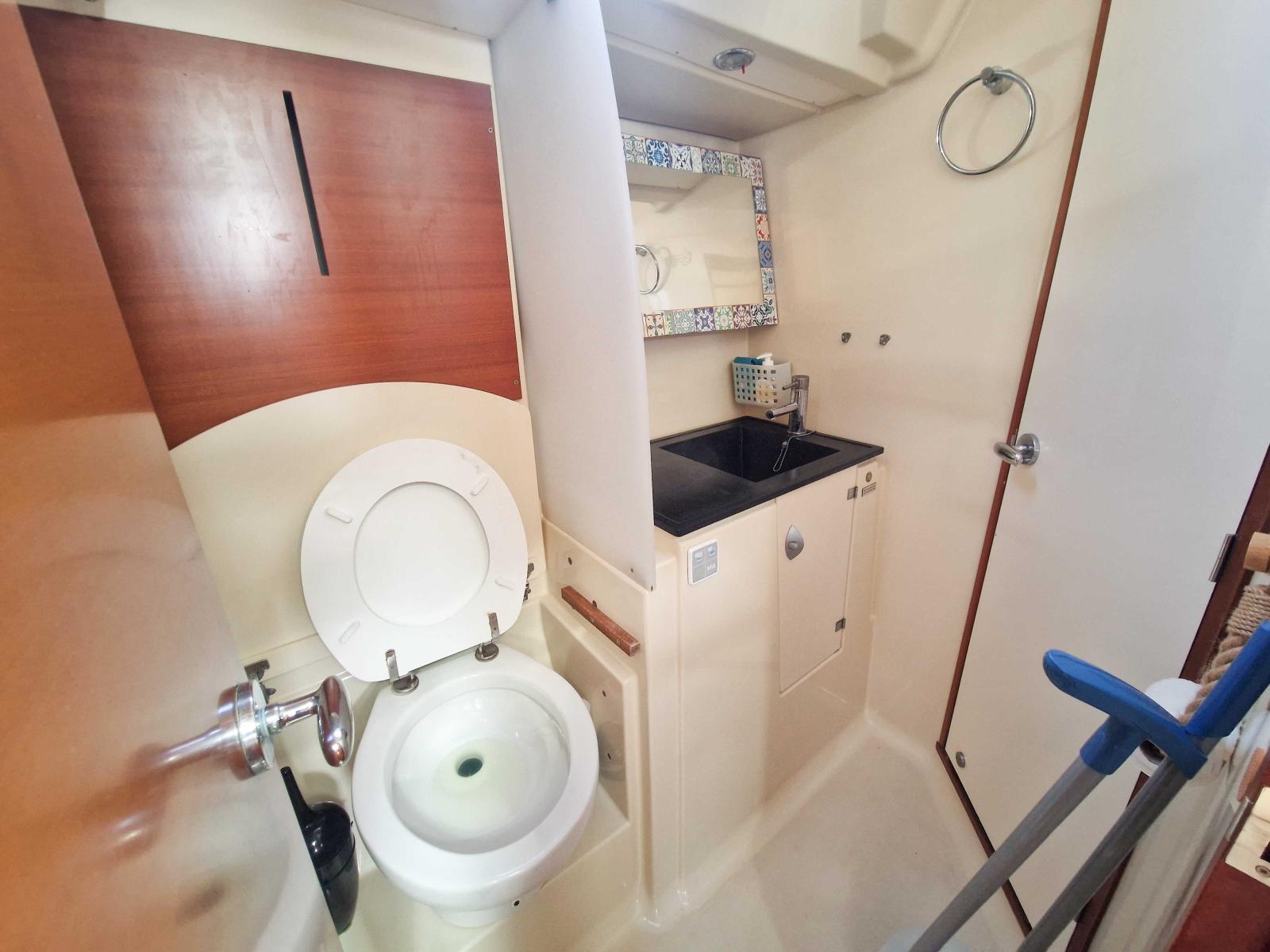 L'aménagement intérieur offre 3 cabines spacieuses pouvant accueillir jusqu'à 7 personnes, avec 2 WC électriques eau douce/mer pour un confort optimal. L'espace de vie bénéficie d'équipements modernes incluant climatisation Dometic, chauffage, chauffe-eau 60L, et un éclairage complet en LED. La cuisine est entièrement équipée avec 2 réfrigérateurs (125L + 80L), congélateur, four, micro-ondes, lave-vaisselle (2021) et lave-linge Kenwood (2021).