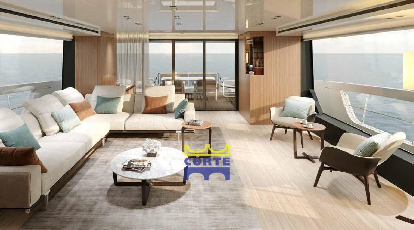 Alarme gaz, Alarme moteur, Alarme de pompe de cale, Douche de cockpit (flybridge), Hard top, Extincteur(s) fixe(s), Lavage de chaine, Spots sous-marins (n.°4 a led 7000 lumen (n° 2su spiaggetta di poppa e n°2 laterali)), Passerelle, Plateforme arrière, Porte latérale, Cockpit en teck, Prise de quai, Connexion eau sous pression à quai, Echelle de bain, Stabilisateurs (pinne stabilizzatrici elettriche Zero Speed all'ancora e in navigazione), table de cockpit.