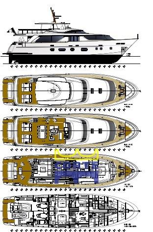 Zone de l’équipage : Dinette, cabine du capitaine avec salle de bain, cabine de l’équipage avec lits superposés, cabine simple pour les marins, salle de bain pour les marins.