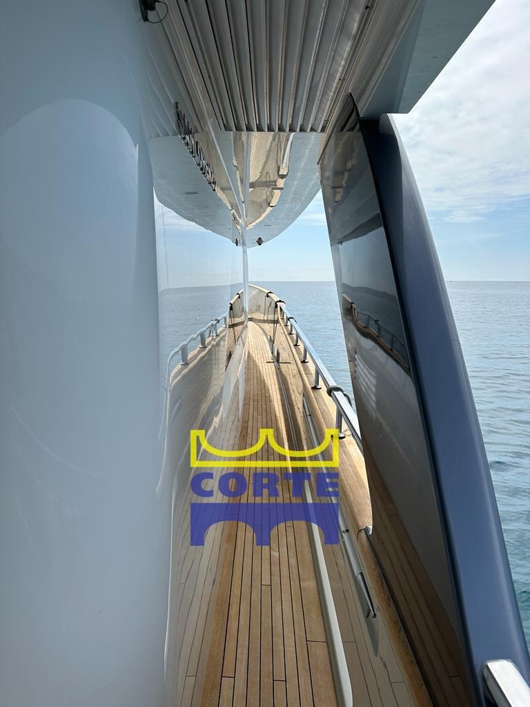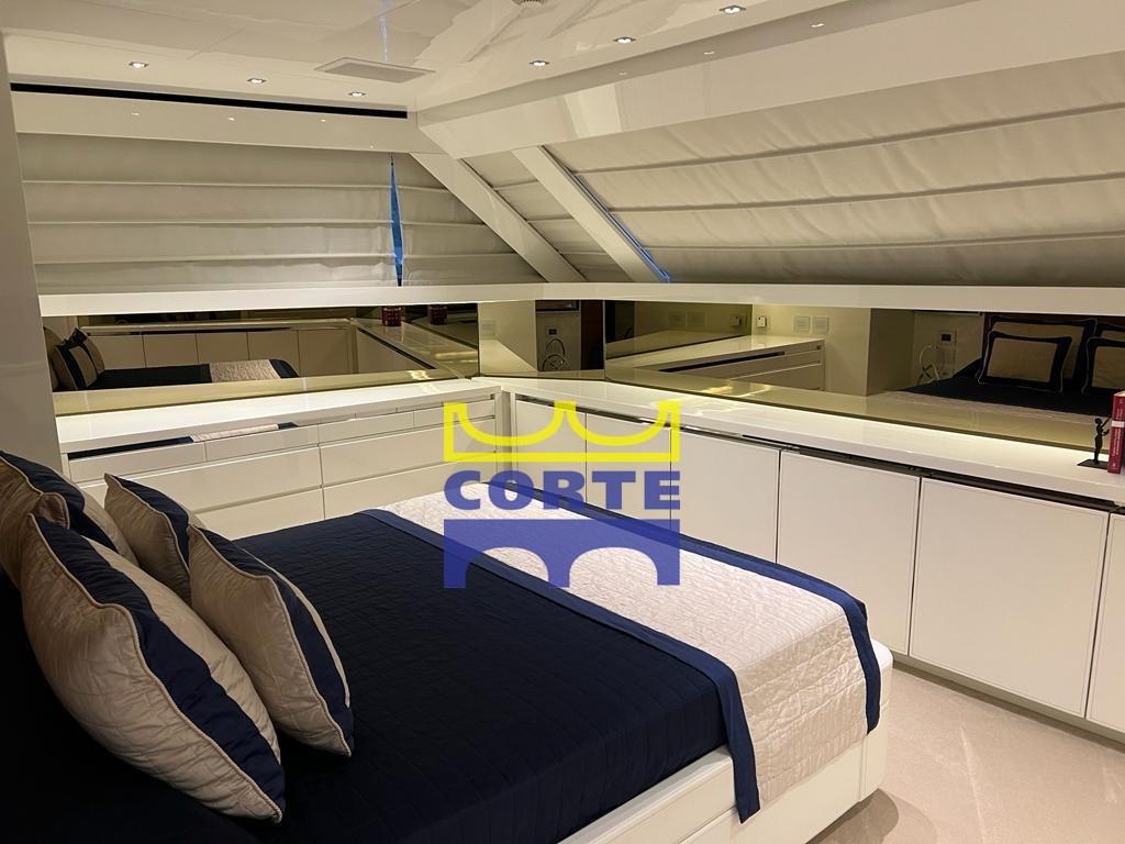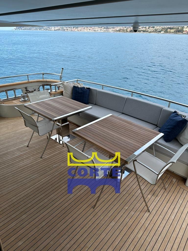 Alarme gaz, Alarme moteur, Alarme de pompe de cale, 4 Chargeur de batterie, Douche de cockpit, Phare de poursuite, Garage à annexe, Hard top, Extincteur(s) fixe(s), Éclairage de courtoisie, Jet-ski (Yamaha Sport jet), Passerelle (elettroidraulica a scomparsa), Plateforme arrière (poppa in teak), Porte latérale, 2 Porte latérale, Cockpit en teck, Prise de quai, Connexion eau sous pression à quai, 2 Guindeau électrique, Echelle de bain, Stabilisateurs (Pinne Cmc zero speed), table de cockpit, Annexe (Williams 435), 2 Winch électrique arrière, 2 Winch électrique avant.
