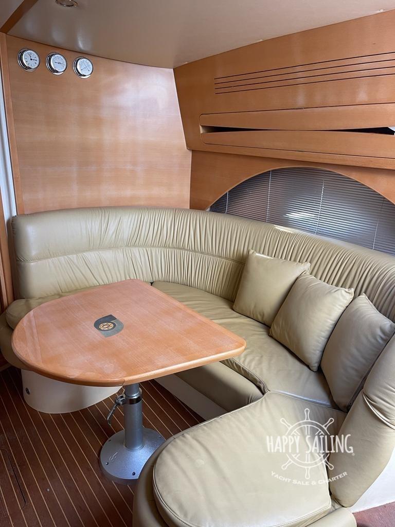 Alarme moteur, Eau sous pression, Douche de cockpit, Flaps électriques, Garage à annexe, Hard top, Éclairage de courtoisie, Passerelle, Plateforme arrière, Cockpit en teck, Prise de quai, table de cockpit.