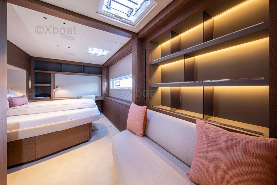 Son cockpit généreux, accessible par de larges jupes, offre une circulation fluide et un accès facile à la plateforme arrière, idéale pour les loisirs nautiques. Conçu par Nauta Design, son intérieur en bois Alpi est baigné de lumière naturelle grâce aux vastes baies vitrées et aux puits de lumière. Le carré panoramique propose un grand espace salon, une table à manger et un bar, tandis que la cuisine en coursive permet discrétion et efficacité.
