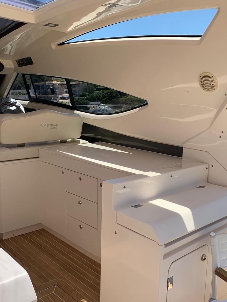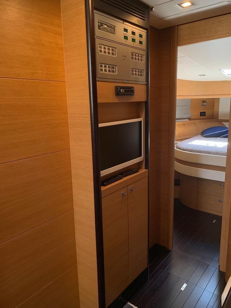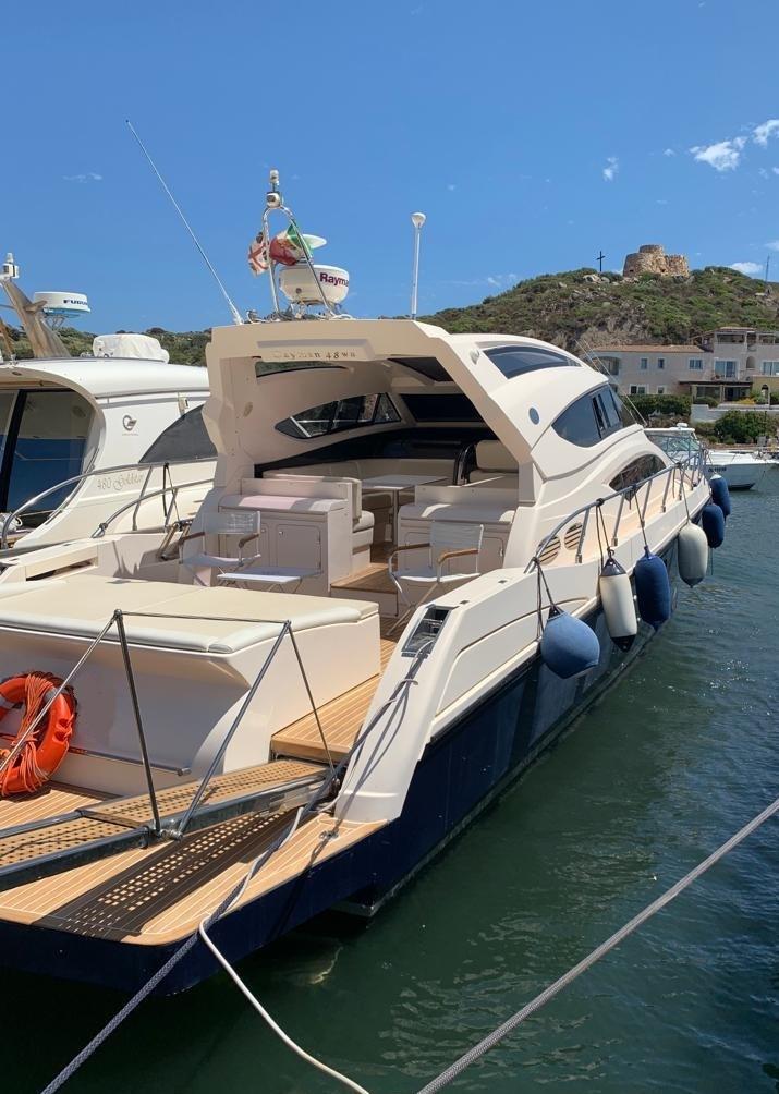 Alarme moteur, Alarme de pompe de cale, Eau sous pression, Couleur spéciale (scafo BLU), Douche de cockpit, Flaps électriques, Garage à annexe, Hard top, Extincteur(s) fixe(s), Lavabo dans le cockpit, Éclairage de courtoisie, Passerelle, Plateforme arrière, Pompe de cale automatique, Pompe de cale manuelle, Cockpit en teck, Prise de quai, Guindeau électrique, Echelle de bain, table de cockpit, Corne.