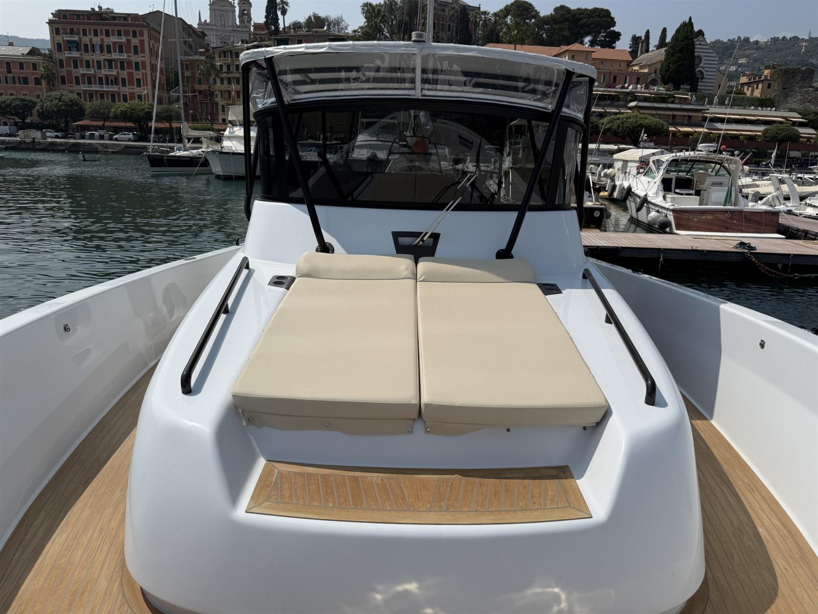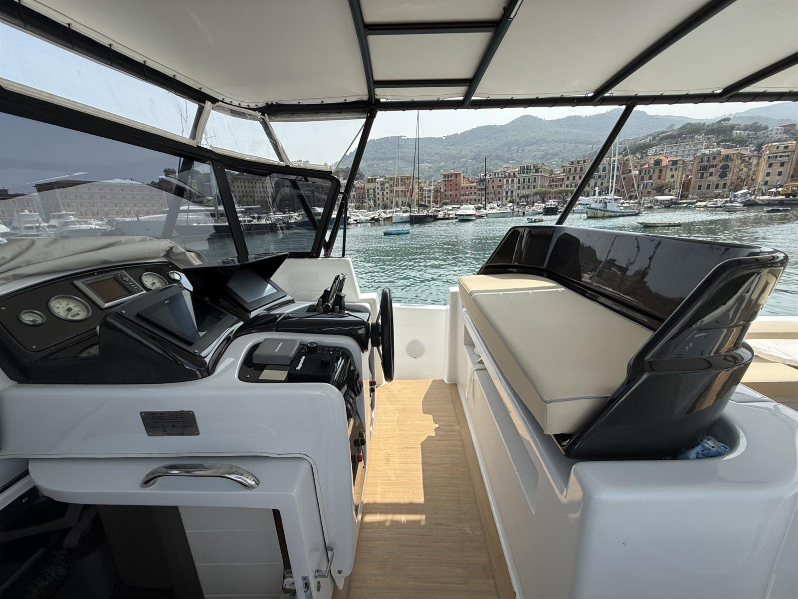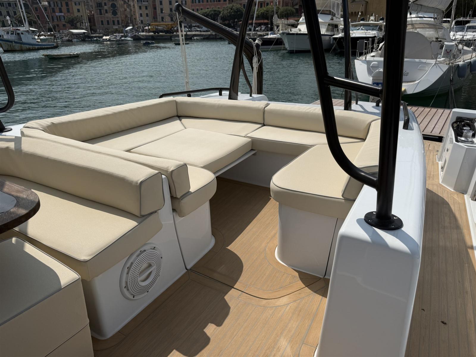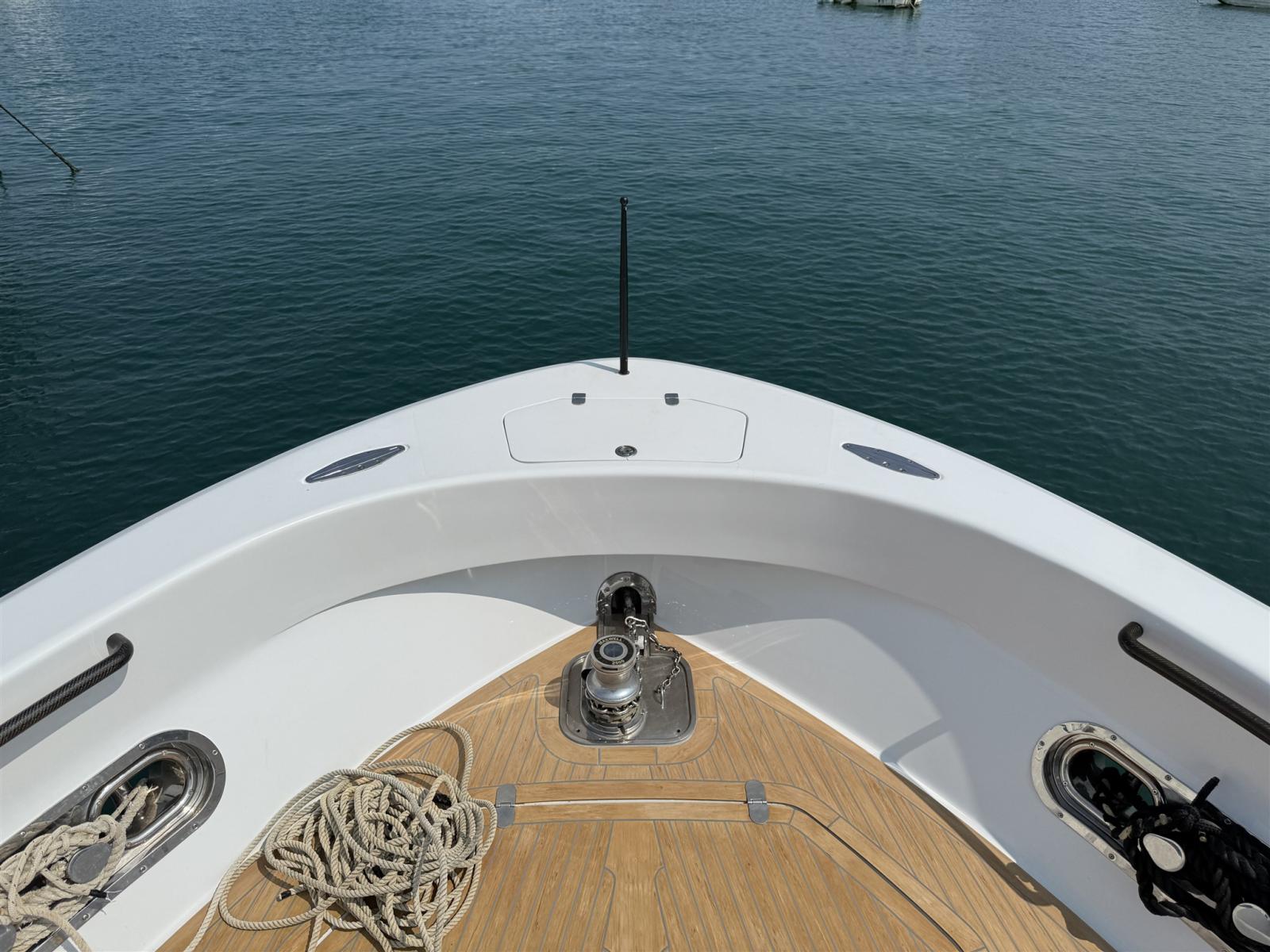 Alarme moteur, Alarme de pompe de cale, Alternateur, Ouverture du compartiment moteur électrique, Eau sous pression, Passavant en teck (SINTETICO), Douche de cockpit, Flaps électriques, Bossoirs, Lavabo dans le cockpit, Éclairage de courtoisie, Passerelle, Plateforme arrière, Pompe de cale automatique, Pompe de cale manuelle, Pont en teck (SINTETICO), Porte latérale, Cockpit en teck (SINTETICO), Prise de quai, Guindeau électrique, Echelle de bain, table de cockpit, Table pliante de salon, Corne, T-Top, Winch électrique arrière.