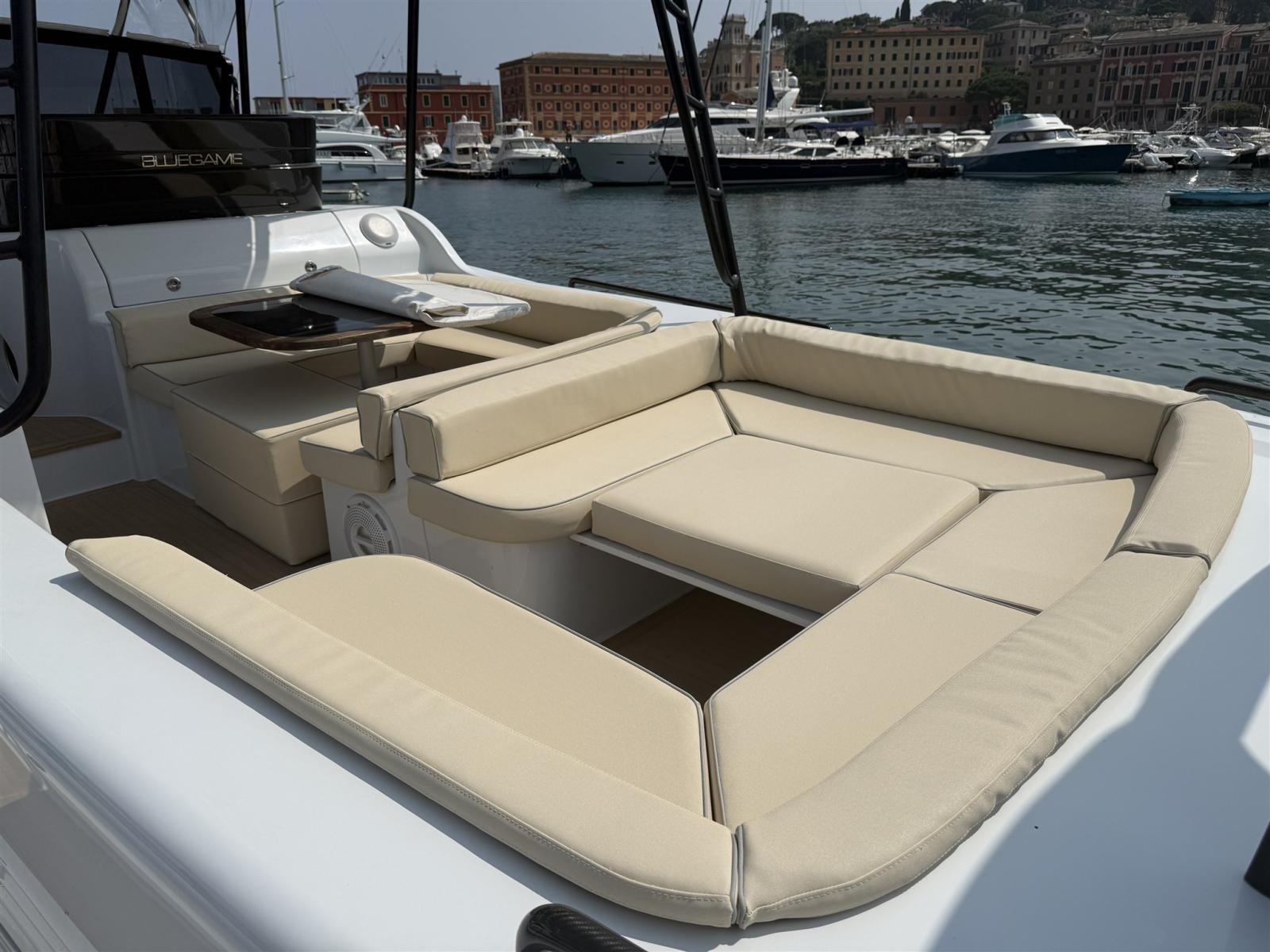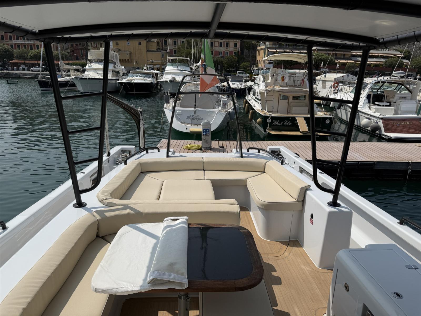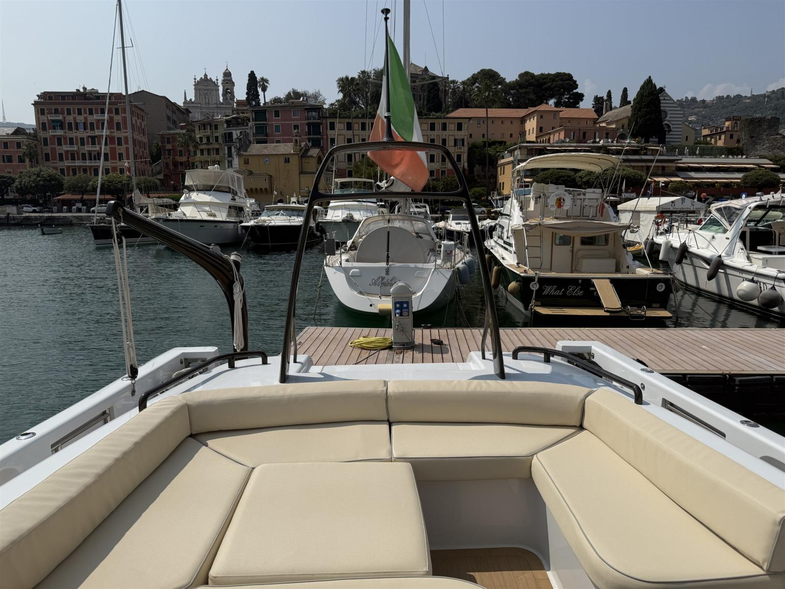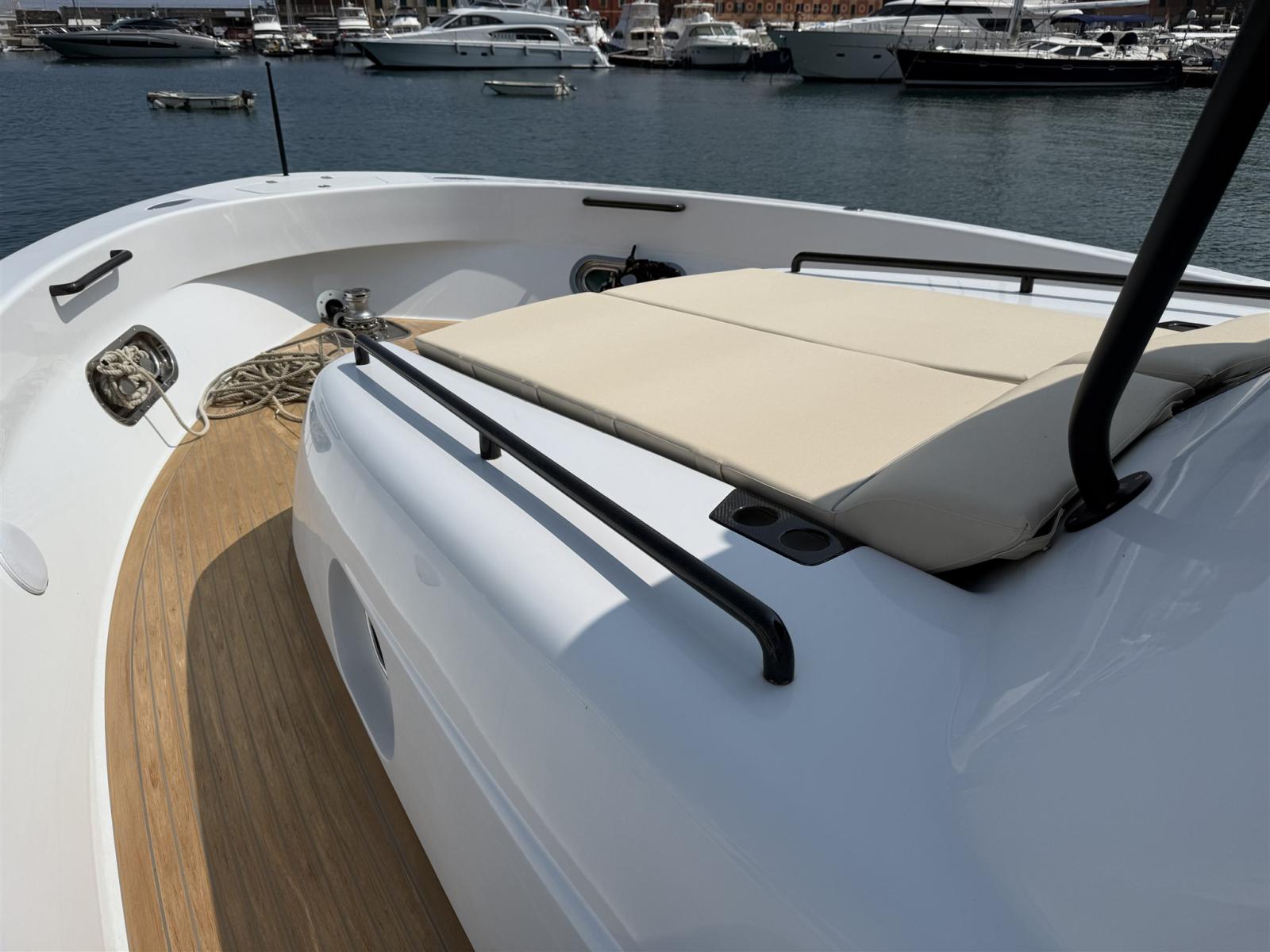 Alarme moteur, Alarme de pompe de cale, Alternateur, Ouverture du compartiment moteur électrique, Eau sous pression, Passavant en teck (SINTETICO), Douche de cockpit, Flaps électriques, Bossoirs, Lavabo dans le cockpit, Éclairage de courtoisie, Passerelle, Plateforme arrière, Pompe de cale automatique, Pompe de cale manuelle, Pont en teck (SINTETICO), Porte latérale, Cockpit en teck (SINTETICO), Prise de quai, Guindeau électrique, Echelle de bain, table de cockpit, Table pliante de salon, Corne, T-Top, Winch électrique arrière.
