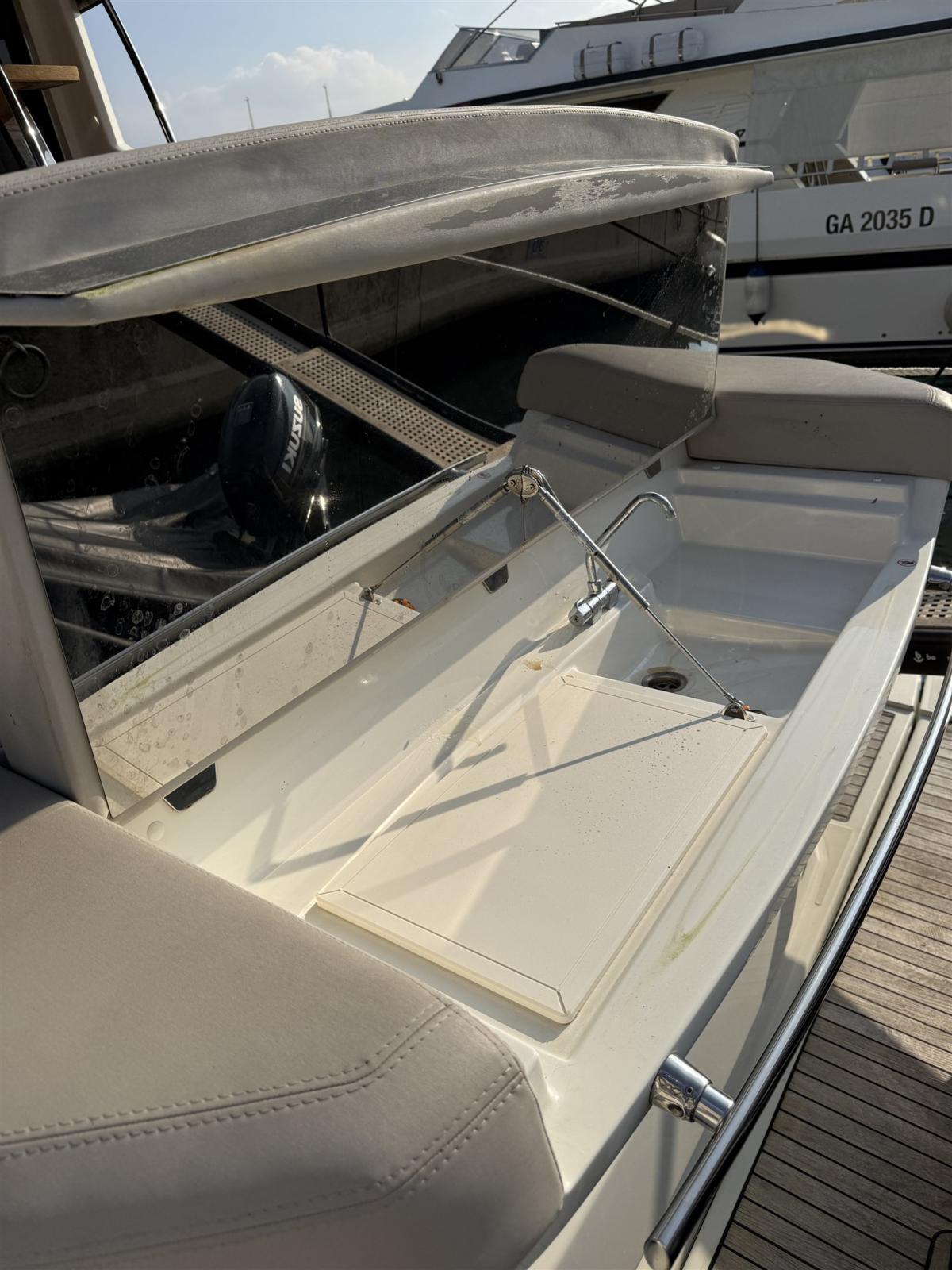 Alarme moteur, Alarme de pompe de cale, Alternateur, Eau sous pression, Passavant en teck, Câble d’alimentation à quai, Douche de cockpit, Double barre à roue, Phare de poursuite, Flaps électriques (HUMPHREE), Extincteur(s) fixe(s), Indicateurs de flaps, Lavabo dans le cockpit, Éclairage de courtoisie, Spots sous-marins, Passerelle, Plateforme arrière (AFFONDABILE IDRAULICAMENTE), Pompe de cale automatique, Pompe de cale manuelle, Pont en teck, Porte latérale (CON APERTURA FINESTRATURA A COMPASSO), Porte latérale, Cockpit en teck, Prise de quai, Répétiteur électronique, Rollbar, Guindeau électrique, Echelle de bain, Selles pour Annexe, table de cockpit, Filières avec sortie latèrale, Corne, Winch électrique arrière.