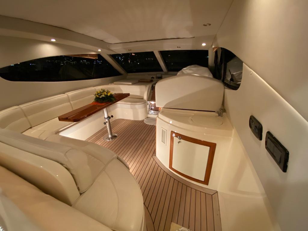Alarme moteur, Alarme de pompe de cale, Eau sous pression, Douche de cockpit, Flaps hydrauliques, Hard top, Extincteur(s) fixe(s), Éclairage de courtoisie, Spots sous-marins, Passerelle, Plateforme arrière, Pompe de cale automatique, Pompe de cale manuelle, Cockpit en teck, Onduleur, Rollbar, Guindeau électrique, Echelle de bain, table de cockpit.