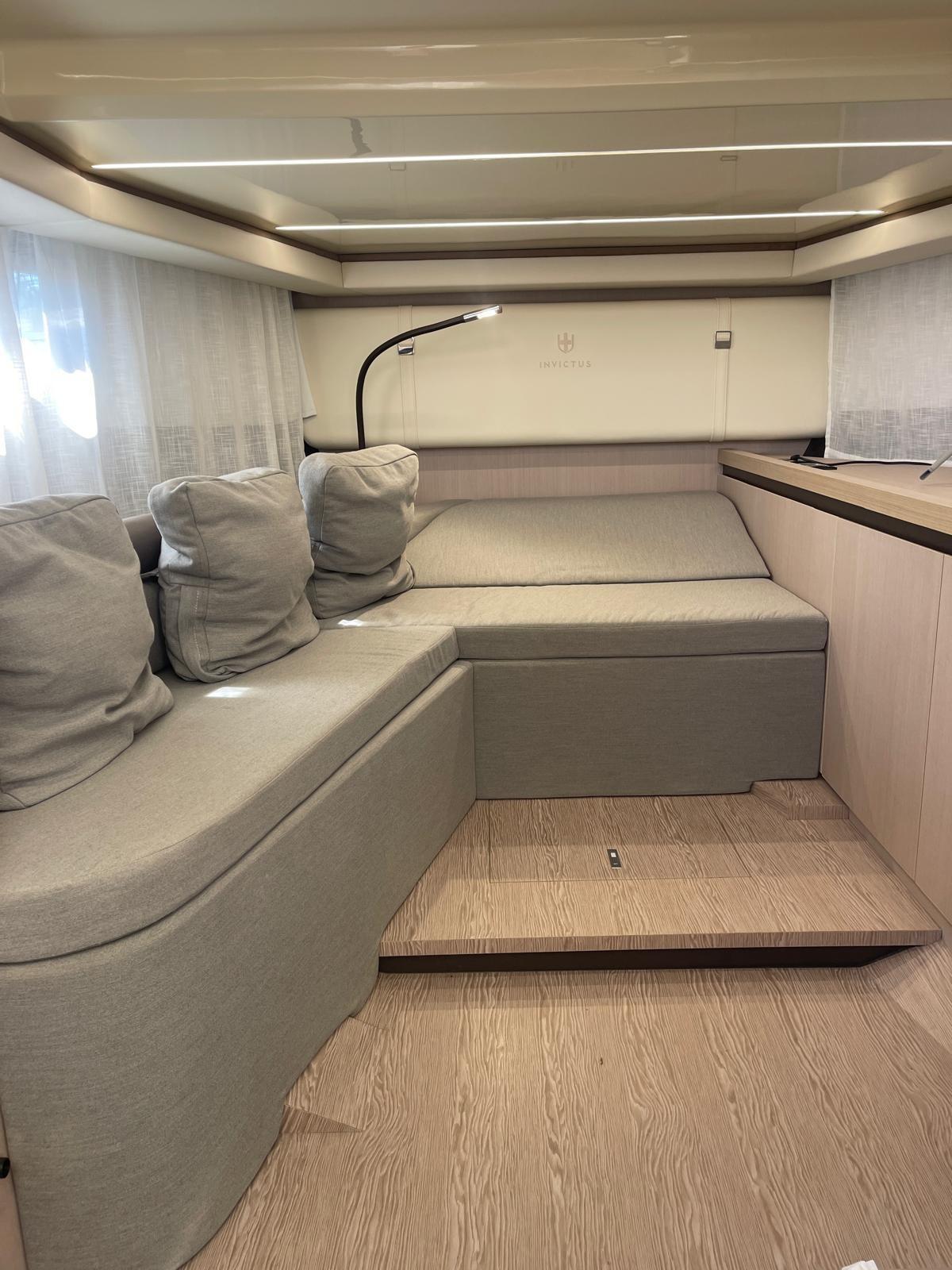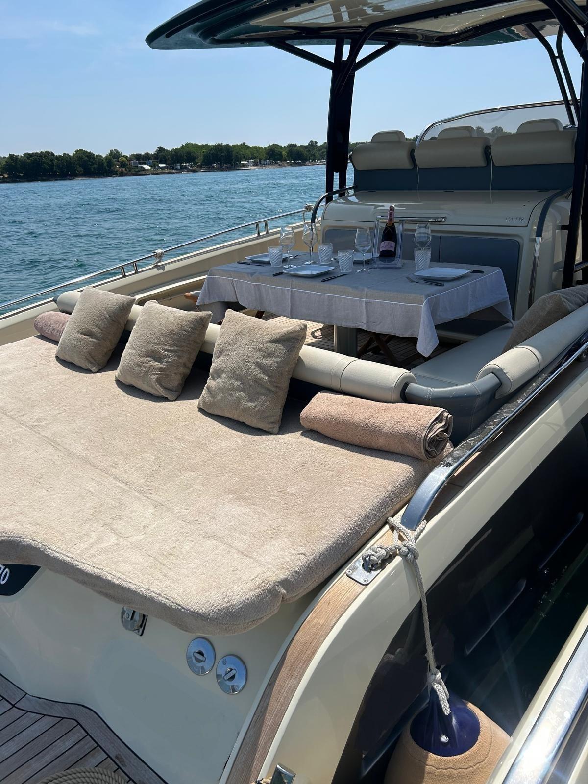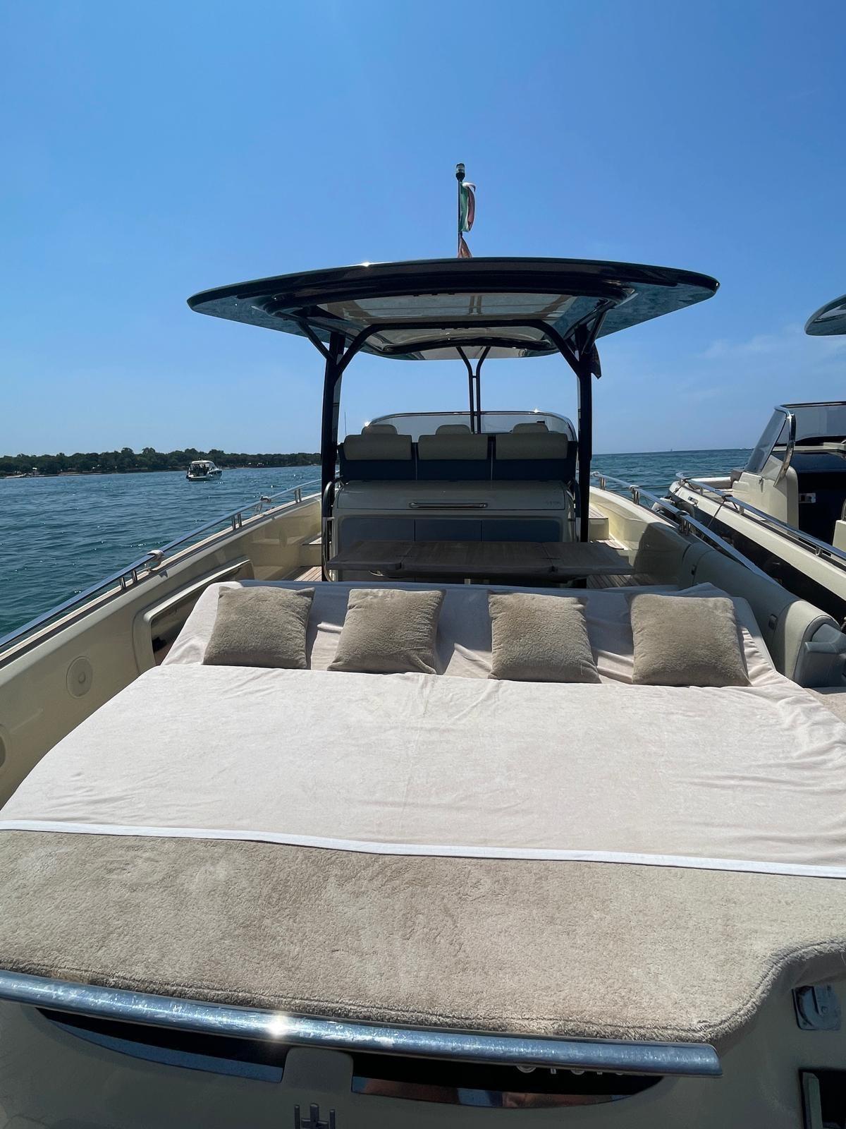 Alarme moteur, Alarme de pompe de cale, Alternateur, Eau sous pression, Câble d’alimentation à quai, Couleur spéciale (SPECTRUM BLUE), Douche de cockpit, Flaps électriques, Extincteur(s) fixe(s), Lavabo dans le cockpit, Éclairage de courtoisie, Spots sous-marins, Passerelle, Plateforme arrière, Pompe de cale automatique, Pompe de cale manuelle, Porte latérale, Cockpit en teck, Prise de quai, Guindeau électrique, Echelle de bain, table de cockpit, Corne, T-Top (CARBONIO).