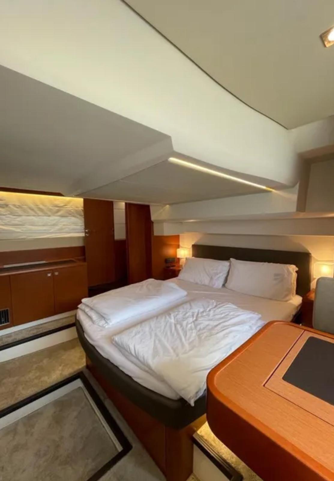 Alarme moteur, Alarme de pompe de cale, Alternateur, Eau sous pression, Couleur spéciale (BRONZO), Douche de cockpit, Phare de poursuite, Flaps électriques, Hard top, Extincteur(s) fixe(s), Éclairage de courtoisie, Spots sous-marins, Passerelle, Plateforme arrière, Pompe de cale automatique, Pompe de cale manuelle, Pont en teck, Porte latérale, Cockpit en teck, Prise de quai, Guindeau électrique, Echelle de bain, table de cockpit, Filières avec sortie latèrale, Corne.