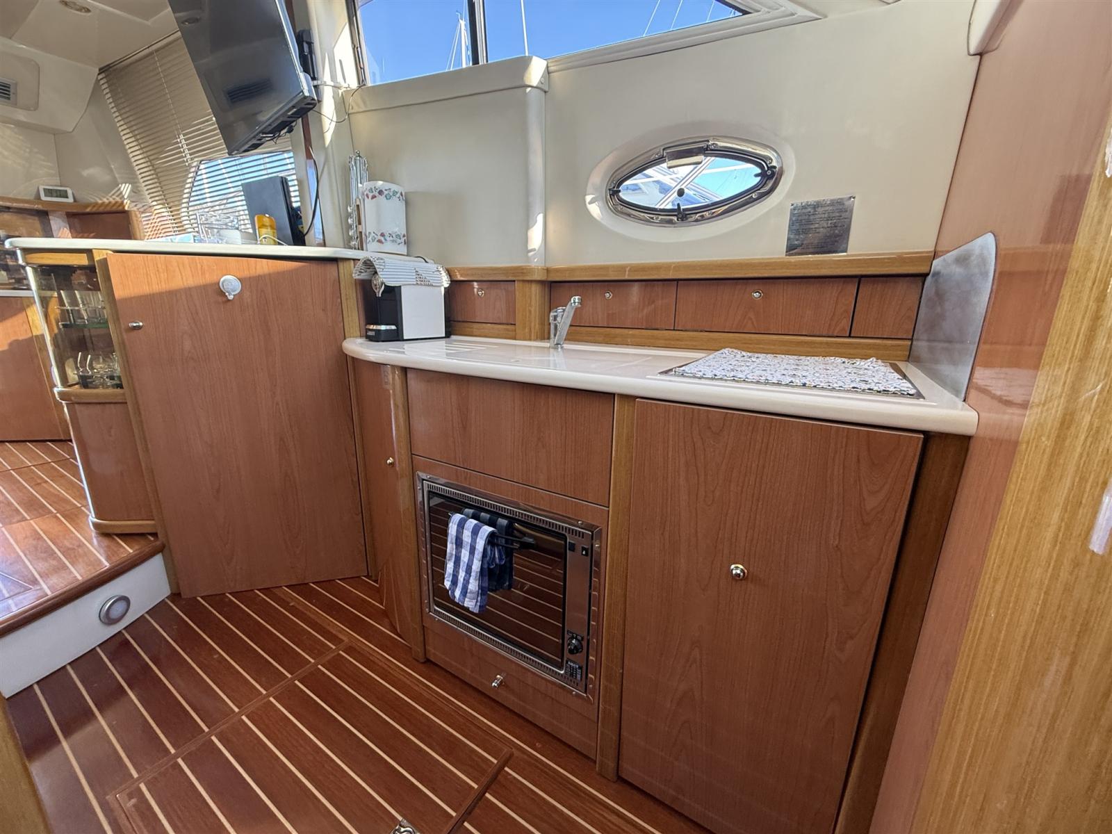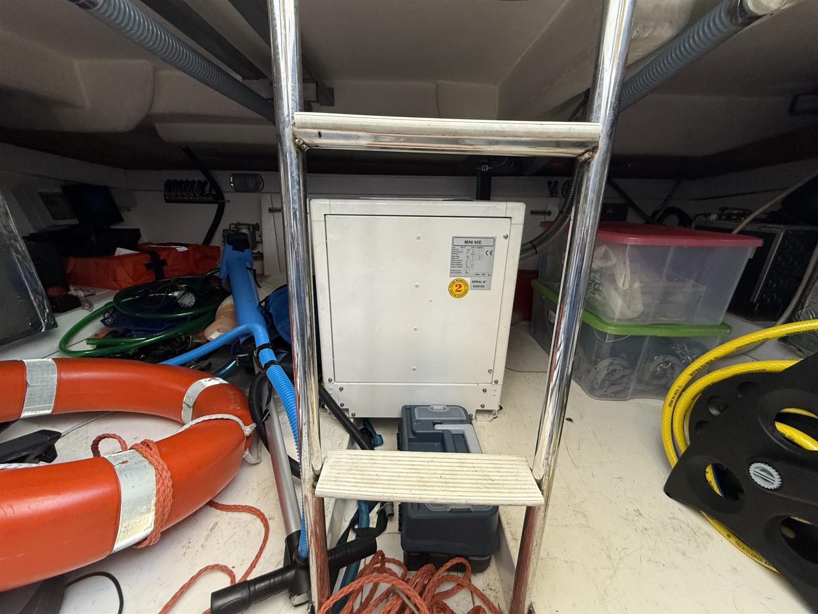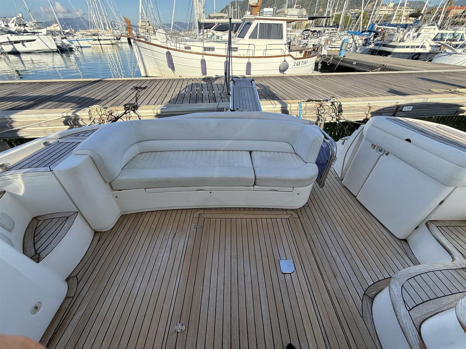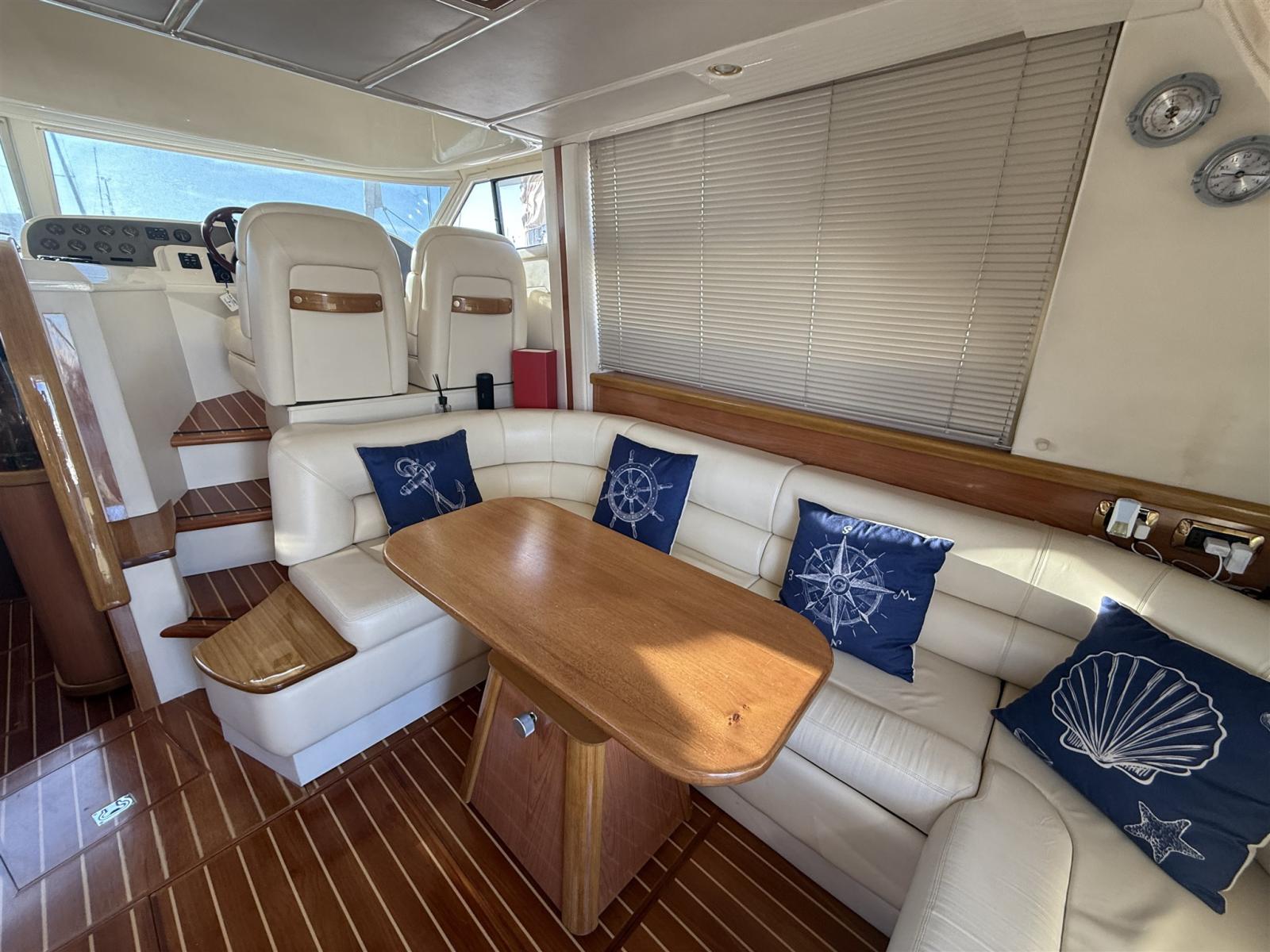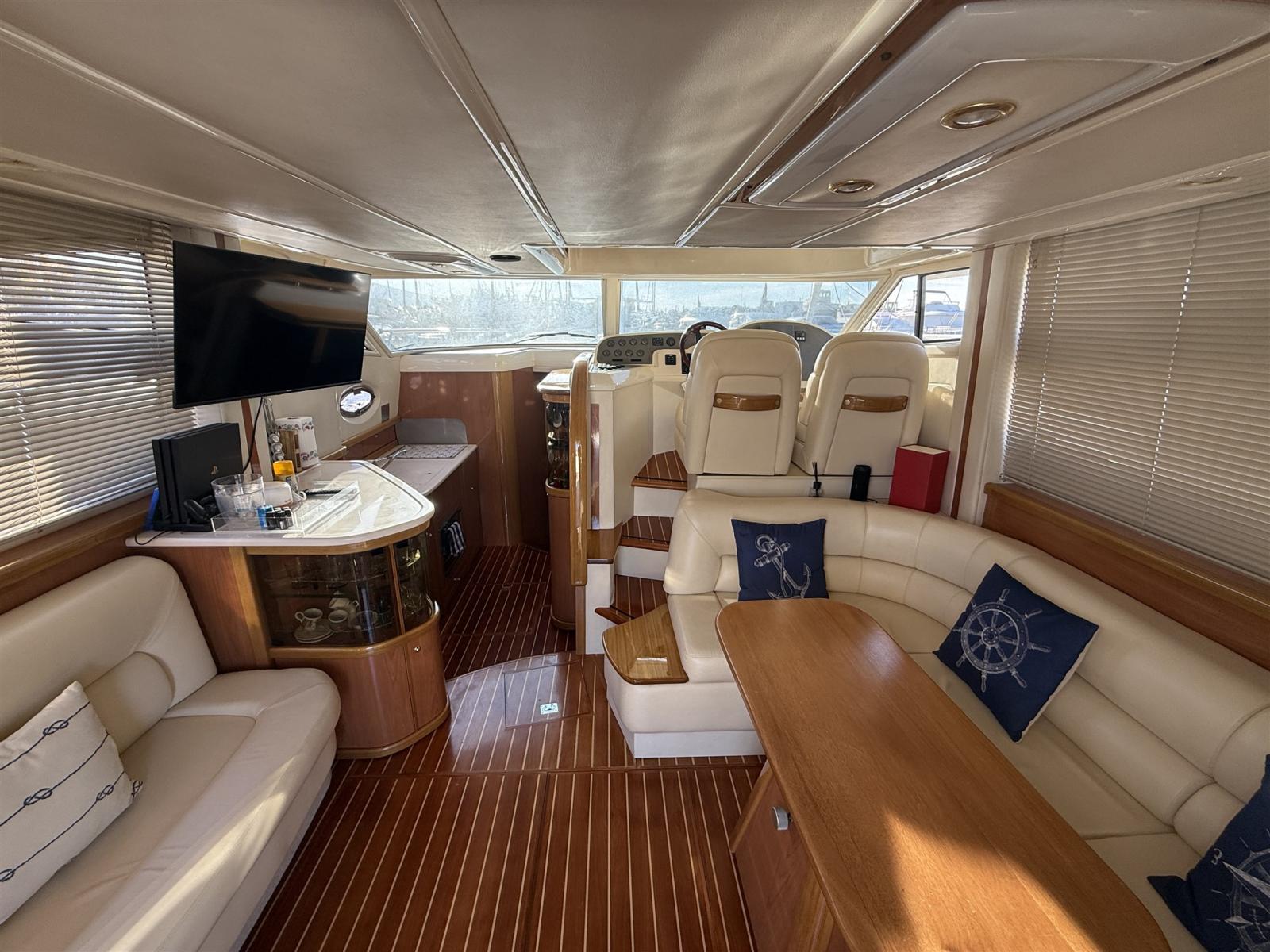 Alarme moteur, Alarme de pompe de cale, Alternateur, Eau sous pression, Câble d’alimentation à quai, Filères, Douche de cockpit, Double barre à roue, Phare de poursuite, Flaps électriques, Extincteur(s) fixe(s), Indicateurs de flaps, Lavabo dans le cockpit, Éclairage de courtoisie, Spots sous-marins, Défenses, Passerelle, Plateforme arrière, Pompe de cale automatique, Pompe de cale manuelle, Porte latérale, Cockpit en teck, Prise de quai, Répétiteur électronique, Rollbar, Guindeau électrique, Echelle de bain, table de cockpit, Filières avec sortie latèrale, Corne.
