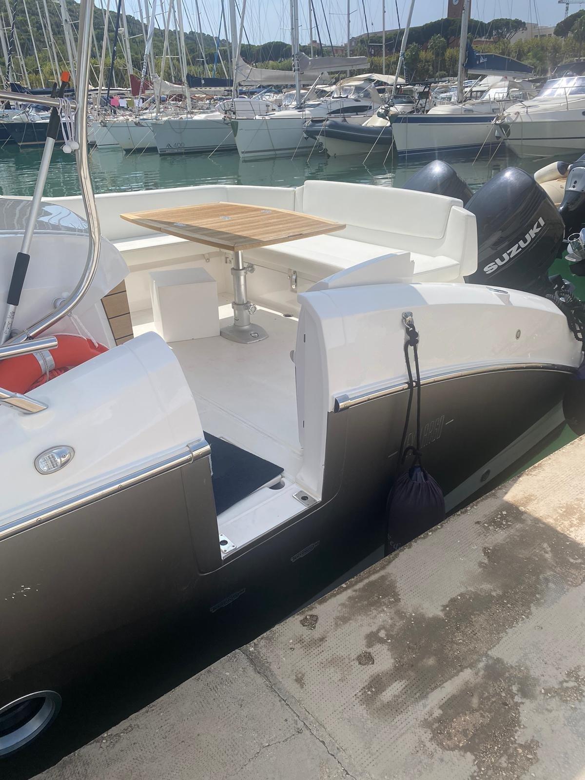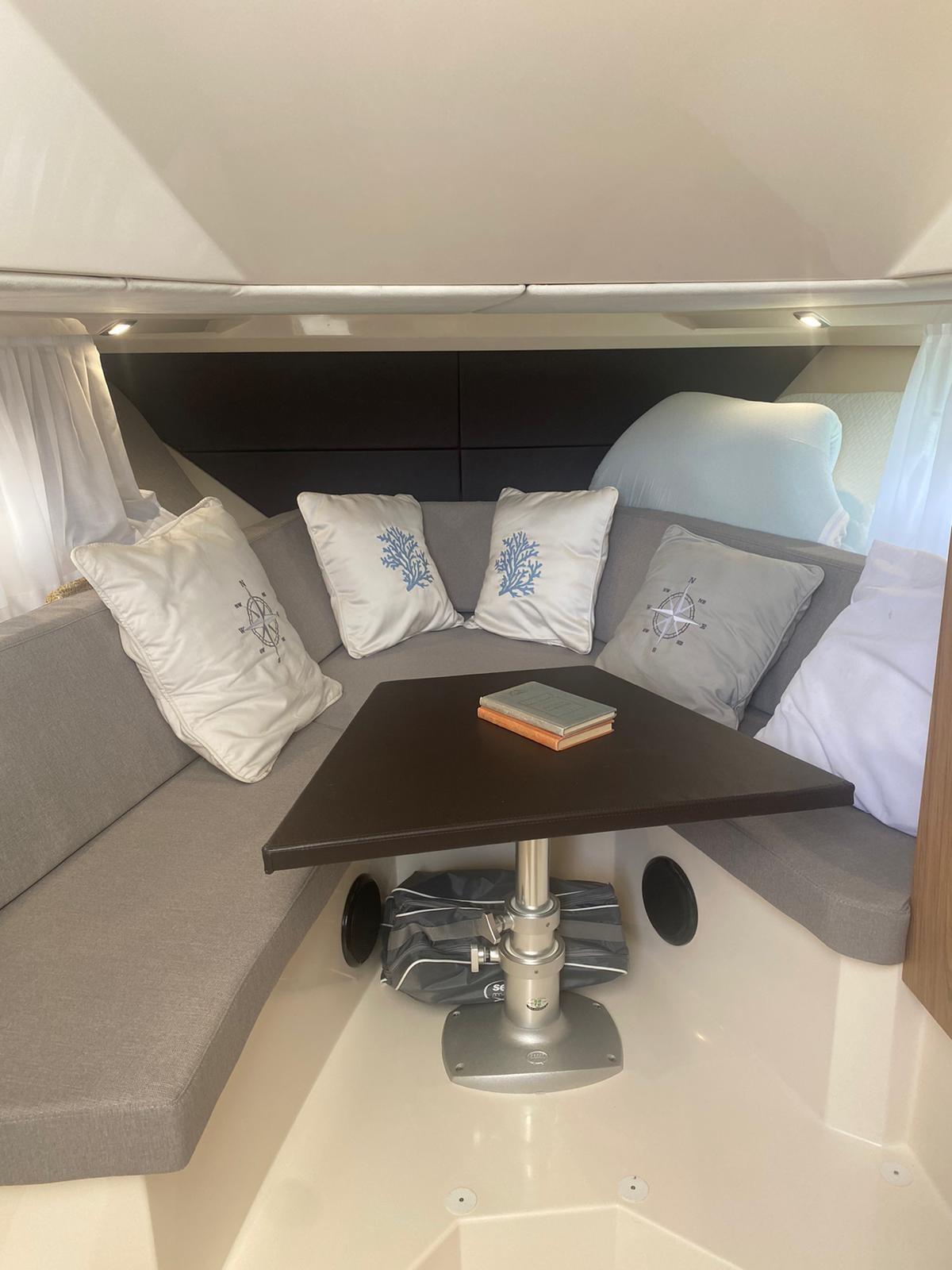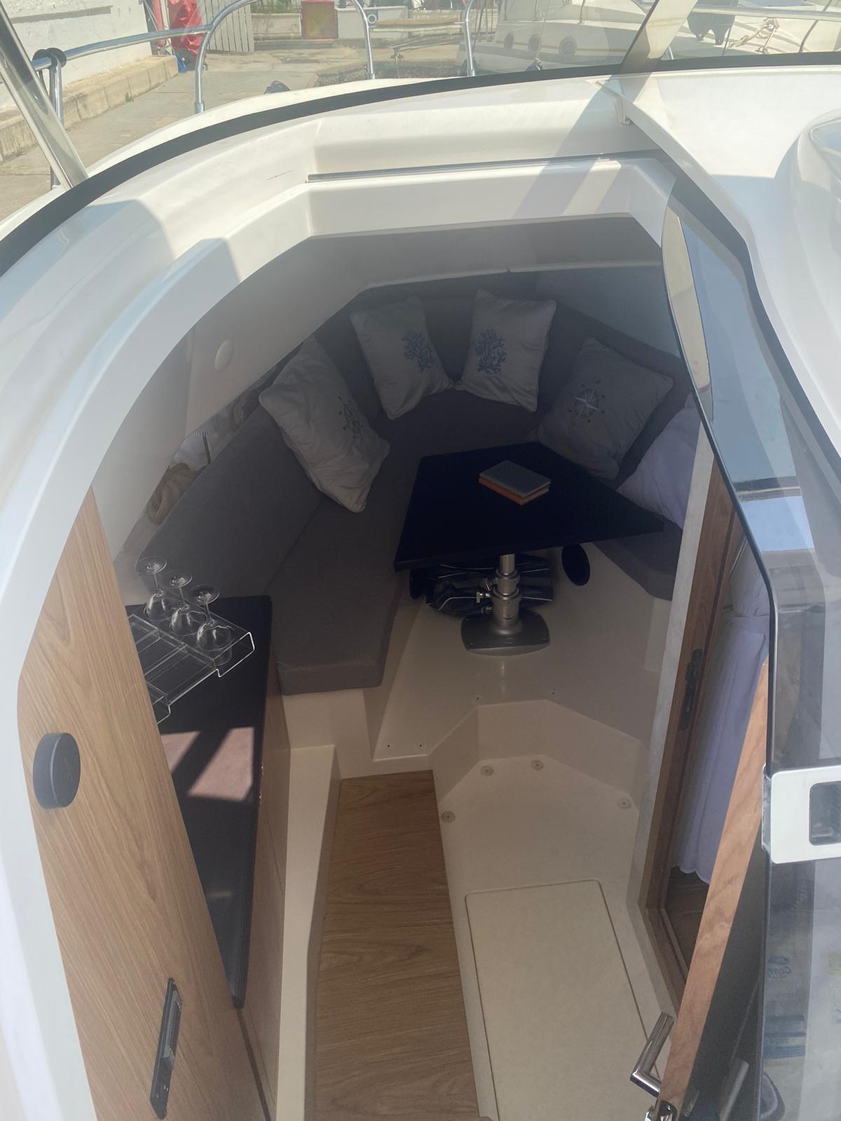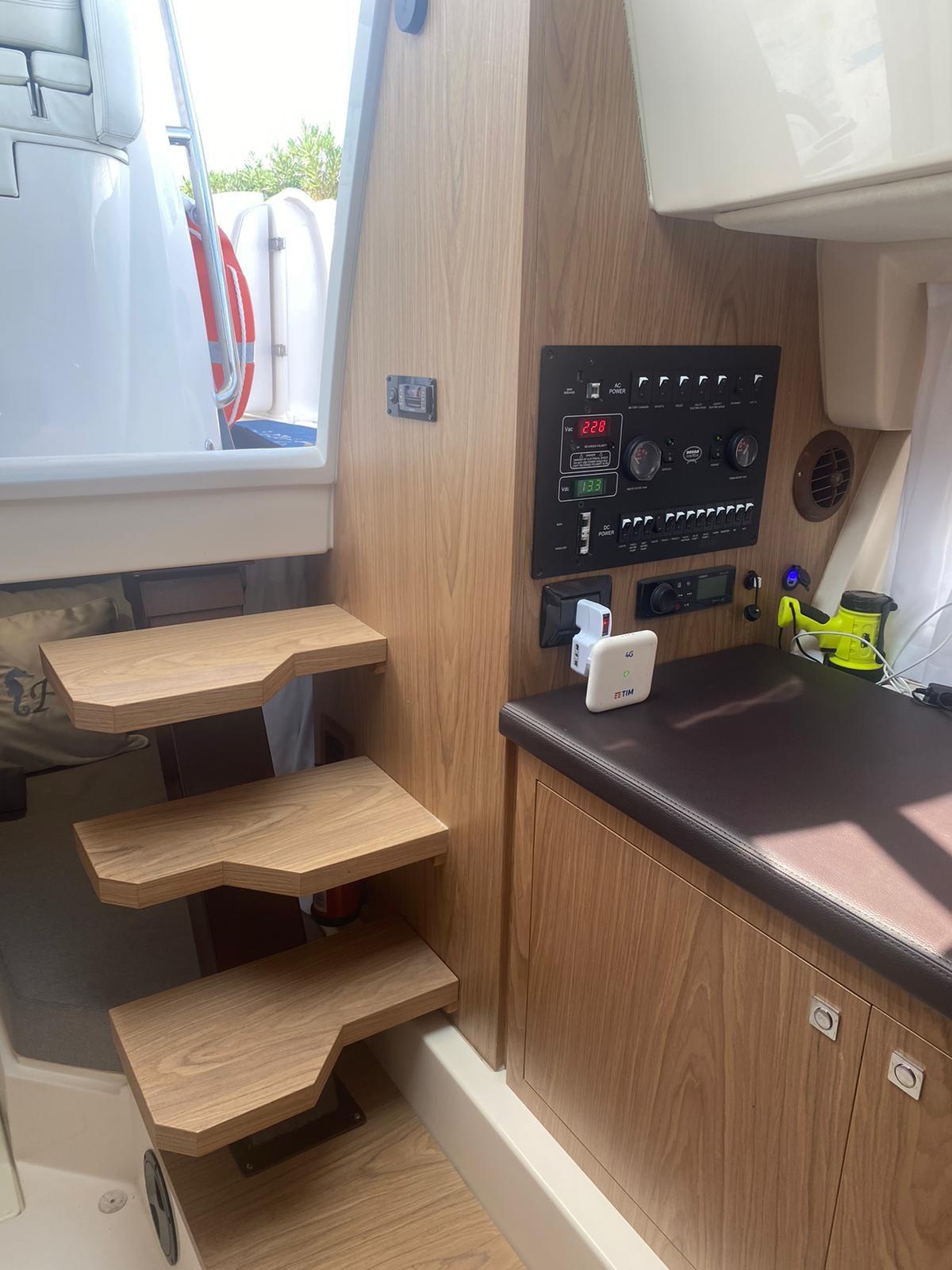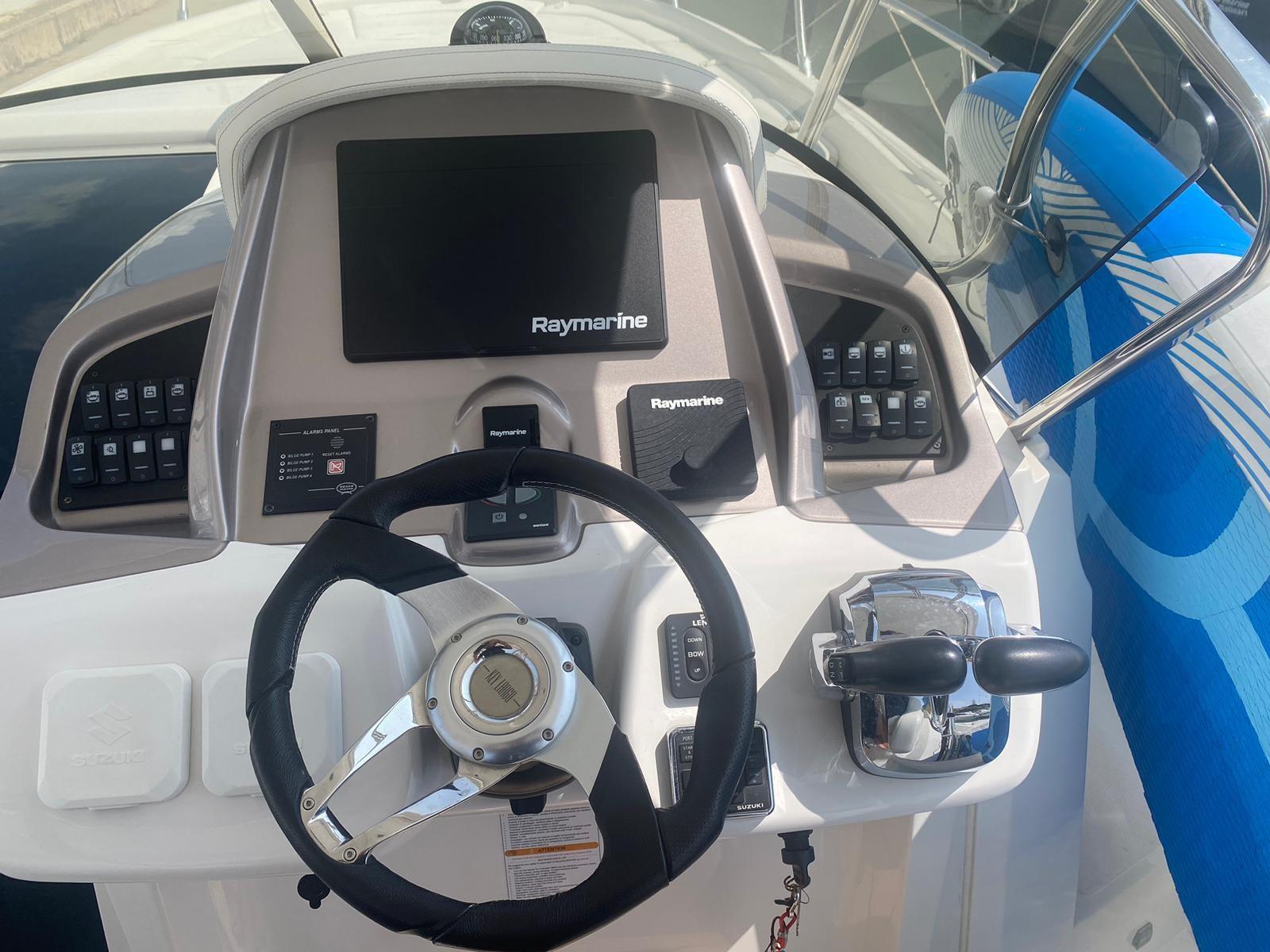 Alarme moteur, Alarme de pompe de cale, Eau sous pression, Couleur spéciale, Douche de cockpit, Flaps électriques, Extincteur(s) fixe(s), Lavabo dans le cockpit, Éclairage de courtoisie, Spots sous-marins, Pompe de cale automatique, Pompe de cale manuelle, Porte latérale, Prise de quai, Guindeau électrique, Echelle de bain, table de cockpit, Corne, T-Top.