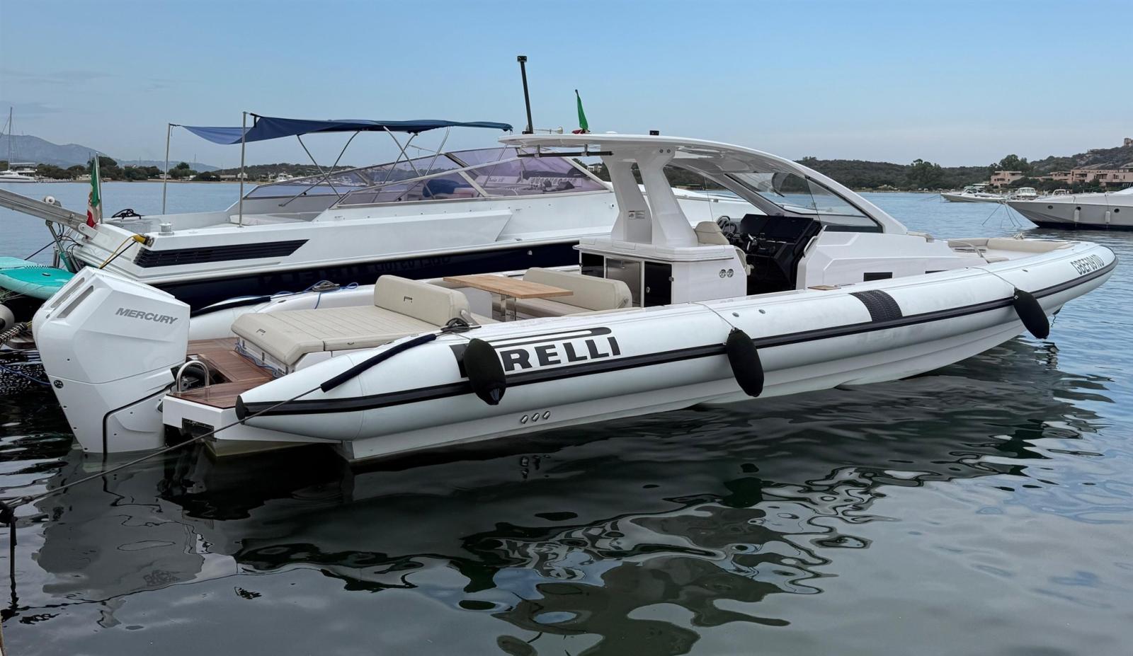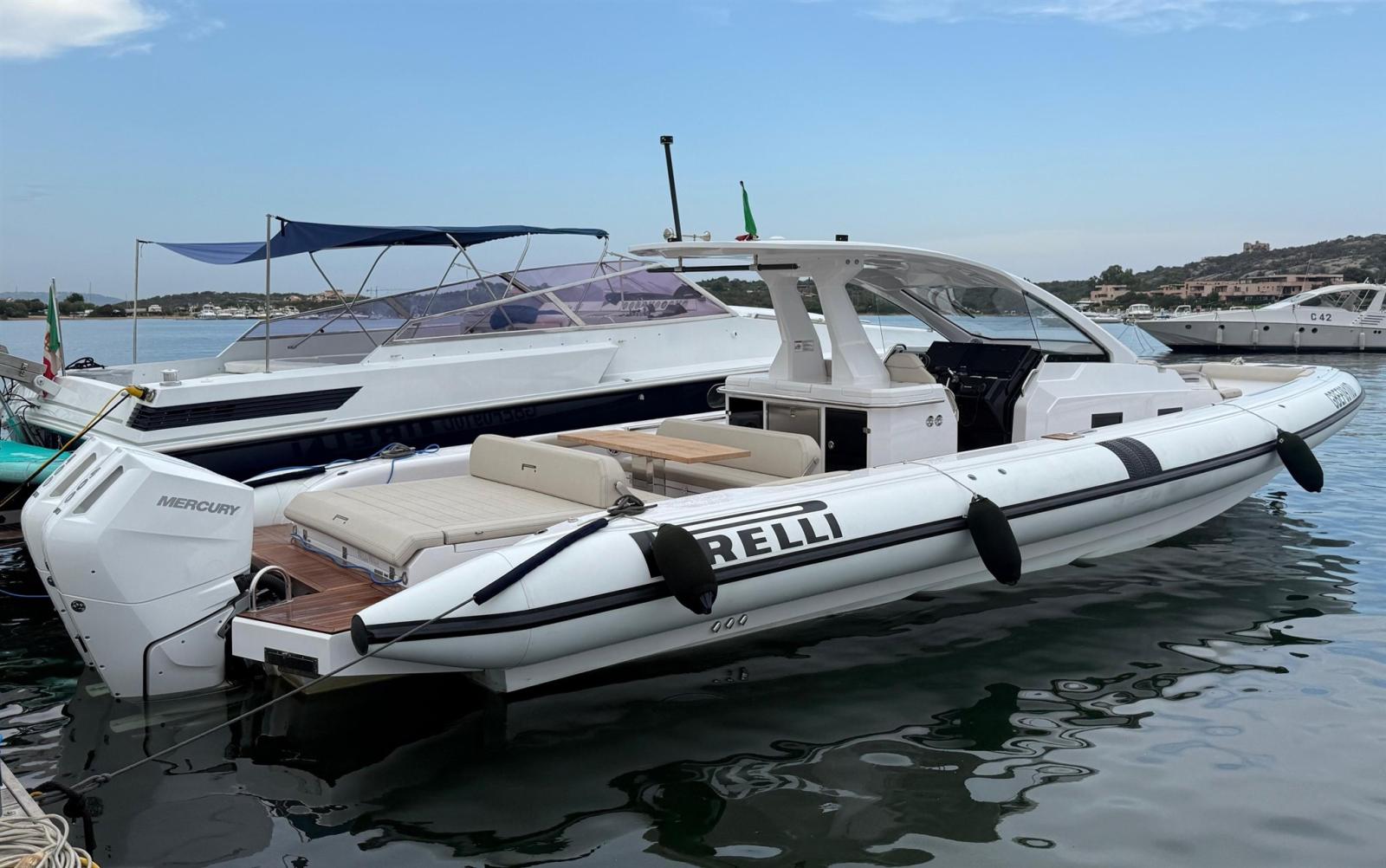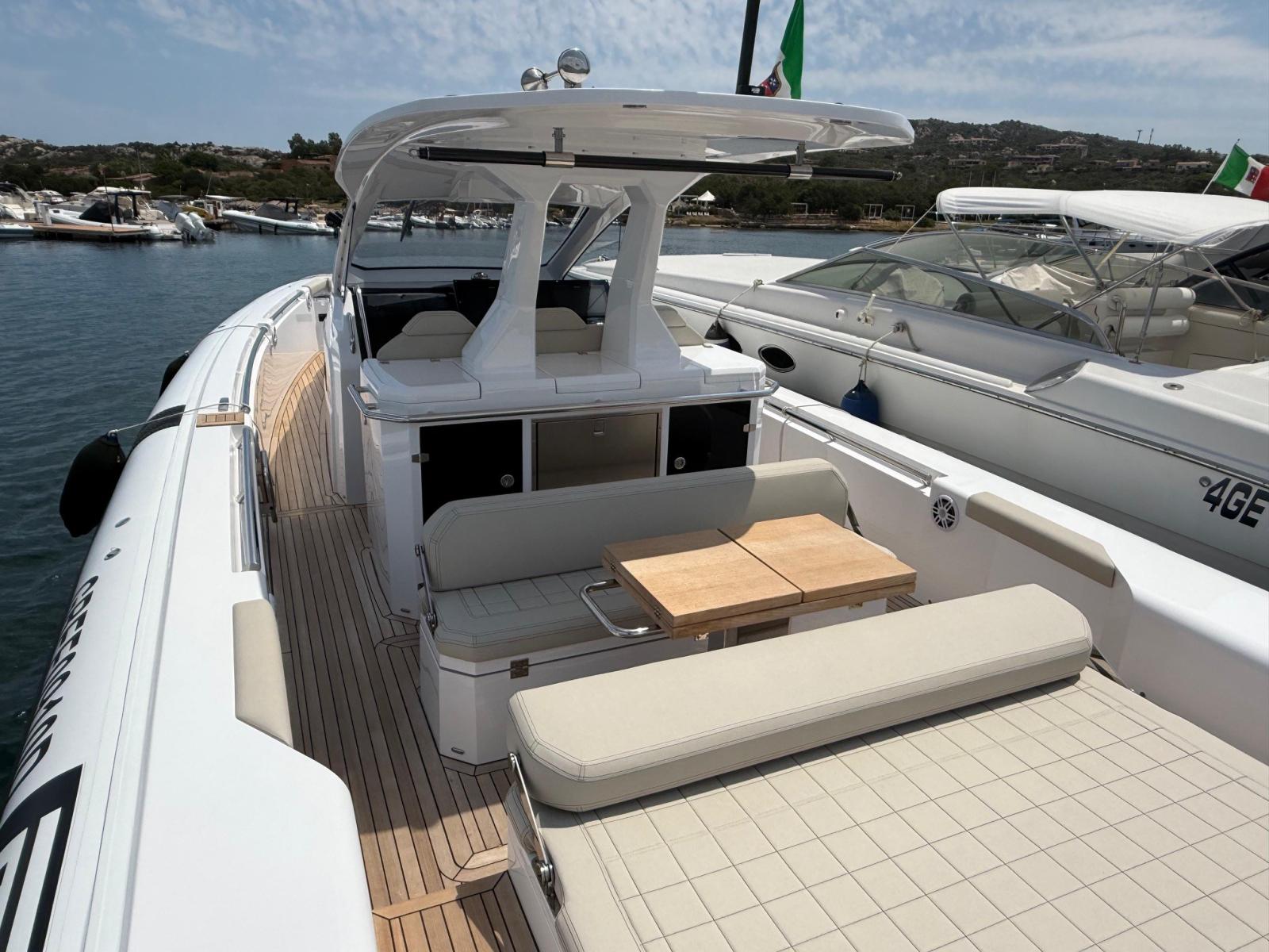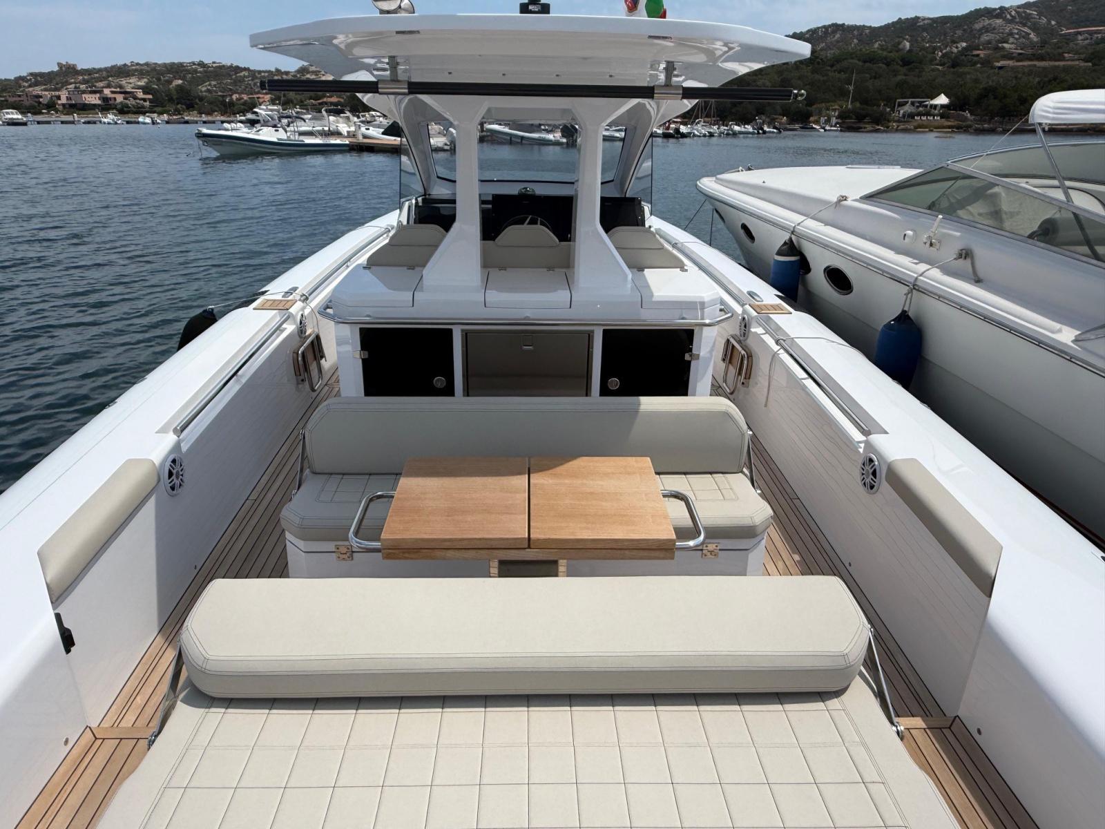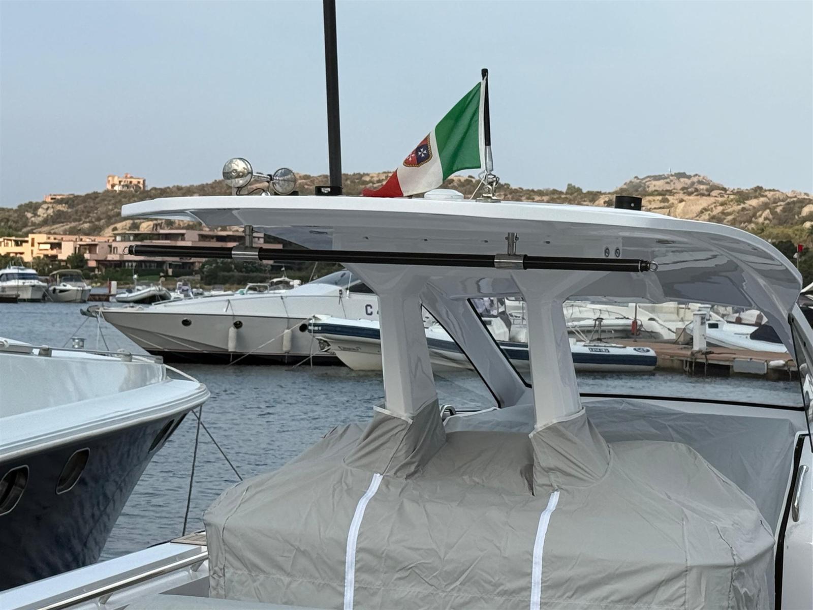 Alarme moteur, Alarme de pompe de cale, Alternateur, Ancre (e catena in inox), Eau sous pression, Taquets pliants, Passavant en teck, Câble d’alimentation à quai, Douche de cockpit, Lavabo dans le cockpit, Éclairage de courtoisie, Spots sous-marins, Plateforme arrière, Pompe de cale automatique, Pompe de cale manuelle, Pont en teck, Cockpit en teck, Prise de quai, Guindeau électrique, Echelle de bain (+ seconda scaletta aggiuntiva), table de cockpit, Corne, T-Top (con prolunga in carbonio).
