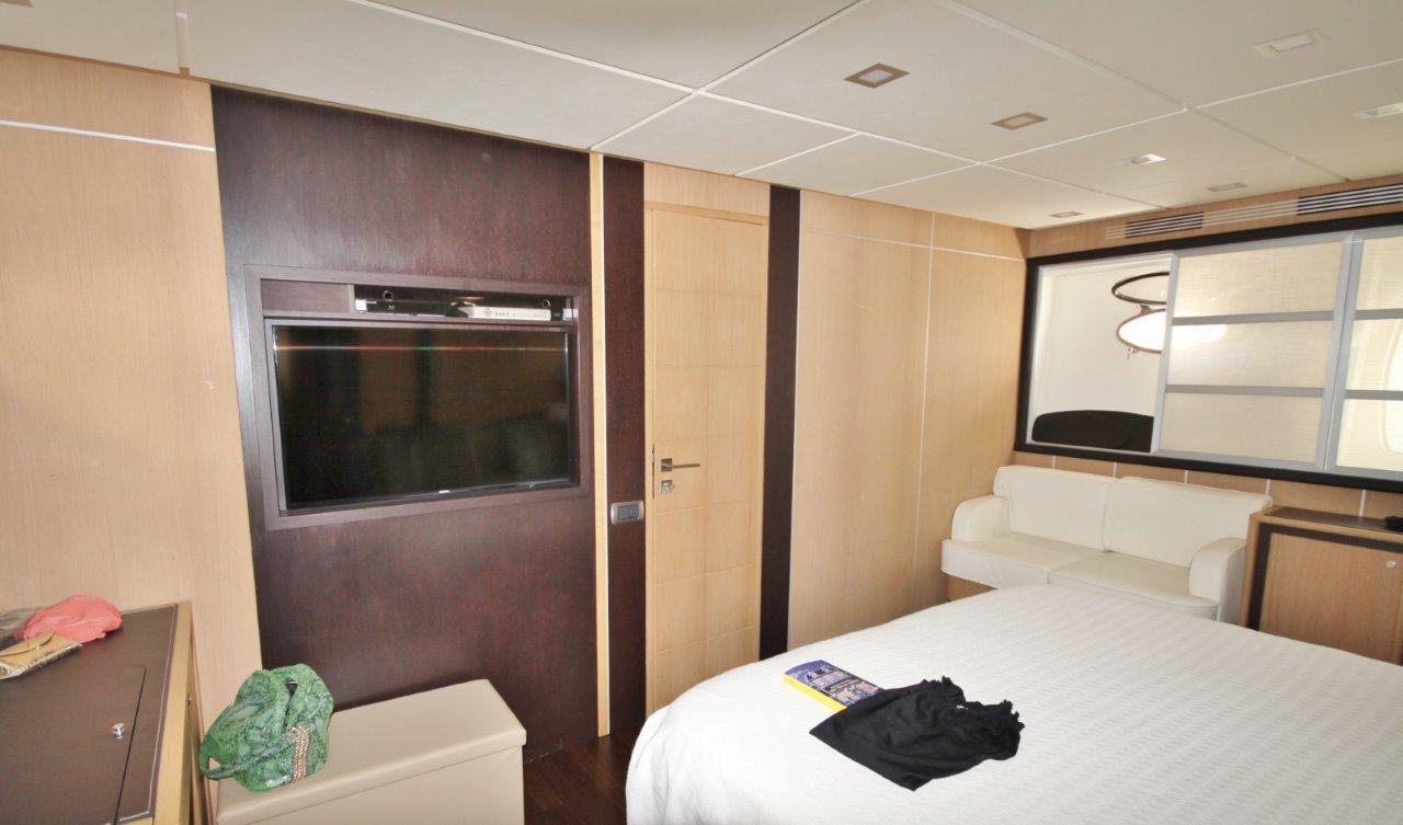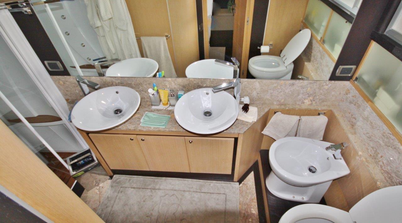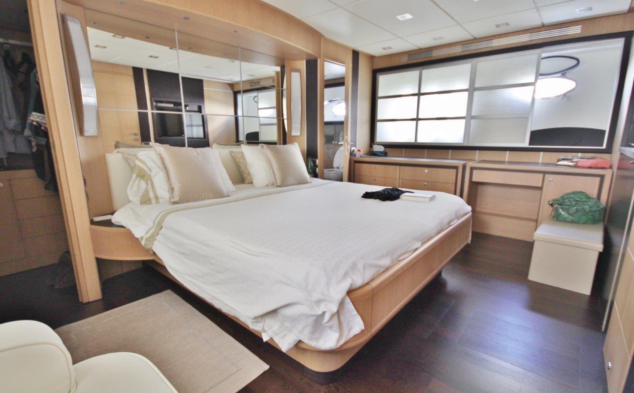 Le salon est disposé, comme il est maintenant d’usage sur les bateaux de ce type, sur deux niveaux, mais dans ce cas, un accent particulier a été mis sur le concept de séparer clairement l’espace de vie à l’arrière, la salle à manger dans la section centrale et la zone de commande à l’avant. La cuisine est très belle, en contact direct avec la salle à manger, ainsi qu’avec la zone de pilotage, positionnée au centre et enrichie par un canapé de service confortable et la porte d’accès à la passerelle extérieure tribord. L’espace nuit est compartimenté pour offrir quatre cabines confortables avec salles de bain privatives : VIP à l’avant, deux cabines invités à l’arrière de la cabine VIP (une avec des lits plats et une avec des lits superposés en forme de L) et enfin la suite propriétaire au milieu du navire. Suite au sens propre du terme, enrichie d’une salle de bain avec douche-jacuzzi, d’un dressing, d’un espace beauté et d’un confortable canapé pour deux avec table.