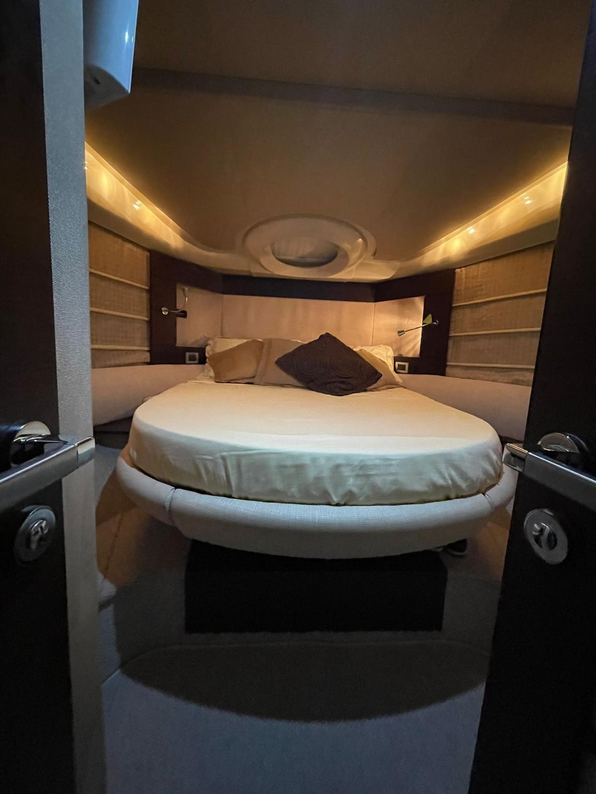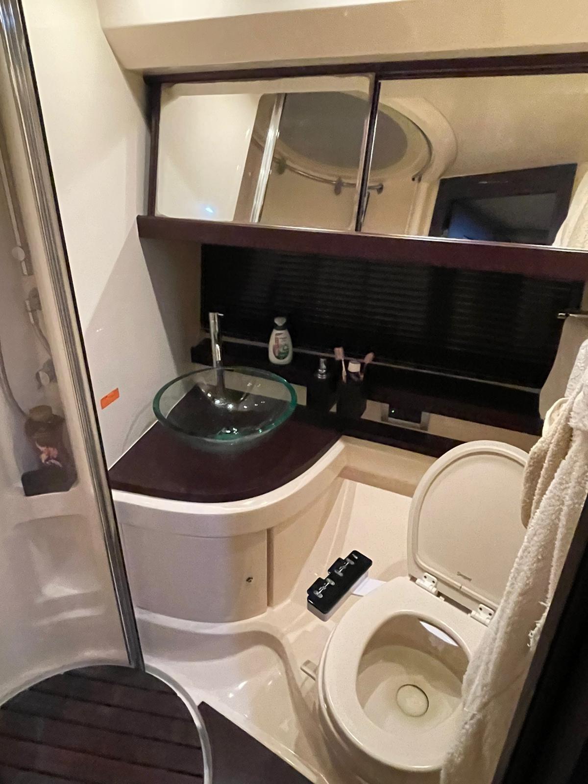 Cabine du propriétaire à l’avant avec fenêtres latérales et salle de bain attenante avec douche séparée.