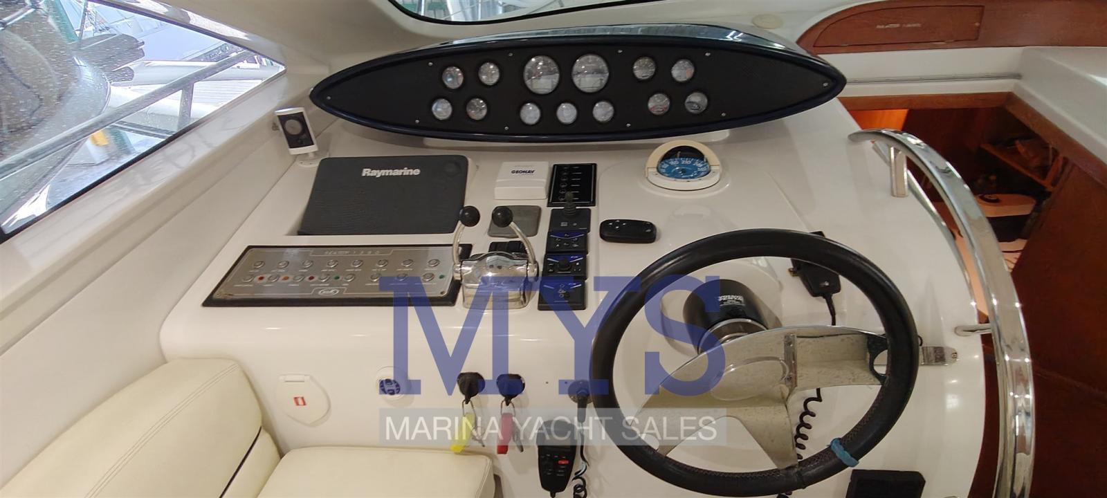 Alarme de pompe de cale, Ouverture du compartiment moteur électrique, Eau sous pression, Passavant en teck, Câble d’alimentation à quai, Filères, Douche de cockpit, Phare de poursuite, Flaps électriques, Garage à annexe, Hard top (apribile elettricamente), Indicateurs de flaps, Lavabo dans le cockpit, Éclairage de courtoisie (interne), Spots sous-marins, Passerelle (gandola), Plateforme arrière, Porte latérale, Cockpit en teck, Prise de quai, Connexion eau sous pression à quai, Guindeau électrique, Echelle de bain, table de cockpit, Table pliante de salon, Corne.