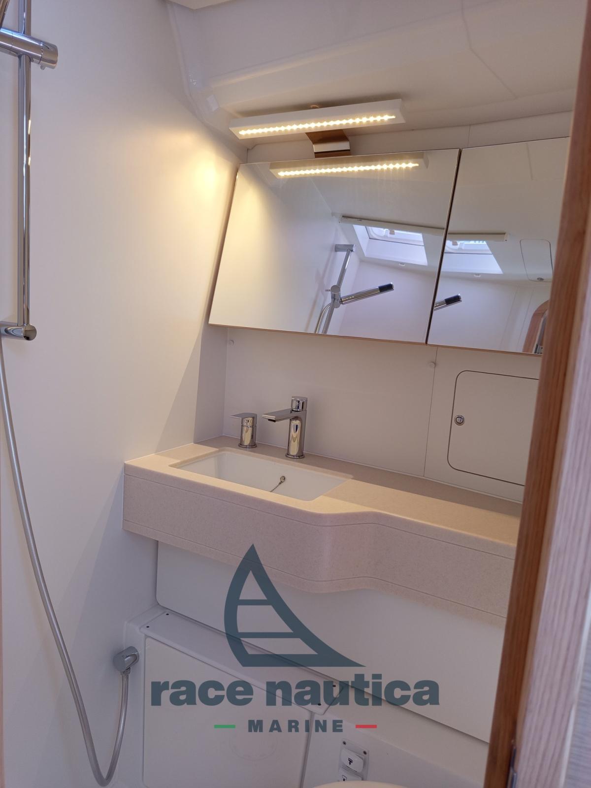 Version Comfort, intérieur en teck, quille courte (1,75 m), moteur Yanmar 80 ch Voile-Drive, hélice tunnel à proue, 2 treuils T50 à la poupe, 2 treuils T50 supplémentaires sur rail pour le système allemand avec écoute de grand-voile, chenilles + écoutes Gênes, Dacron genoa au lieu du foc auto-bordant, équipement Gennaker (drisses, écoutes et blocs) hors voile, système allemand pour écoute de grand-voile, Kit stéréo Bluetooth Fusion RA 70 avec 2 haut-parleurs dans le cockpit et 2 dans la salle à manger, barbecue à gaz à la poupe avec lavabo, hotte à pulvérisation avec rampes, ouverture assistée électriquement vers la plateforme arrière, échelle textile, poupe textile, douche sur la plateforme arrière, rampes recouvertes de cuir, coussins de cockpit avec dossiers, pilote automatique avec piston hydraulique, VHF V 60, traceur GPS Zeus 3 de 9" à gauche et à droite du tableau de bord, VHF V60-B avec émetteur et récepteur AIS intégrés, supplément pour mât avec grand-voile enroulable (pas pleine latte), treuil électrique T50 sur la maison de pont à gauche, sièges et plancher en bois naturel avec joints noirs, bimini pliable, coussins STD classiques, amélioration de la batterie AGM 280 AH, 2 toilettes électriques, commande du treuil à double ancre depuis le cockpit avec jauge de profondeur.